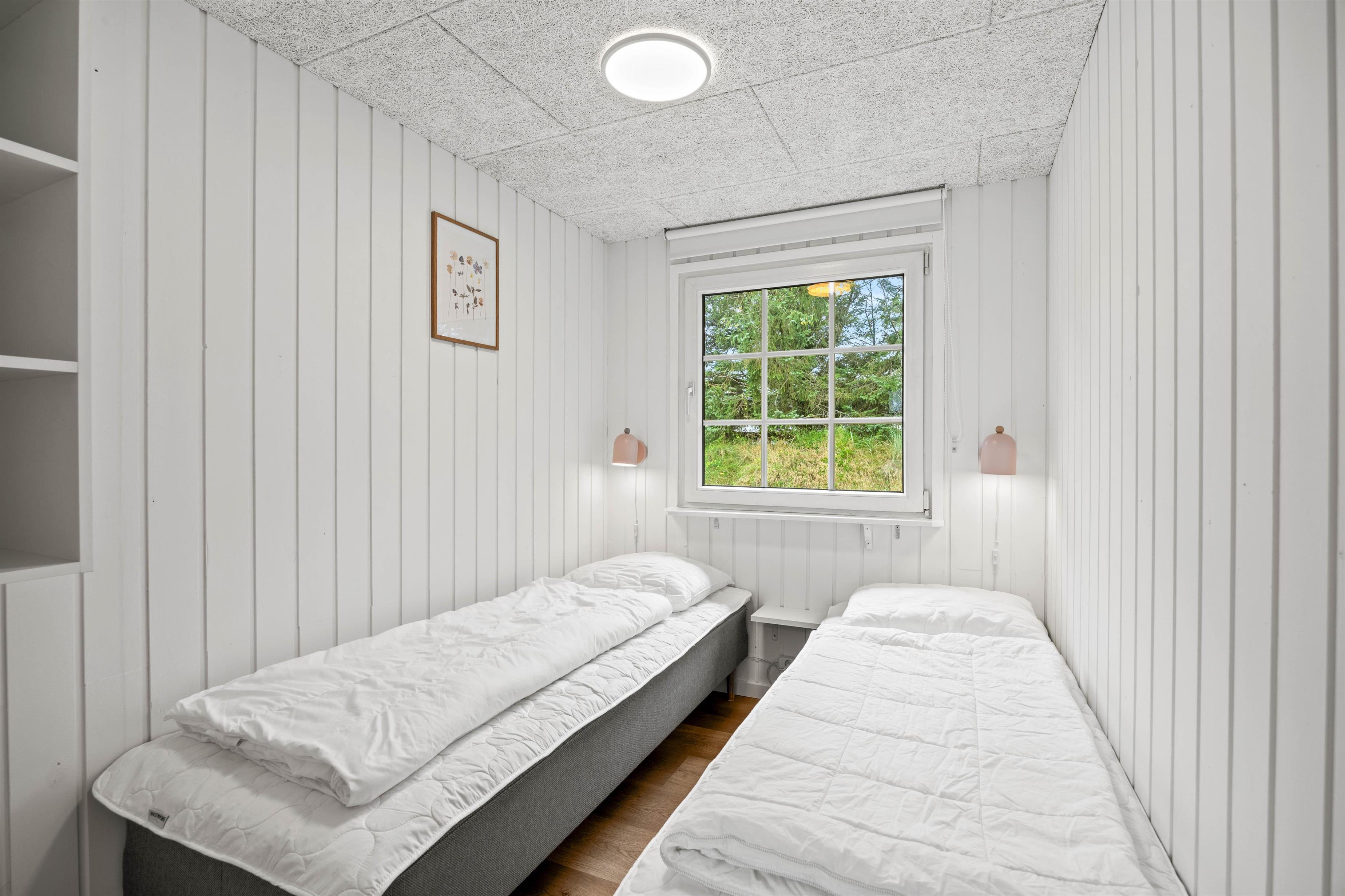 Badeværelset er enkelt indrettet med en bruser. To af de hyggelige soveværelser er udstyret med komfortable dobbeltsenge, mens det tredje soveværelse har to enkeltsenge, så alle gæster kan få en god nats søvn. Læg mærke til, at den friske vesterhavsluft gør noget godt for nattesøvnen.