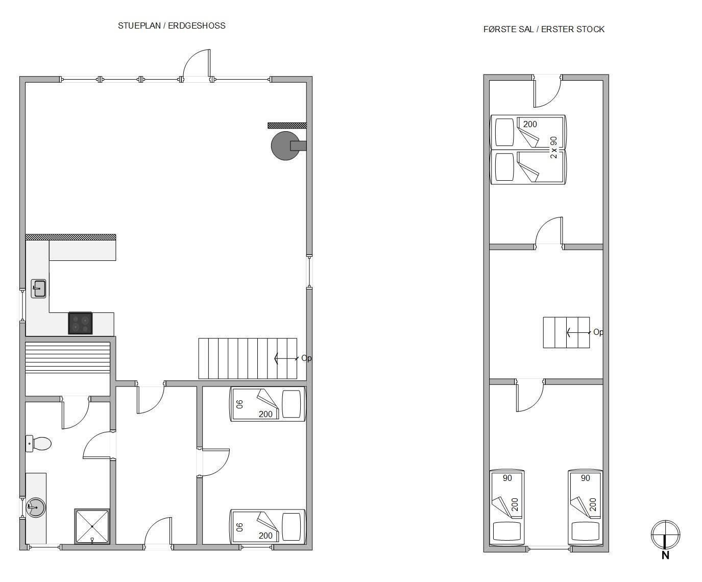 Sommerhuset er fordelt på 2 etager og rummer i alt 105 m². I stueetagen finder I opholdsrummet, et af soveværelserne samt badeværelset med bruseniche, vaskemaskine og gulvvarme. Herfra er der også adgang til saunaen, hvor I kan få varmen igen efter en tur langs stranden.