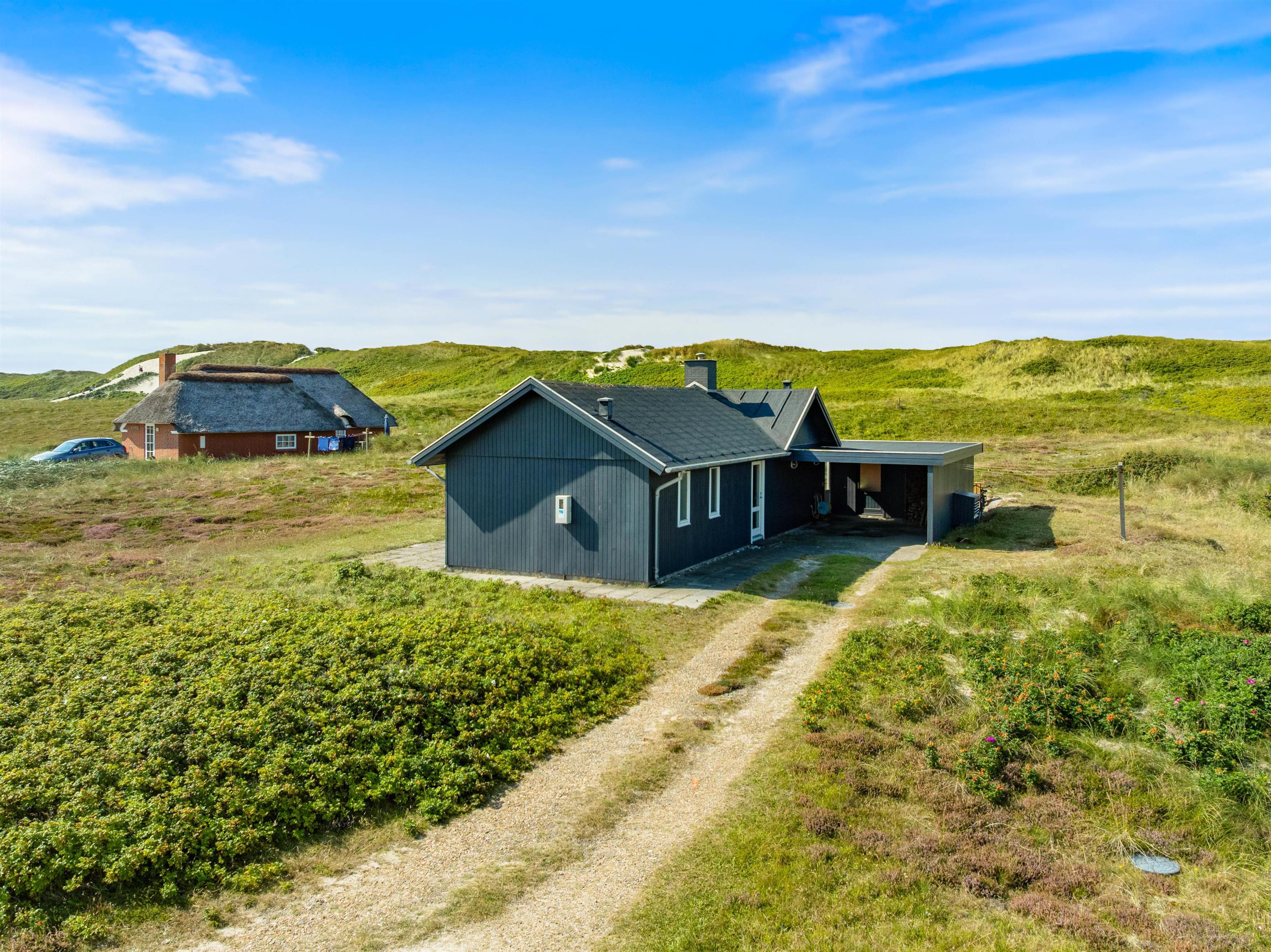 På feriehusets delvist afskærmede terrasse kan du finde en rolig plet til afslapning med en bog eller en kølig drink. Her er havemøbler, solvogne og parasol, så skulle I få lyst til en grillaften i den nedgående sol, er det også en oplagt mulighed. På den 1.750 kvadratmeter store naturgrund kan I udforske Vestkystens særegne plante- og dyreliv, og slappe helt af.