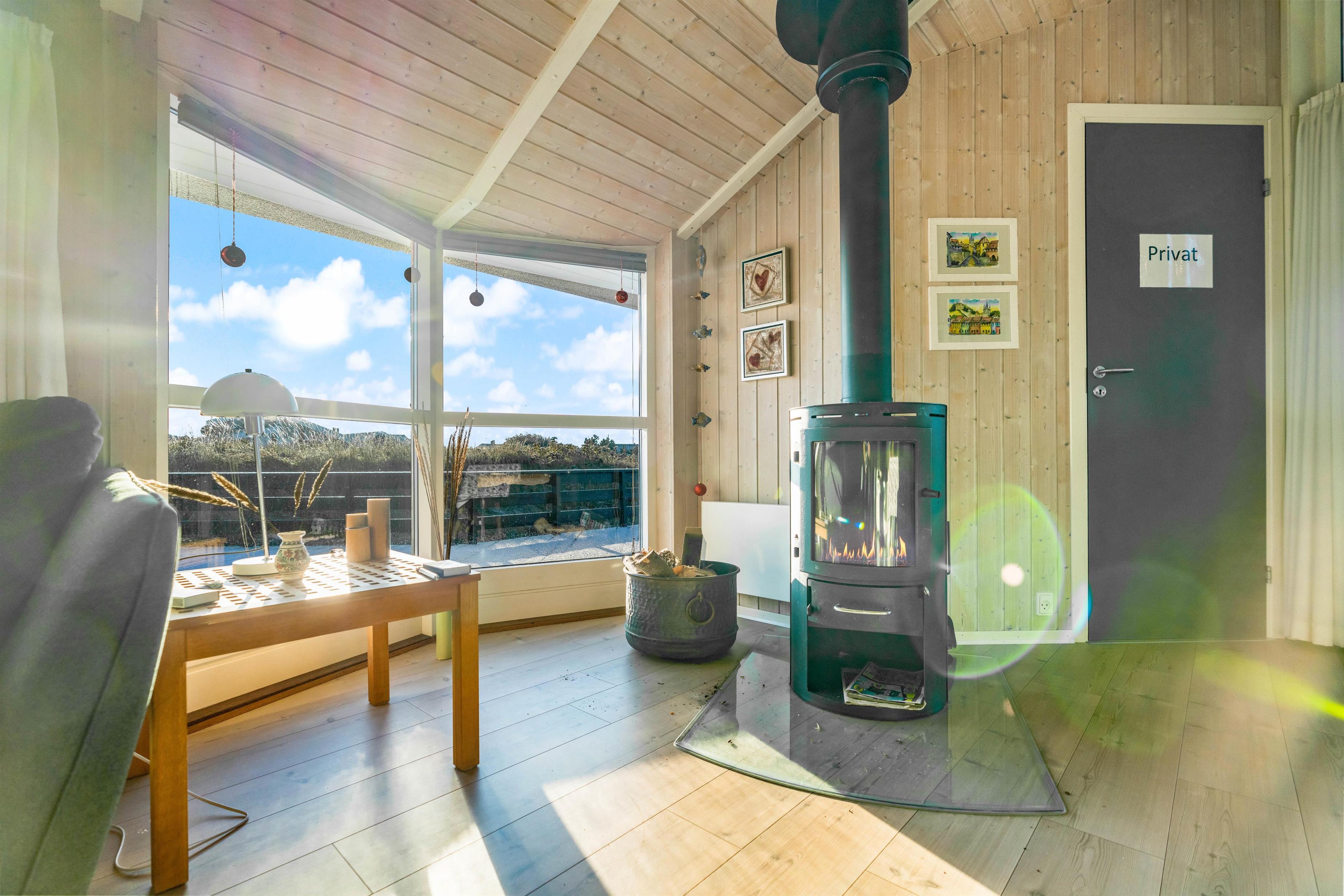 Bjerregårdsvej 302 er et klassisk skandinavisk feriehus med en helt særlig charme. Så snart man træder ind i feriehuset, mærker man starten på en dejlig ferie. I det rummelige opholdsrum finder du et hyggeligt og afslappende sofahjørne. Her kan du slappe af med en god bog eller en film og lytte til den knitrende pejs i baggrunden. Spisebordet indbyder derimod til hyggelige brætspilstimer sammen med hele familien.