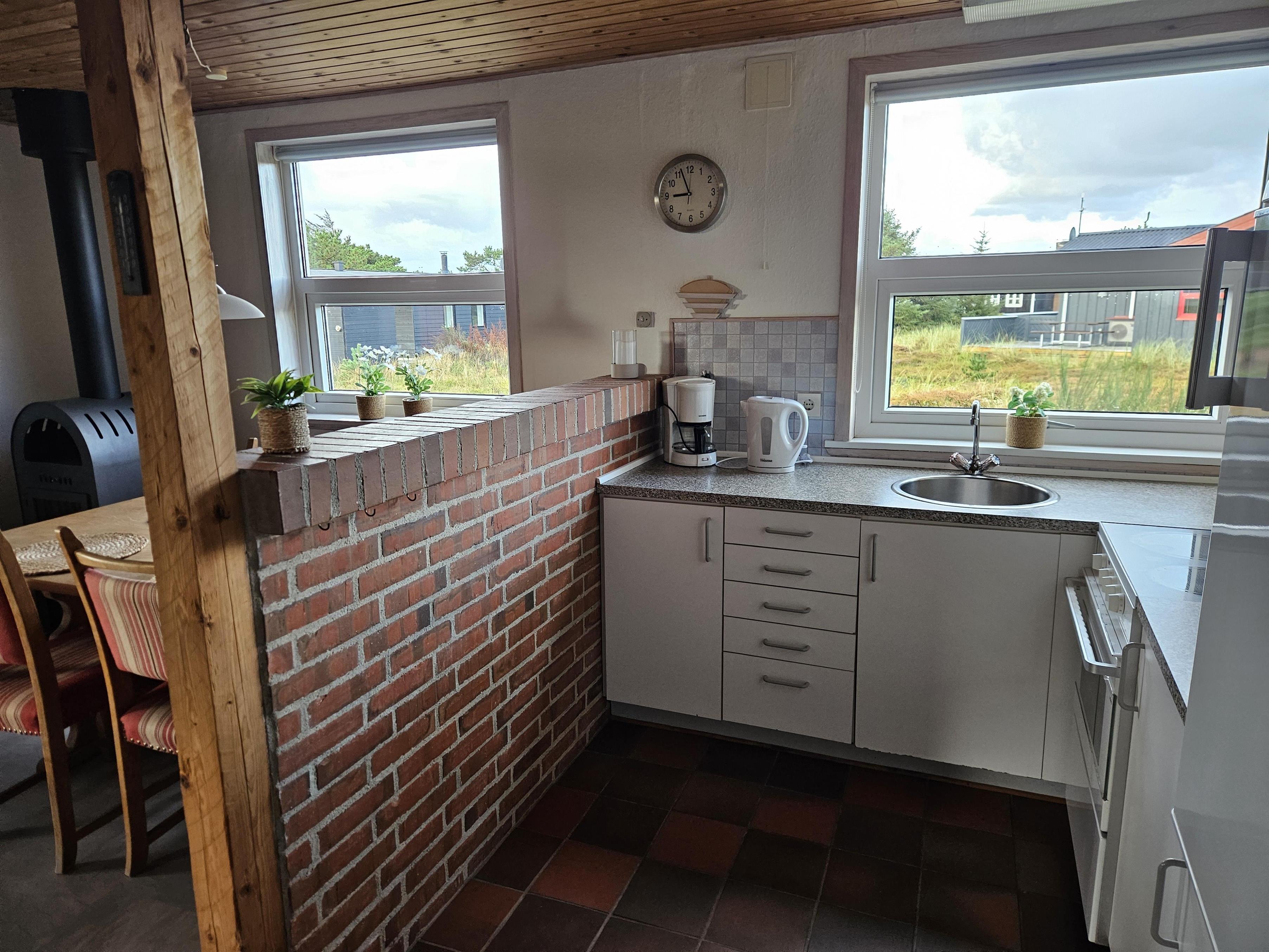 Udenfor er en delvist overdækket terrasse, hvor I kan nyde de varme sommerdage. Havemøbler, liggestole og gasgrill står klar til jer. Tilbered et lækkert måltid og saml familien – efterfulgt af en smuk aftentur ved stranden – dét er ægte sommerhusferie. Feriehuset er beliggende på en smuk klitgrund i et roligt område og med 1800 meter til nærmeste købmand. Her kan I hente frisk bagværk hver dag.