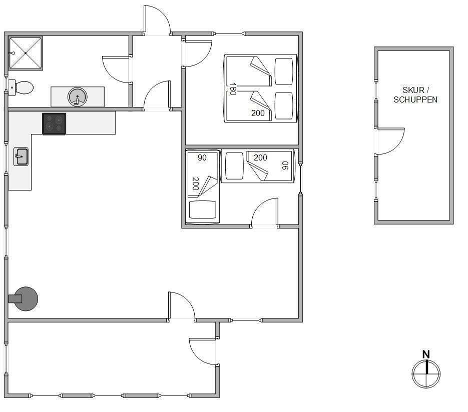 Hjerterummet er det åbne opholdsrum, hvor brændeovnens varme breder sig. Køkkenet er udstyret med både induktionskomfur, separat fryser samt opvaskemaskine, så madlavningen bliver til en leg. Saml familien til sofahygge, om lækre retter ved spisebordet og meget mere – alt imens brændeovnen knitrer i baggrunden. Den energibesparende varmepumpe sørger for et behageligt indeklima året rundt. Her er 2 fine soveværelser, et lille fint badeværelse med brus og gulvvarme, samt vaskemaskine og tørretumbler.