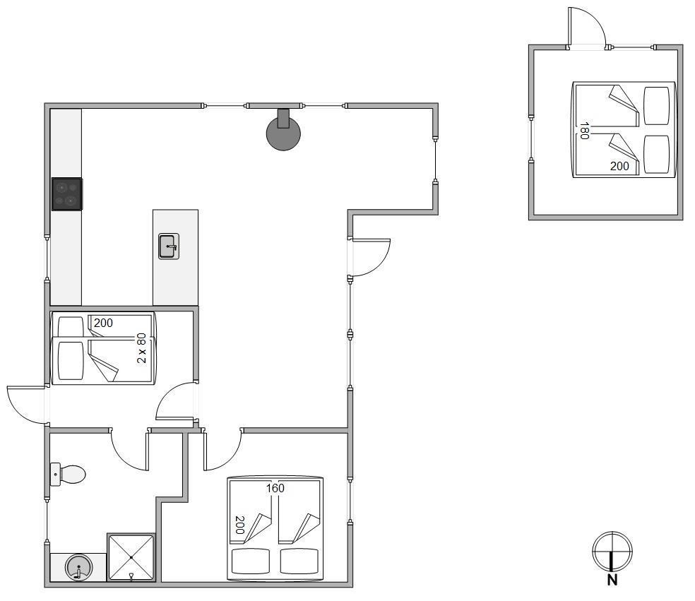 På de 63 velindrettede kvadratmeter finder du også et moderne badeværelse med dagslys og gulvvarme, et hyggeligt soveværelse med dobbeltseng og et soveværelse med køjesenge. Det sidste soveværelse, som også har en komfortabel dobbeltseng, ligger i det rummelige anneks. Der er barneseng og højstol til de små.