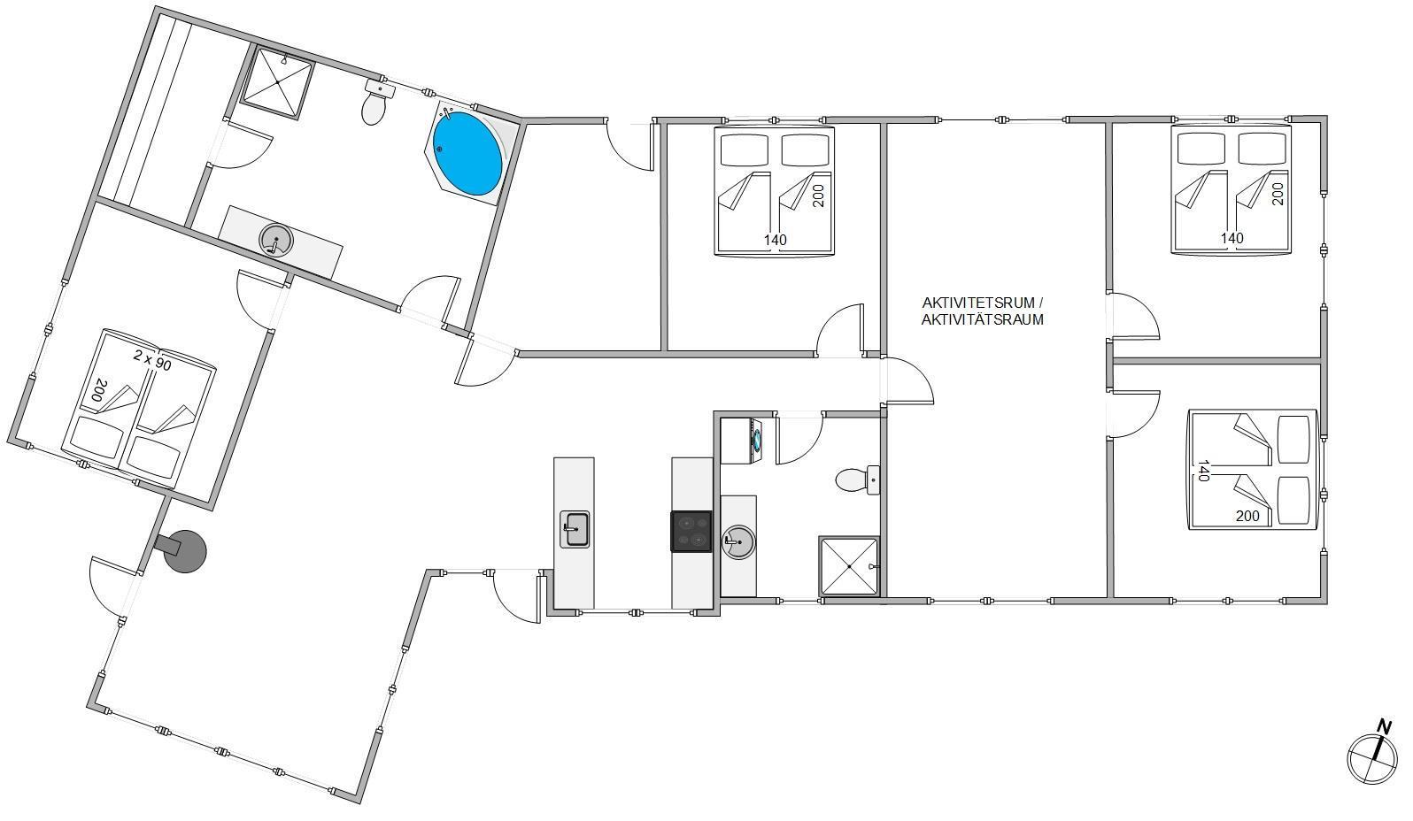 Midt i Bjerregårds populære ferieområde ligger dette skønne feriehus fra 2015. Med plads til 8 personer er feriehuset helt ideelt til en storslået familieferie, og med både sauna, spabad og aktivitetsrum er både store og små garanteret underholdning. Stranden ligger kun 200 meter væk, og den lokale købmand kan nås på gåben.