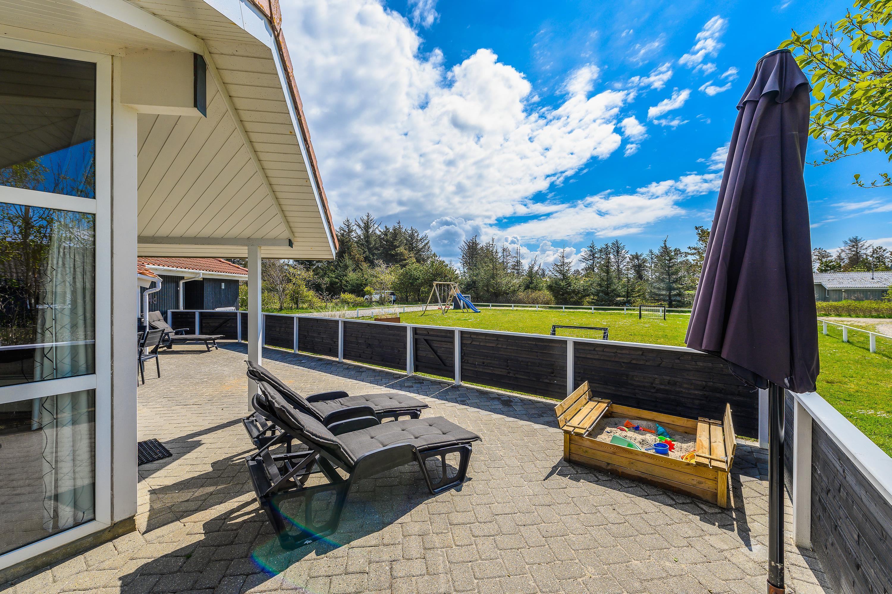 Den store lukkede terrasse vender mod sydvest – og I er således sikret solens stråler mest muligt. Slap af i liggestolene, mens børnene leger i sandkassen, gynger eller tager en tur på rutsjebanen. Plænen egner sig bestemt også til en omgang fodbold. Luk øjnene og bare nyd solen og den friske havluft.