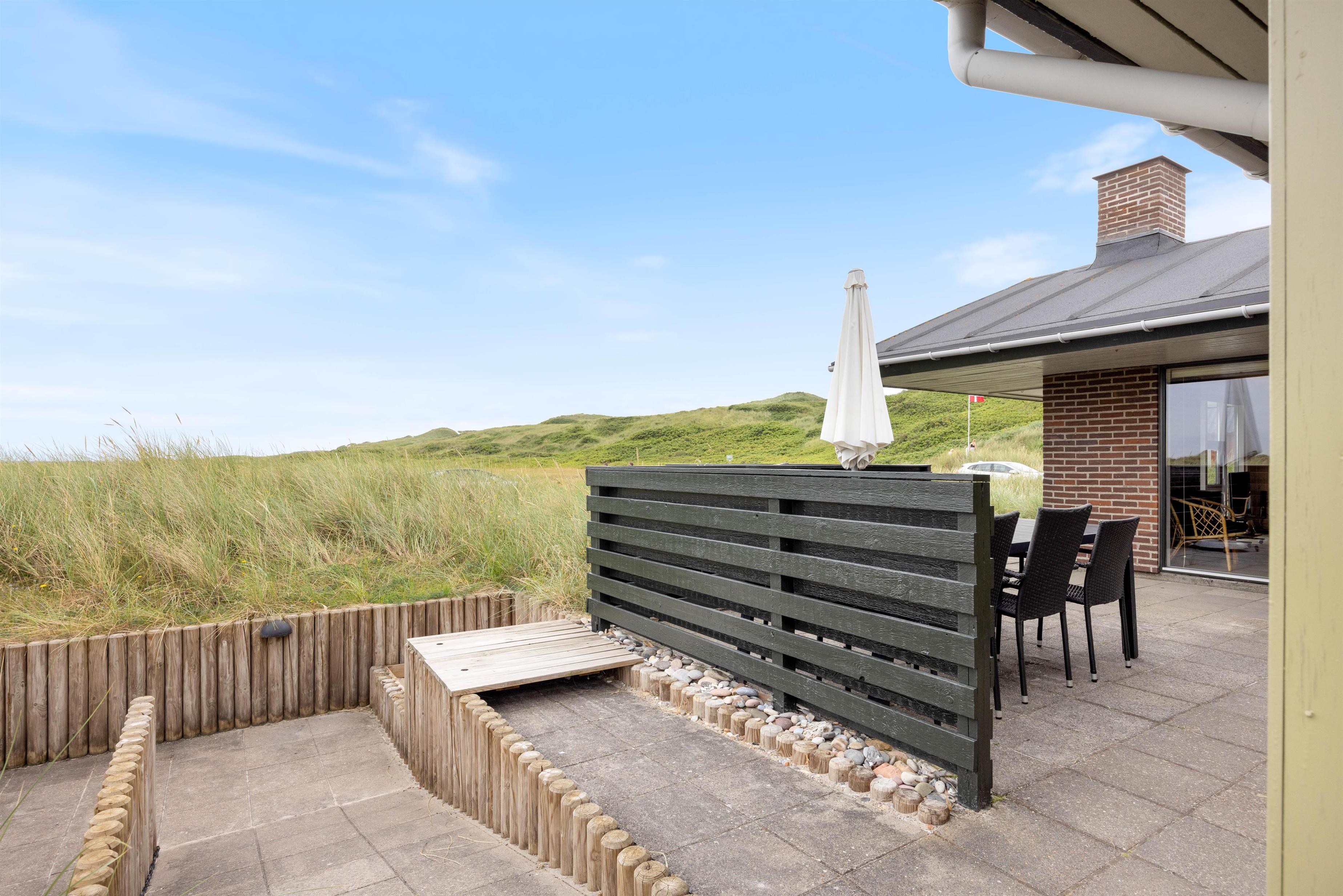Terrasserne ved og omkring feriehuset på Kirstinevej 110 er et stort plus. Alt efter vind og vejr kan man benytte enten den helt åbne og afskærmede terrasse, som på charmerende vis går i ét med de omkringliggende klitter. Eller man kan opholde sig på den overdækkede del i forbindelse med sommerhuset. Her er altid mulighed for en krog med læ eller fuld sol, alt efter hvad der frister mest. Der er sandkasse til børnene og en dejlig naturgrund, hvor de kan gå på opdagelse.