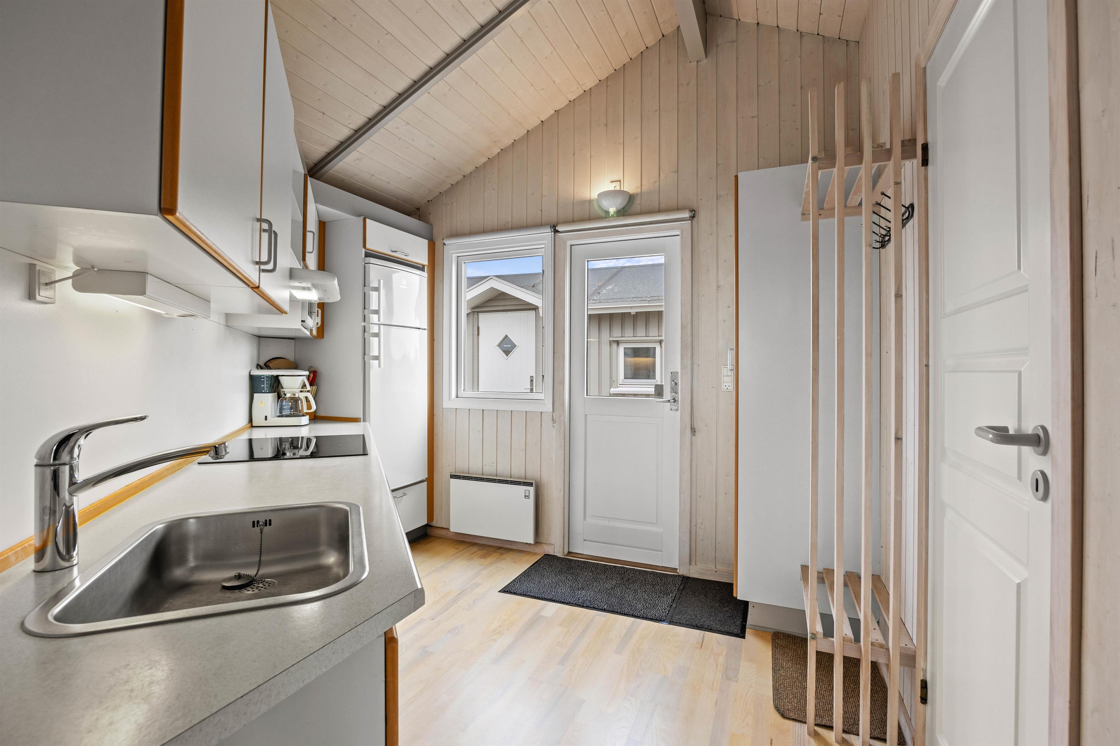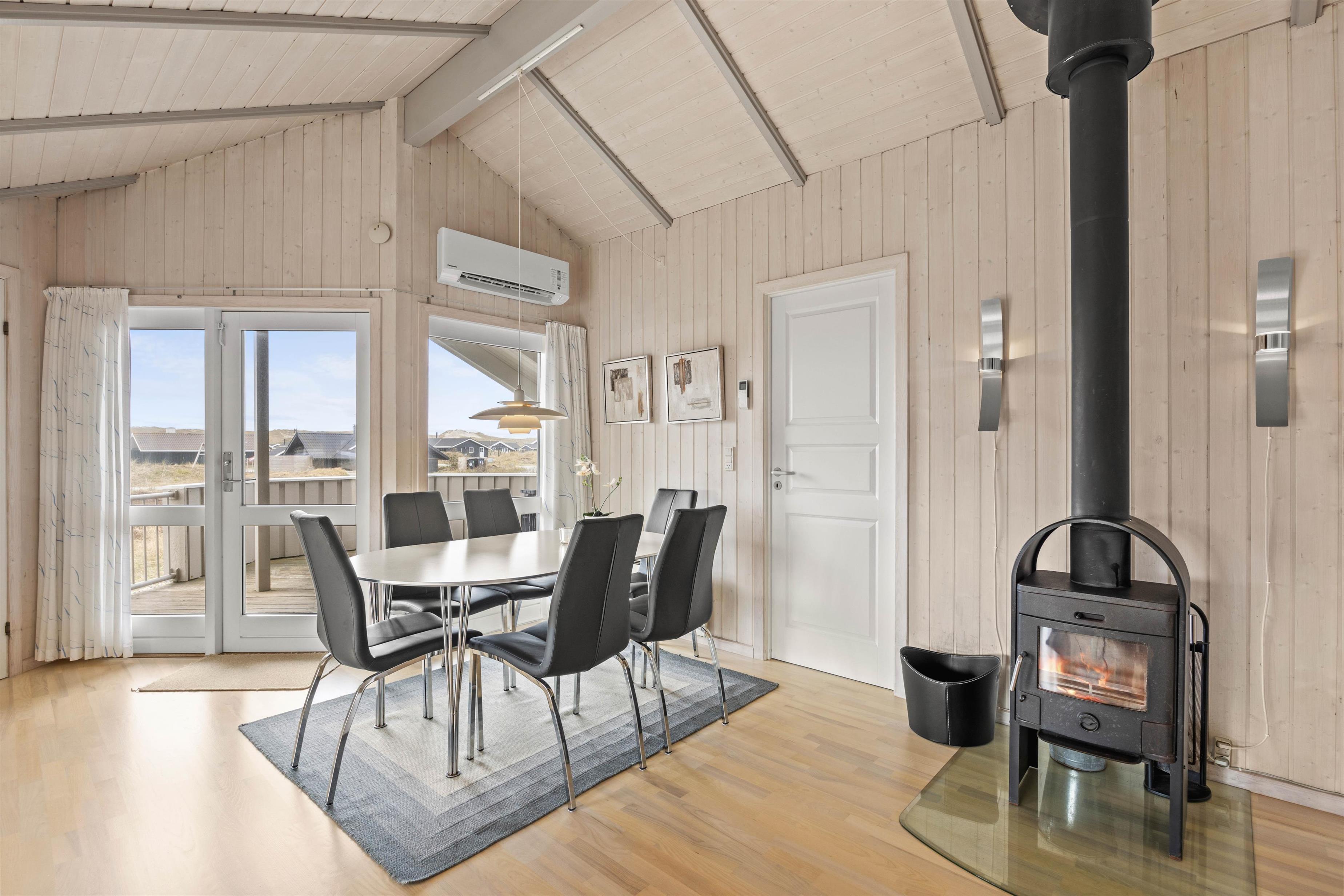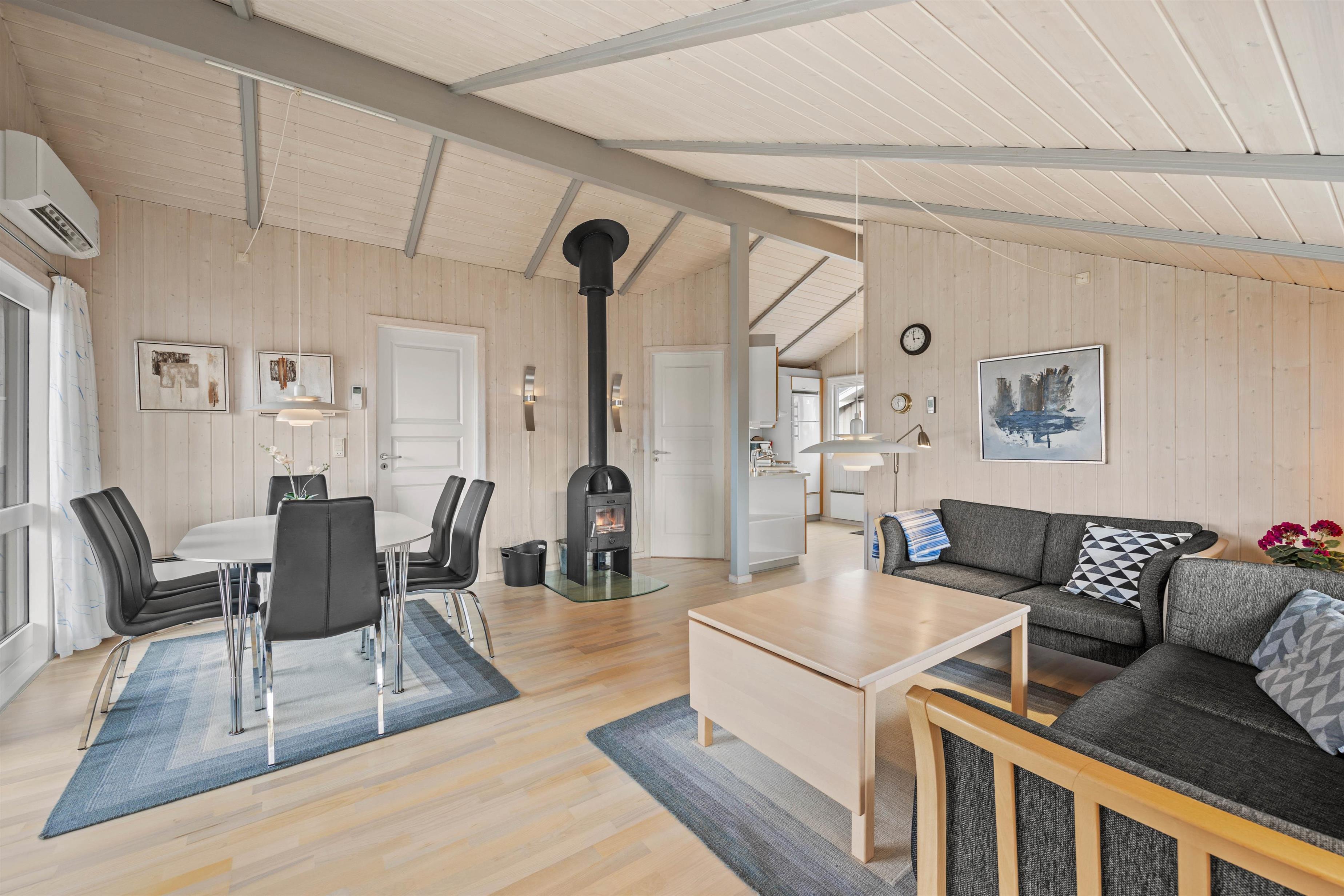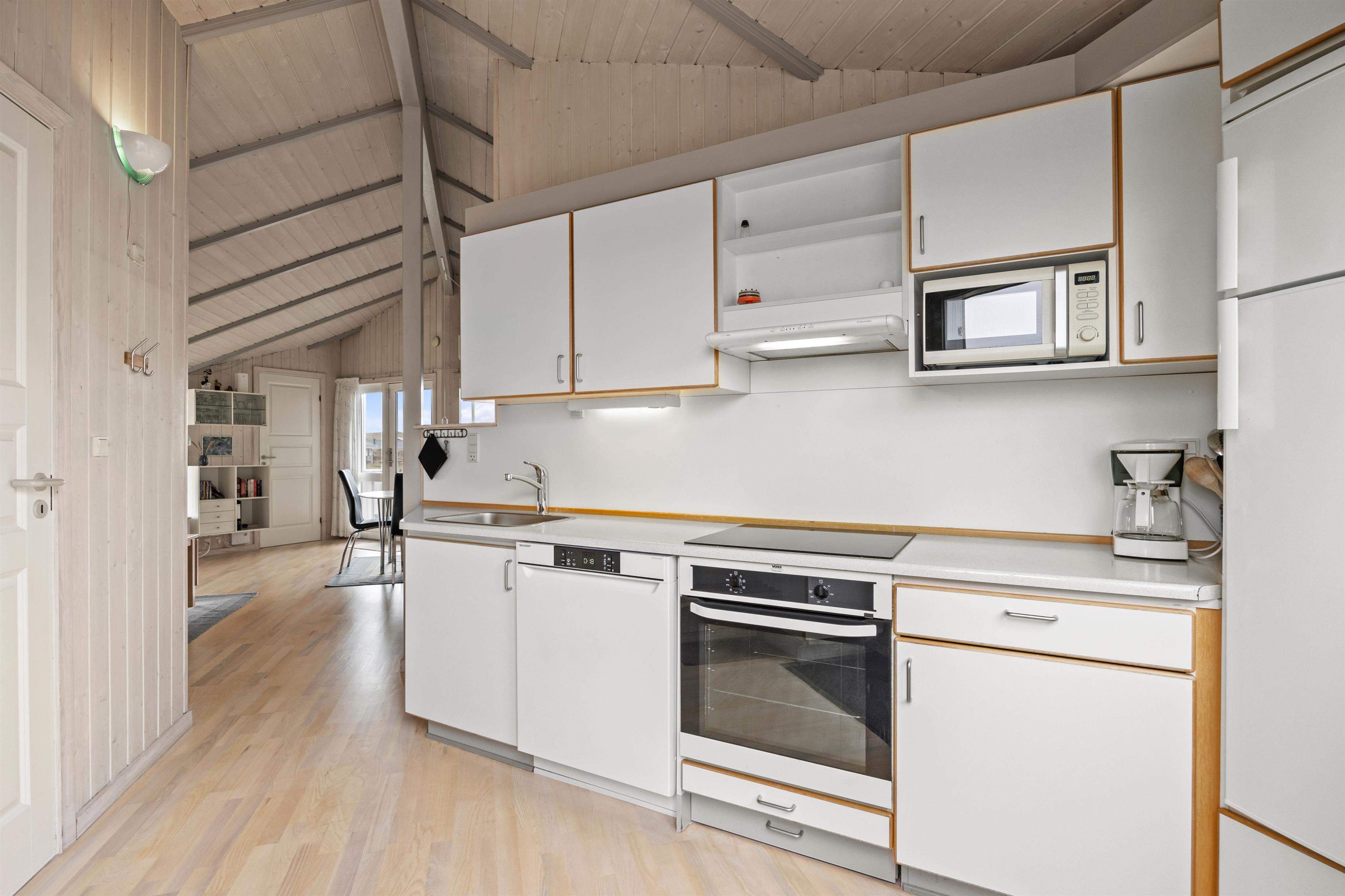 Det vigtigste rum i feriehuset er køkken-alrummet, hvor I alle kan samles. Her vil I utvivlsomt tilbringe mange hyggelige feriestunder til spilleaftner eller med en god bog foran brændeovnen. Rummet opvarmes af en energibesparende varmepumpe, der sammen med brændeovnen sørger for et behageligt indeklima. Brændeovnens knitrende flammer fuldender den hyggelige feriestemning, særligt på de køligere aftener. Udover varmepumpen har sommerhuset også mange andre af hverdagens hjælpere; i køkkenet slipper I for at stå med opvasken, for den klarer opvaskemaskinen for jer.