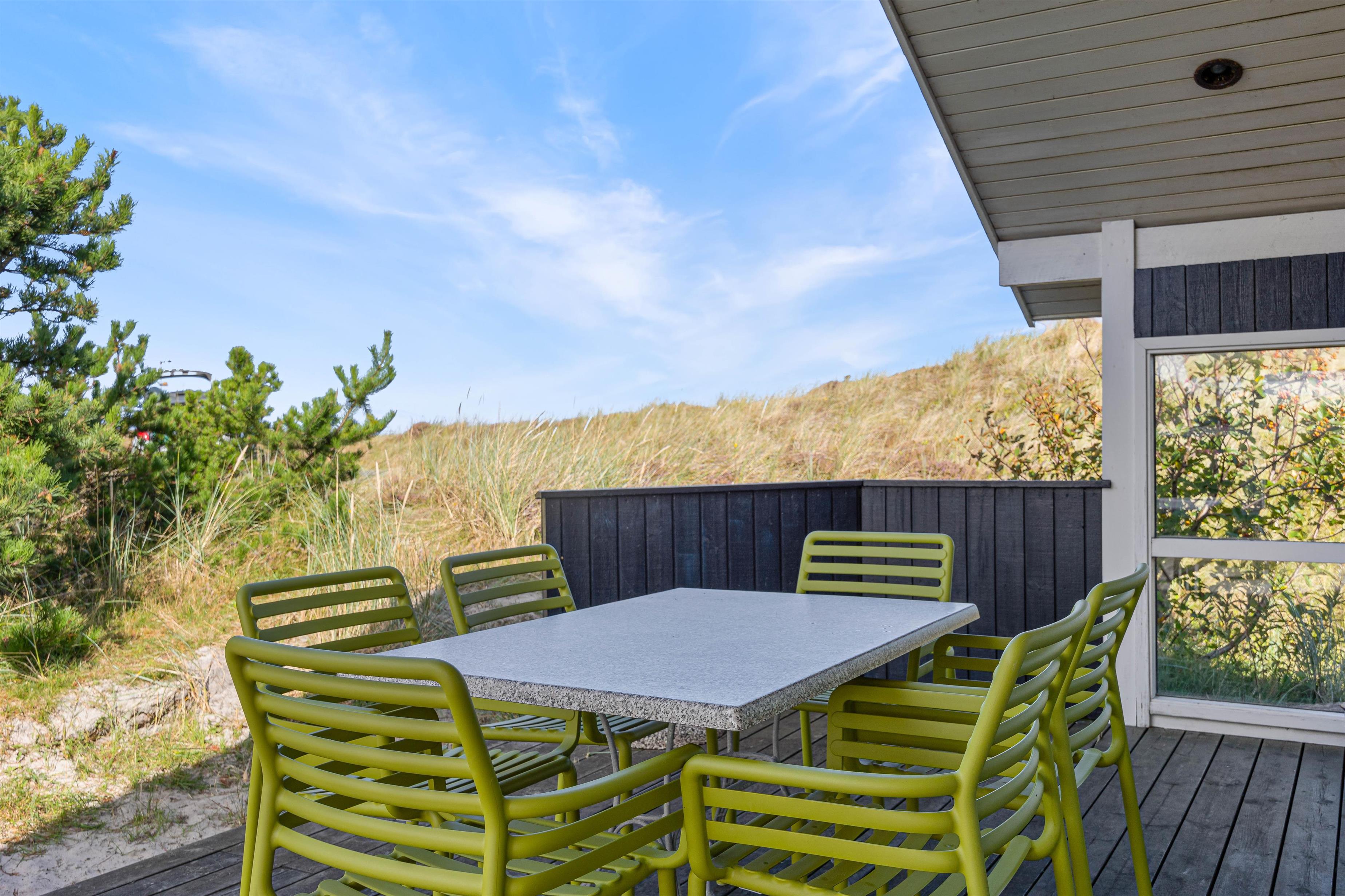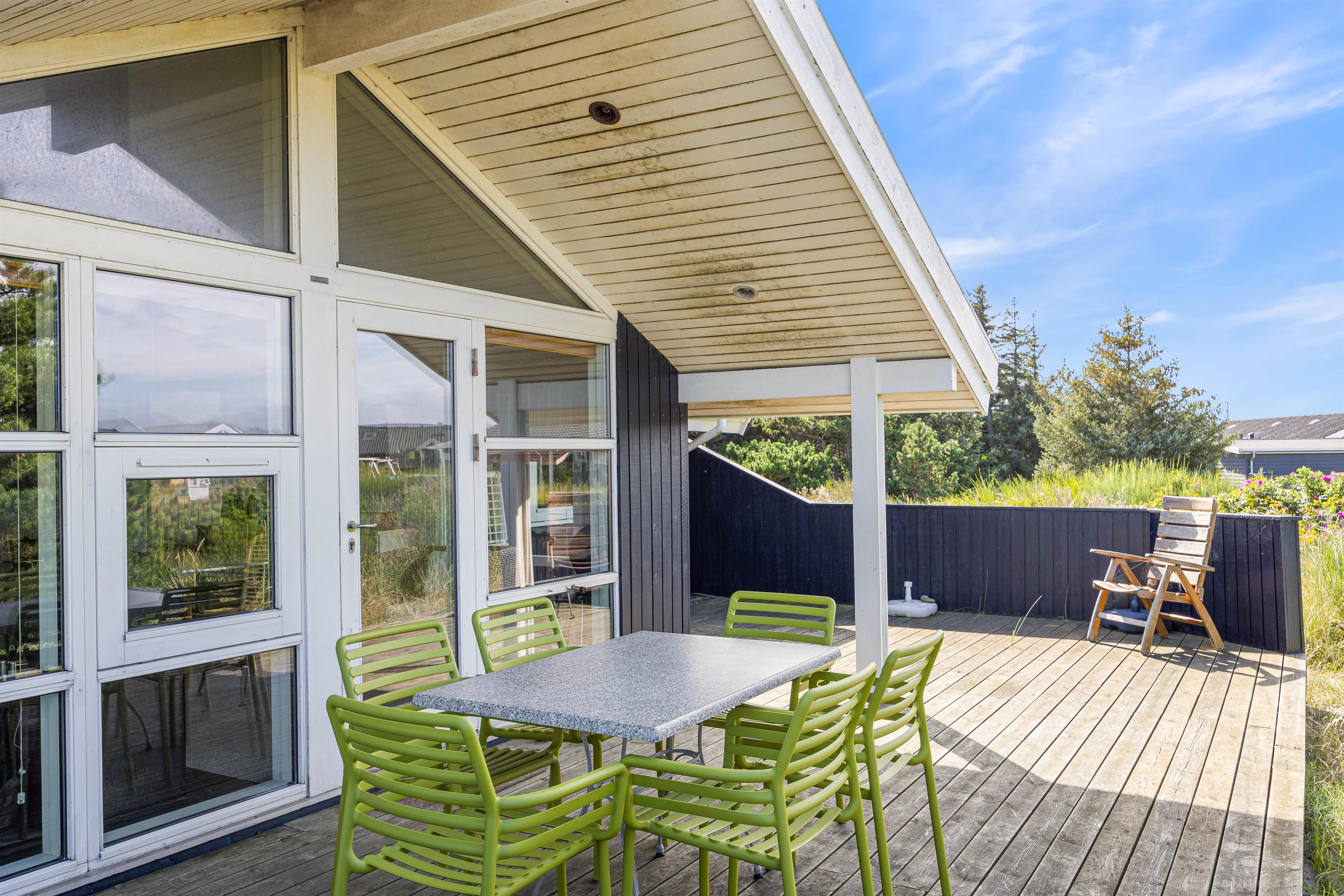 Så snart du kører ind i indkørslen til dette smukke feriehus, kan du se terrasseområdet lige uden for hoveddøren. Sæt dig her om morgenen med en friskbrygget kop kaffe og nyd den opgående sol, inden du går den første tur med hunden til købmanden for at hente rundstykkerne til morgenmaden med familien.