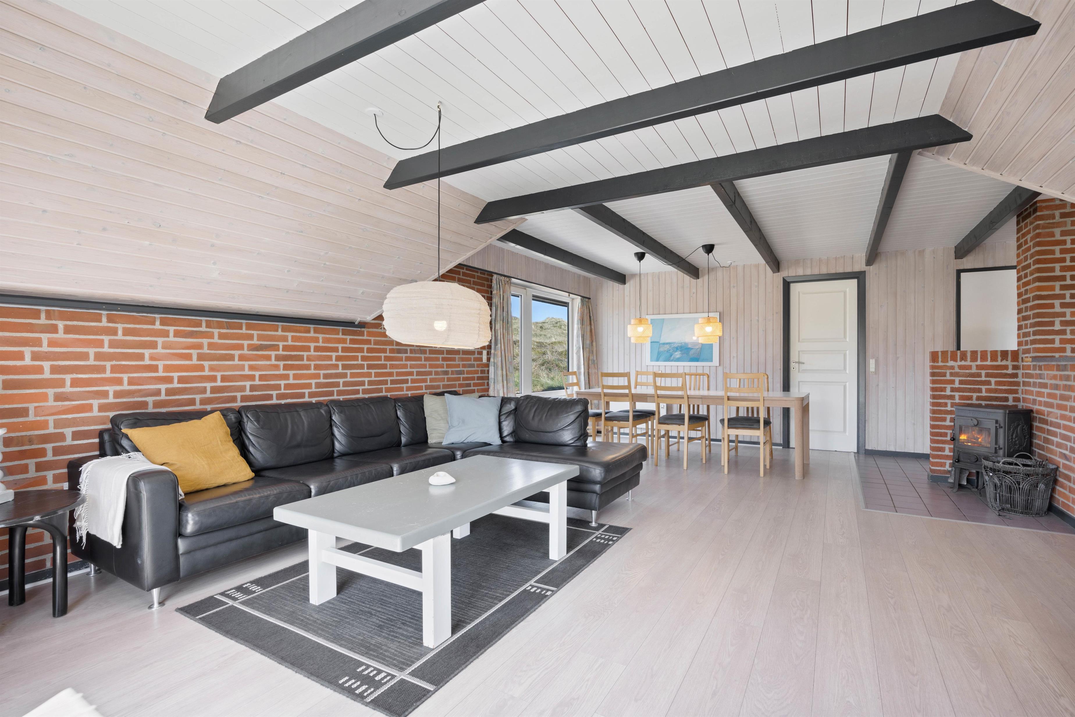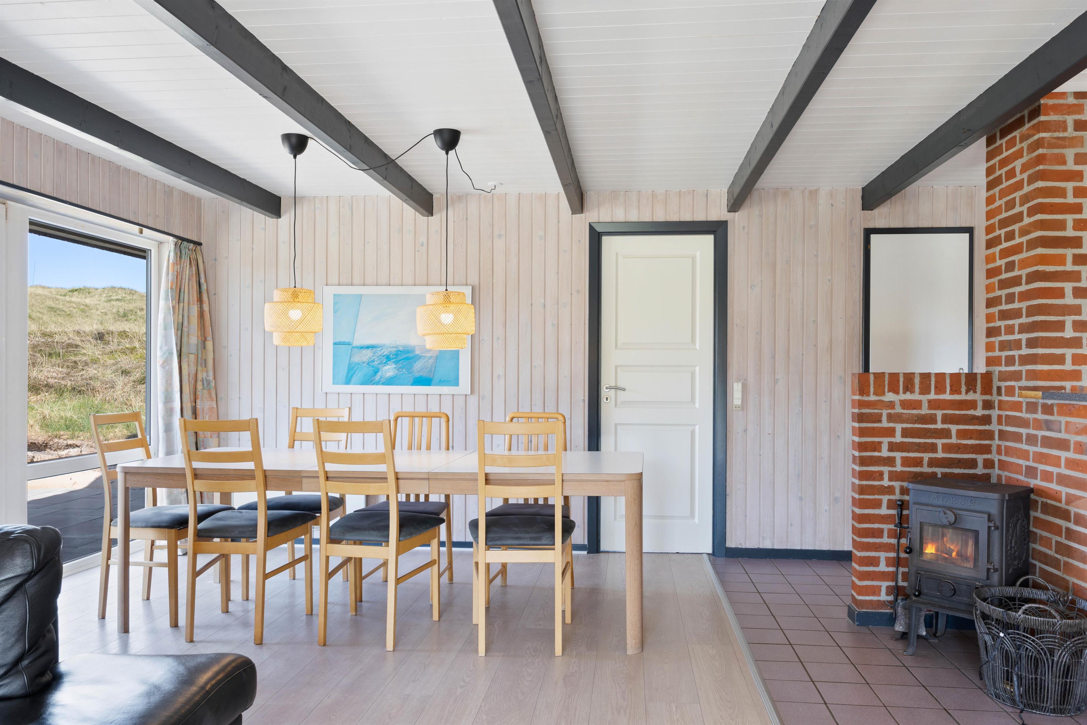 Det er et rummeligt og dejligt sommerhus med en hyggelig stemning i den store stue, hvor en rustik brændeovn luner og hygger. Det lyse og funktionelle køkken med opvaskemaskine er i åben forbindelse med spiseafdelingen, hvor lyse vægge og trægulv gør et indbydende indtryk.