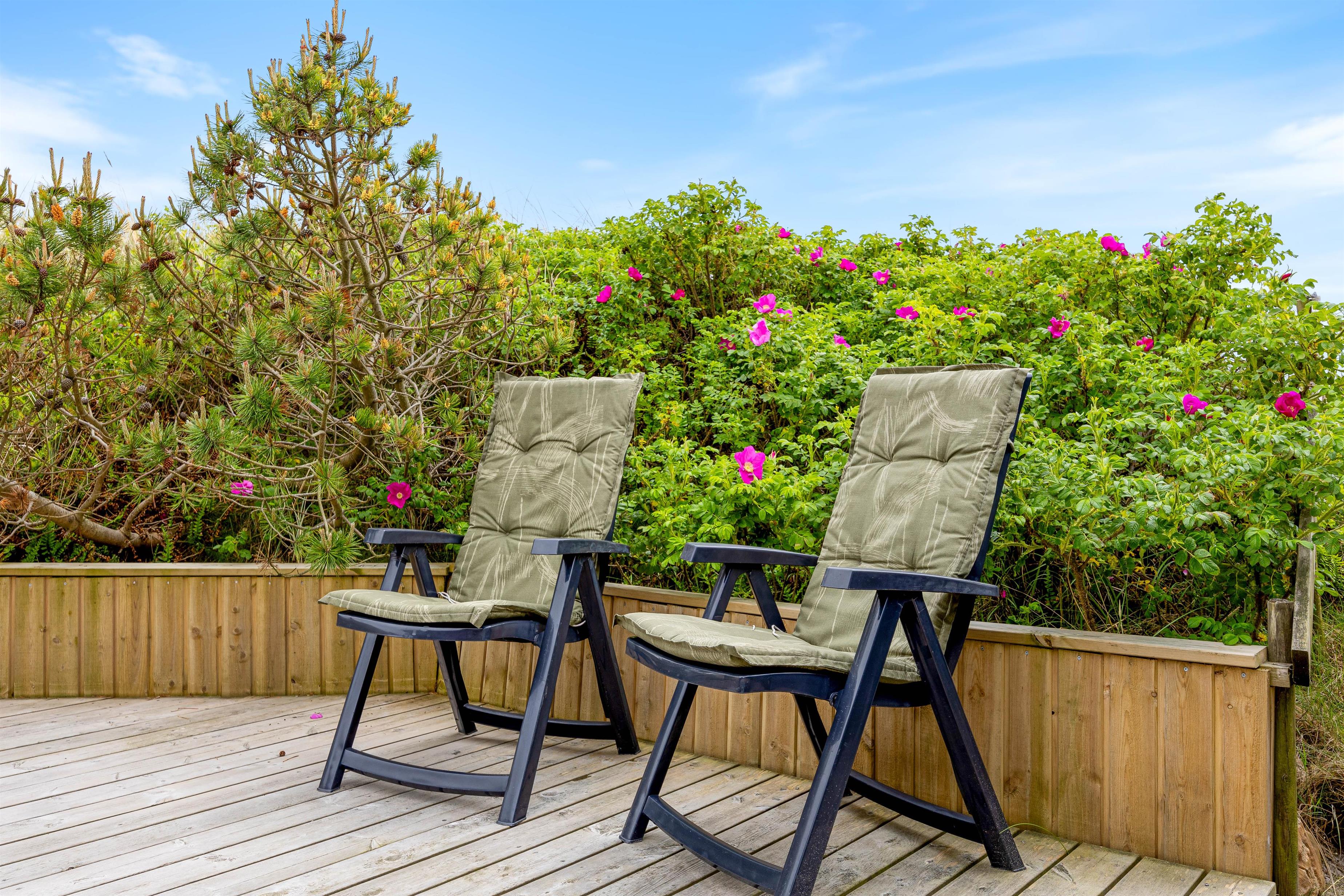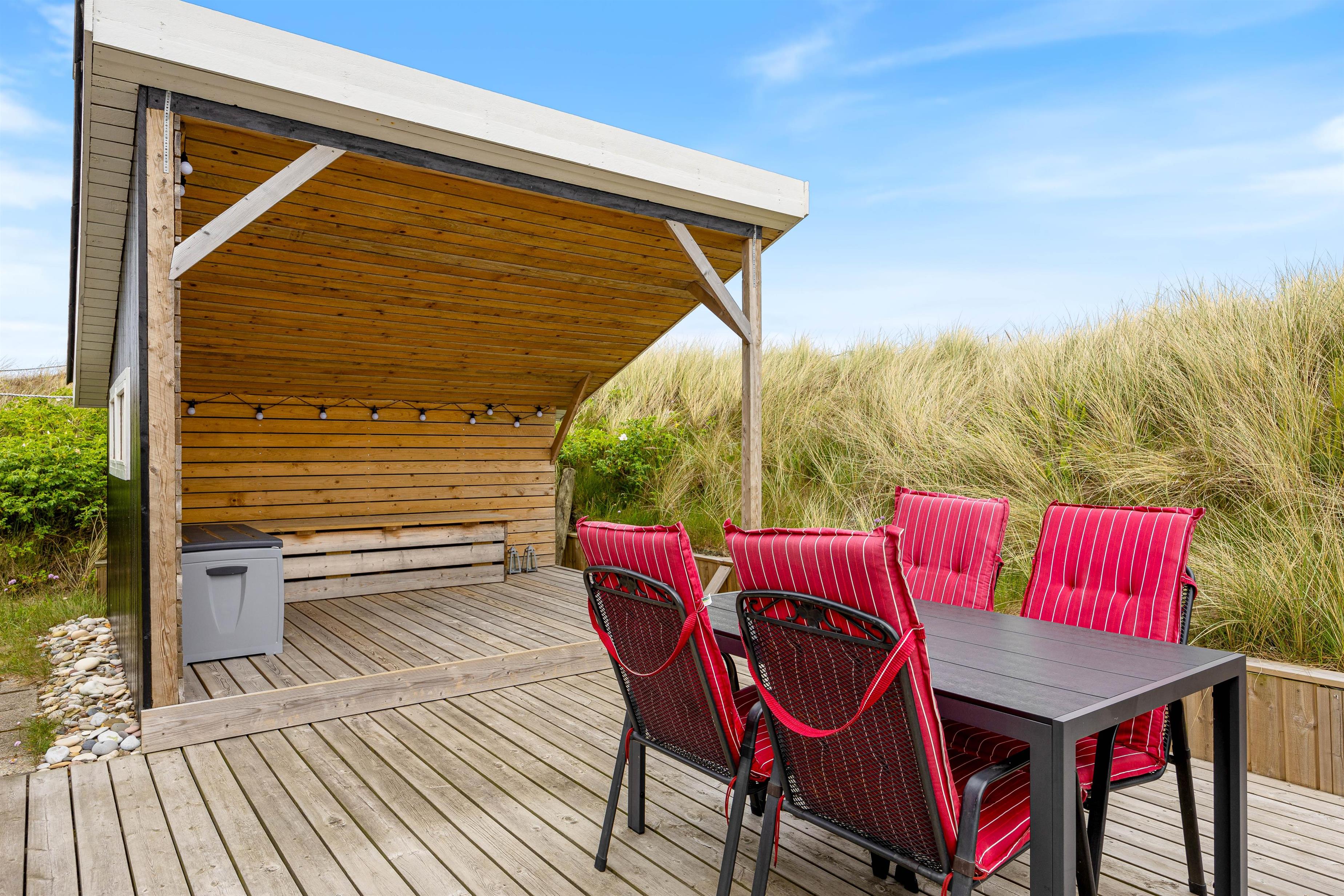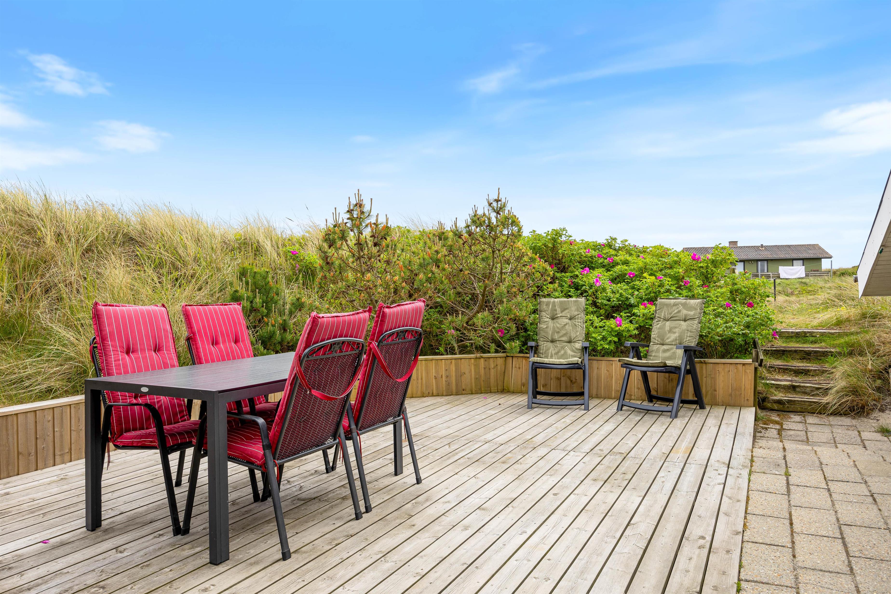 De 2 terrasser ligger på en 1300 kvadratmeter stor naturgrund og byder på mange muligheder for afslapning. Udover kulgrillen på terrassen er der også en elektrisk grill i sommerhuset, så I har alle muligheder for hyggelige grillmåltider, uanset vejret. Solstole indbyder til afslapning, mens en lukket terrasse og en terrasse, afskærmet af klitgræs, giver ro og privatliv. Børnene kan lege i sandkassen eller gå på opdagelse på naturgrunden. Slut dagen af med en dejlig tur til stranden, hvor I kan opleve solnedgangen i Vesterhavet.