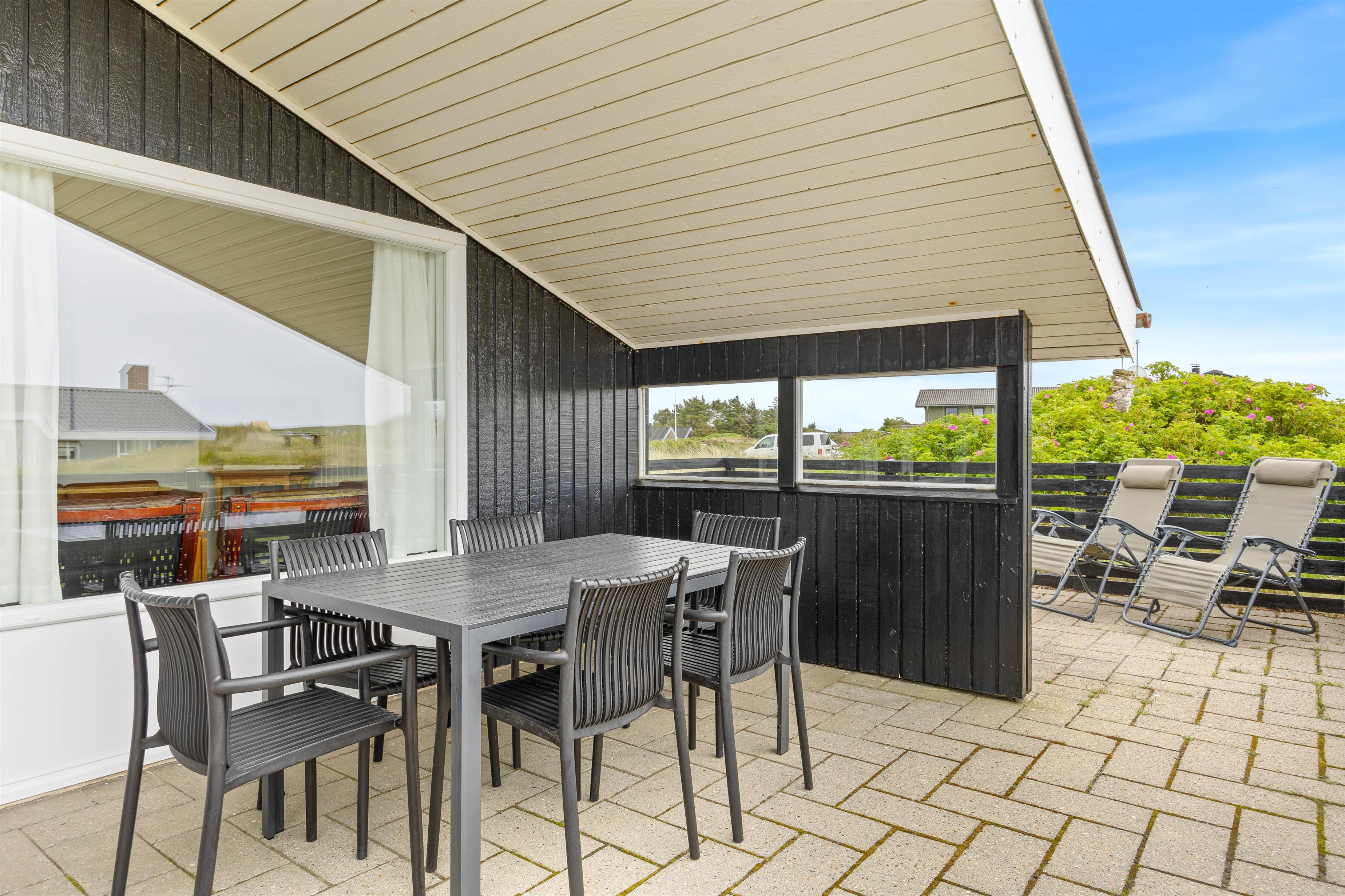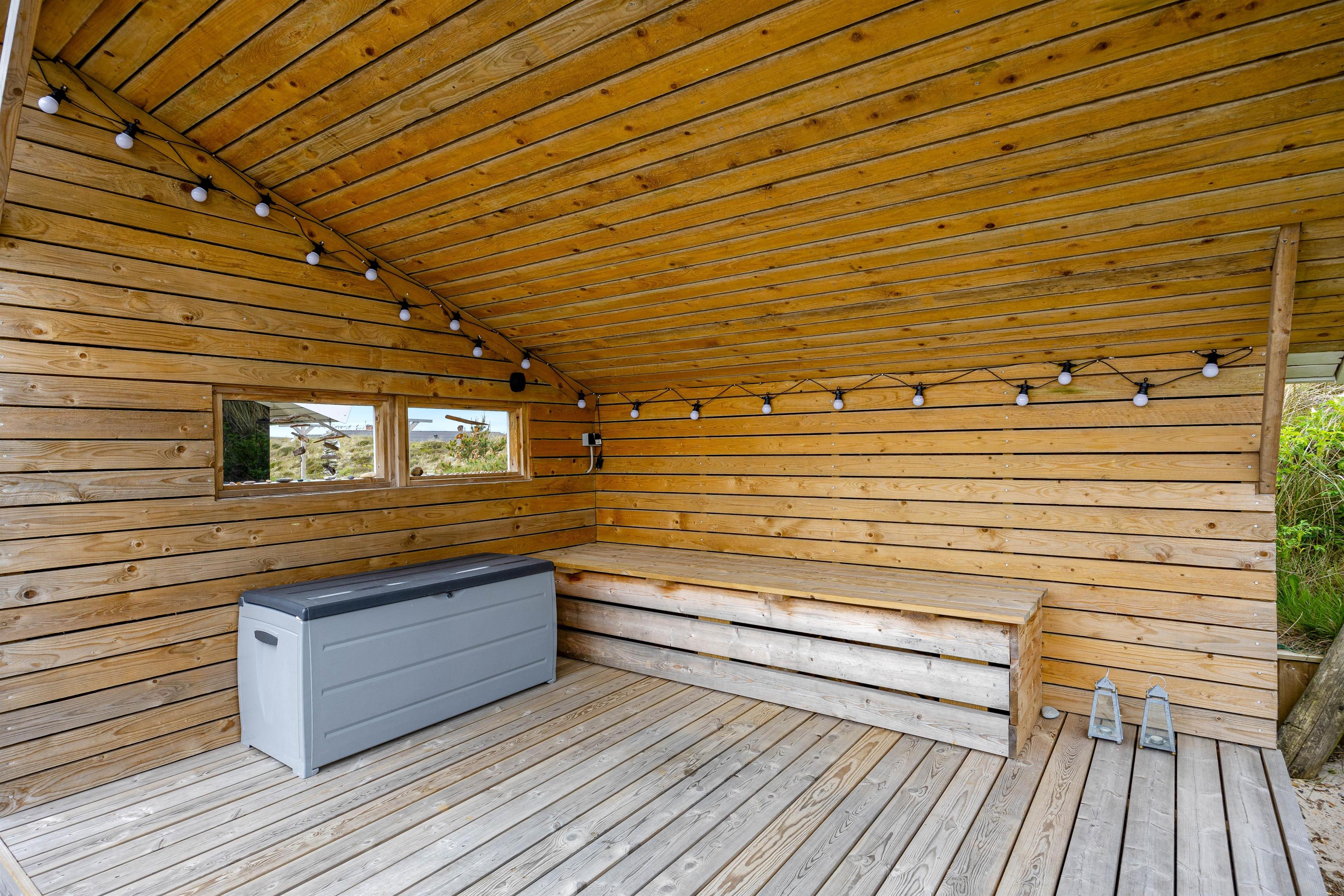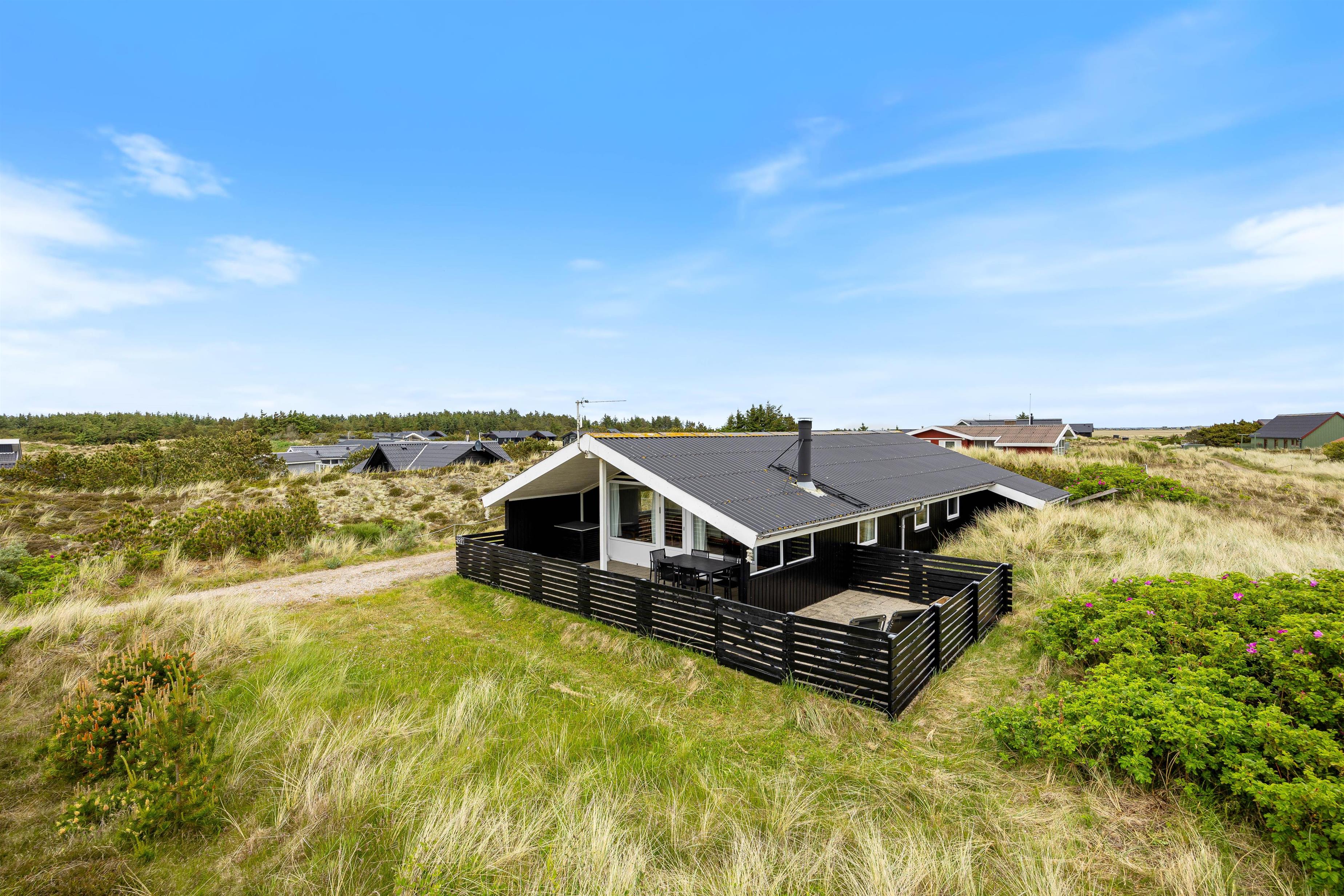De 2 terrasser ligger på en 1300 kvadratmeter stor naturgrund og byder på mange muligheder for afslapning. Udover kulgrillen på terrassen er der også en elektrisk grill i sommerhuset, så I har alle muligheder for hyggelige grillmåltider, uanset vejret. Solstole indbyder til afslapning, mens en lukket terrasse og en terrasse, afskærmet af klitgræs, giver ro og privatliv. Børnene kan lege i sandkassen eller gå på opdagelse på naturgrunden. Slut dagen af med en dejlig tur til stranden, hvor I kan opleve solnedgangen i Vesterhavet.