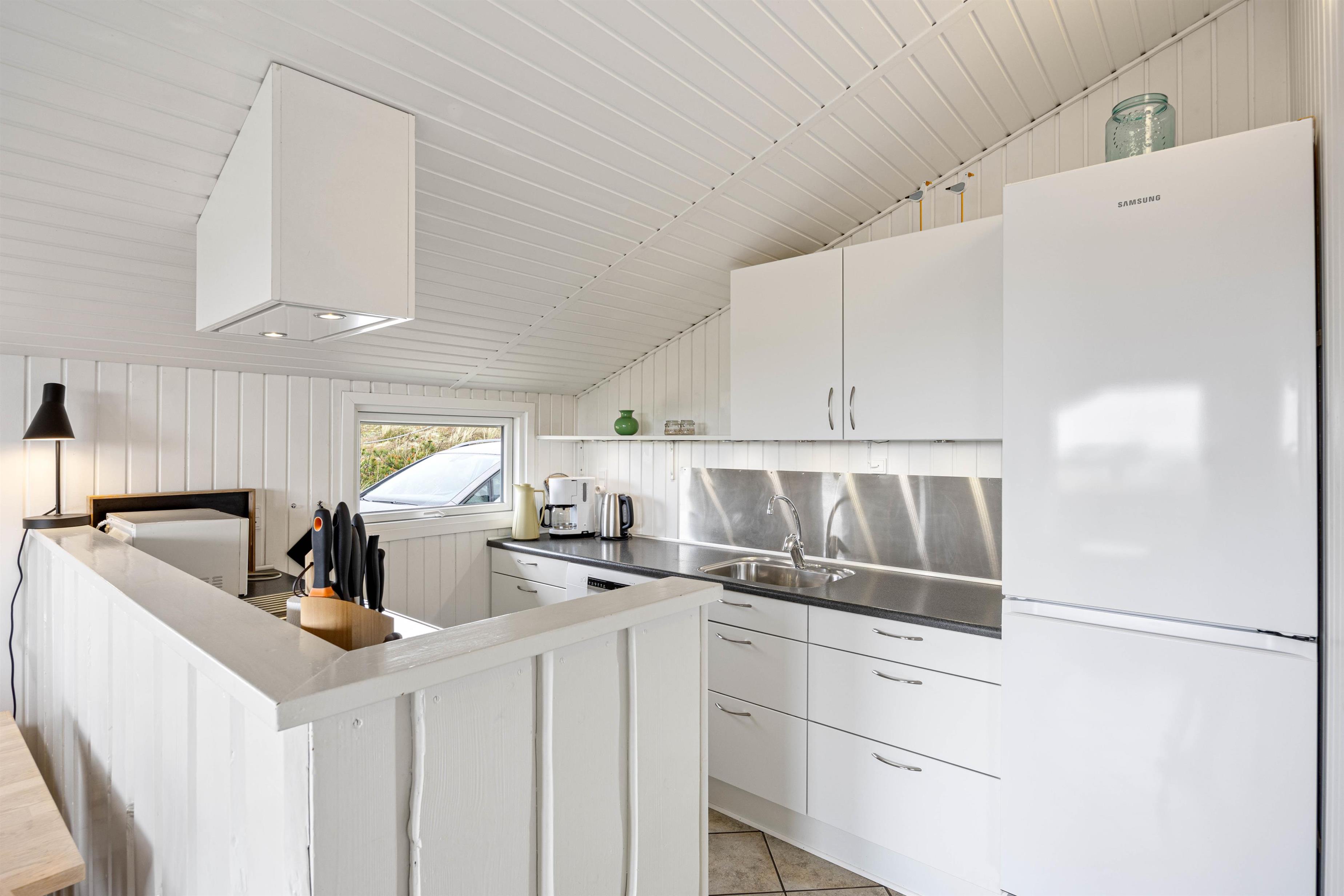 Med en energibesparende varmepumpe i sommerhuset vil du altid have et behageligt indeklima. Det fuldt udstyrede, åbne køkken indeholder alt, hvad I behøver for at forkæle hinanden med lækre hjemmelavede retter, herunder opvaskemaskine. Den separate fryser på 114 liter vil især glæde lystfiskerne – her er plads nok til en fisk eller to.