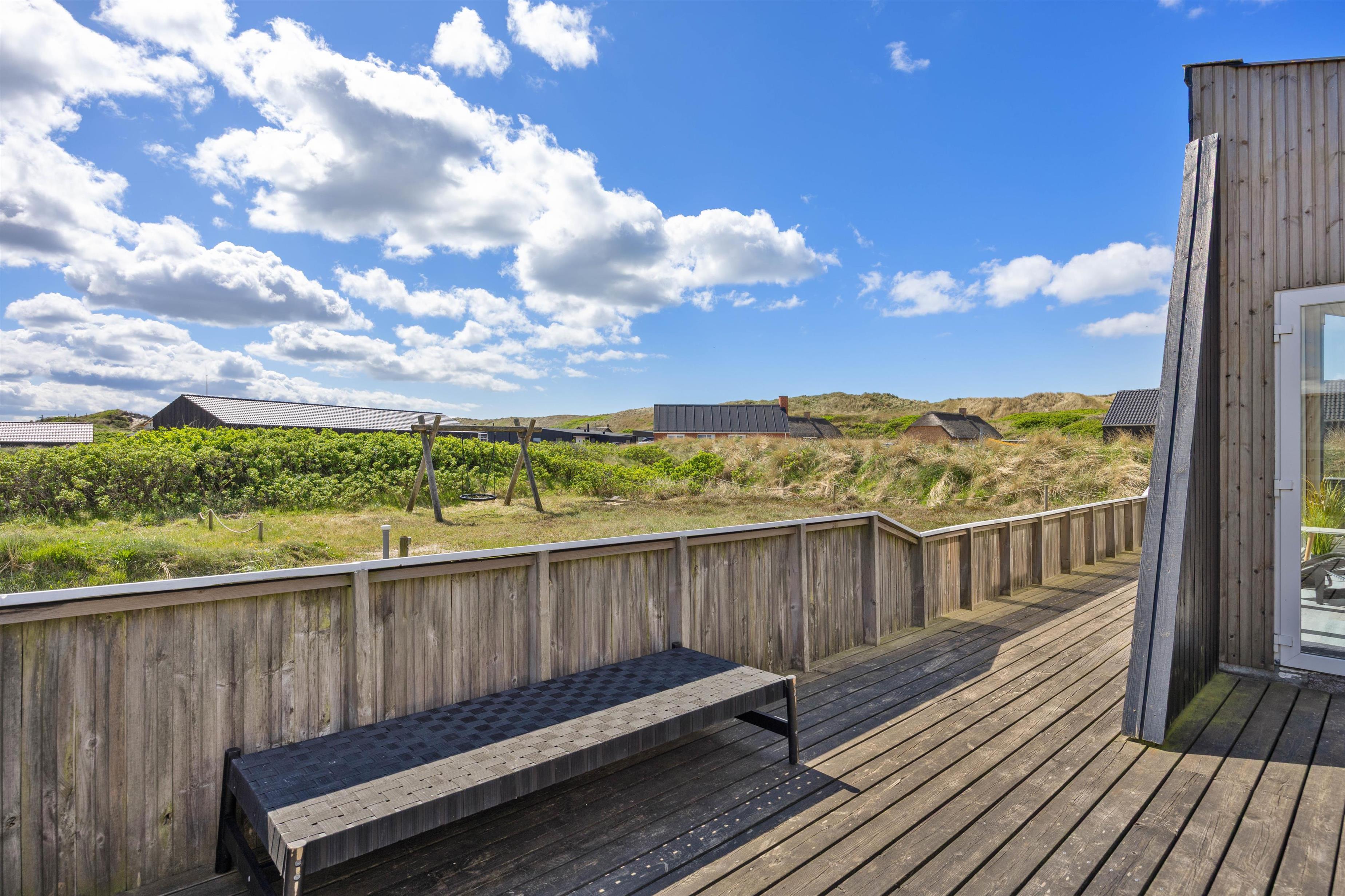 Sommerhuset er beliggende på en stor naturgrund i det storslåede klit- og hedelandskab på Holmsland Klit på Danmarks vestkyst. På den store og delvist overdækkede terrasse kan I i fred og ro nyde naturen og den friske vesterhavsluft. Her finder I naturligvis havemøbler, liggestole og en grill, som gør feriemadlavningen til en fornøjelse.