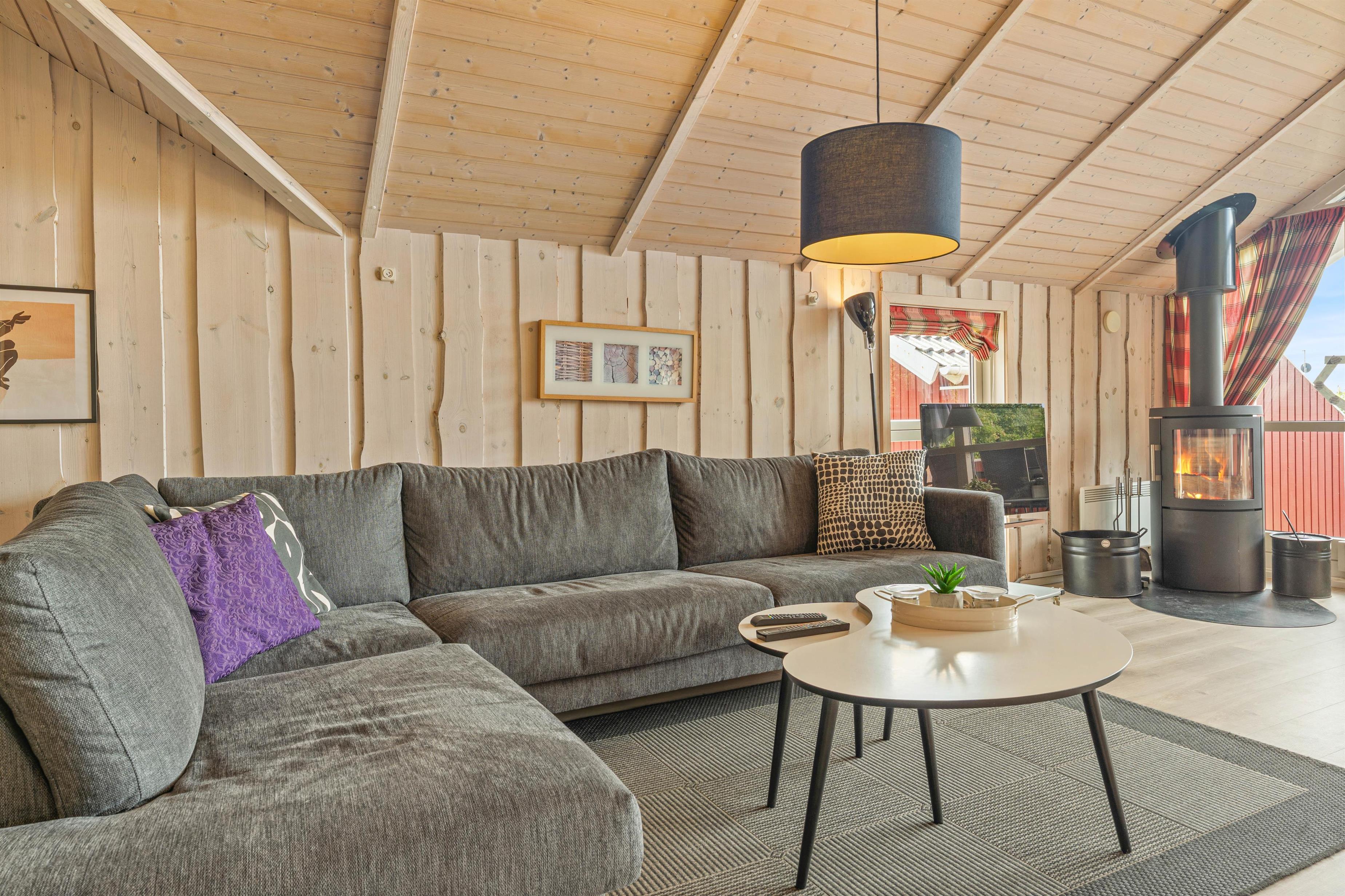 Overalt i dette feriehus er I omgivet af lyse vægge og lofter, som sammen med det strålende lysindfald og den smagfulde møblering giver en følelse af afslapning og ro. Det funktionelle køkken med en fryser og opvaskemaskine står i åben forbindelse med den hyggelige stue. I den kombinerende stue og spisestue er der plads til jer alle! Her luner brændeovnen, mens den afslappende feriestemning understreges med en god film i fjernsynet.