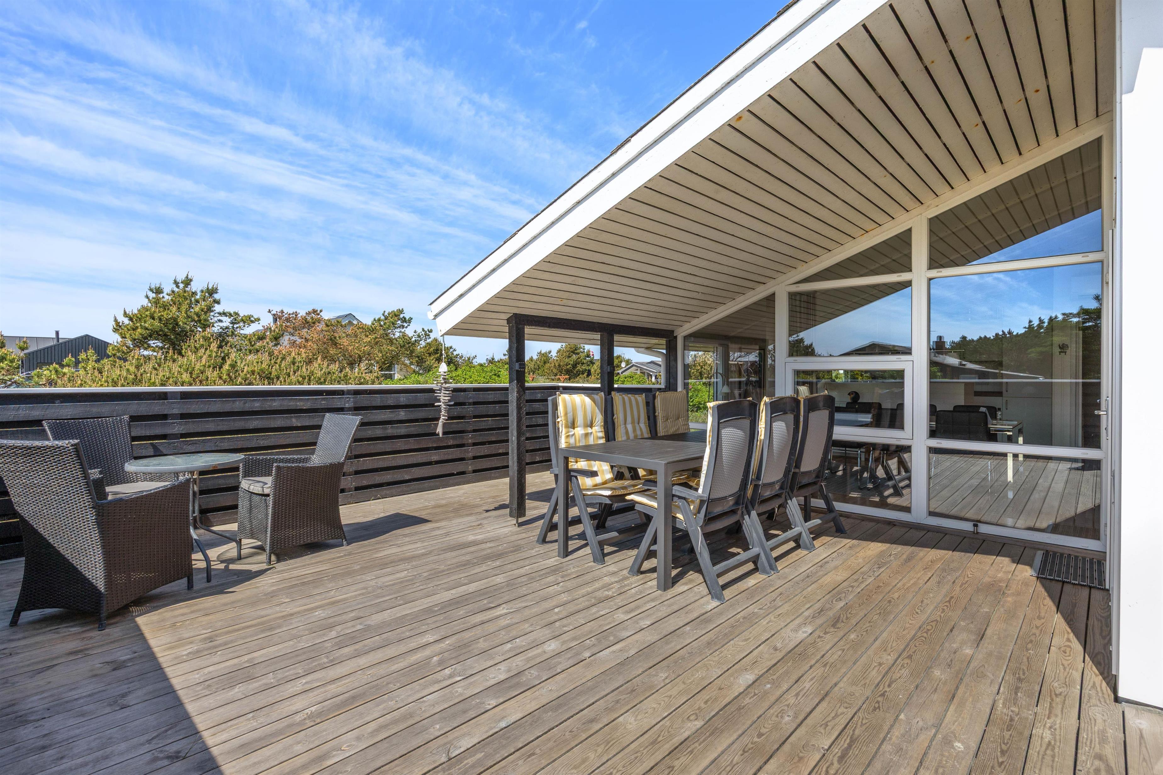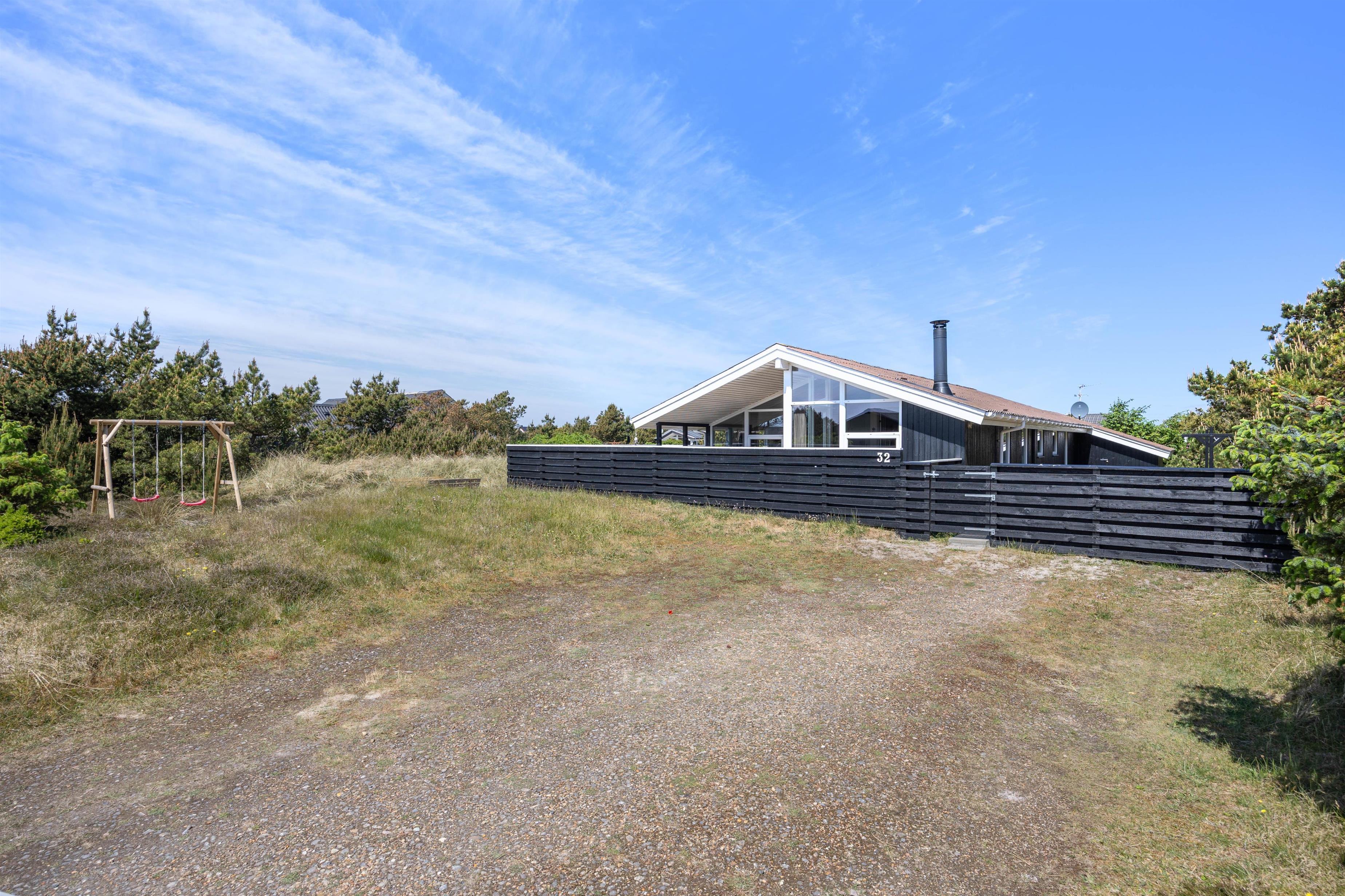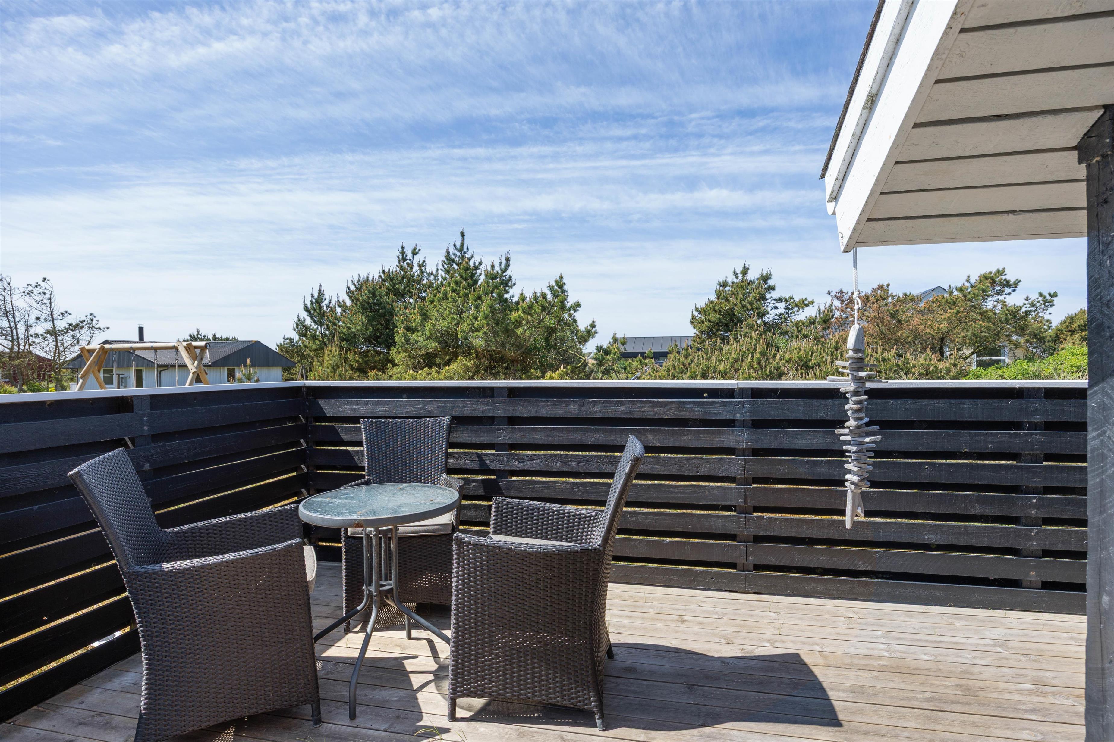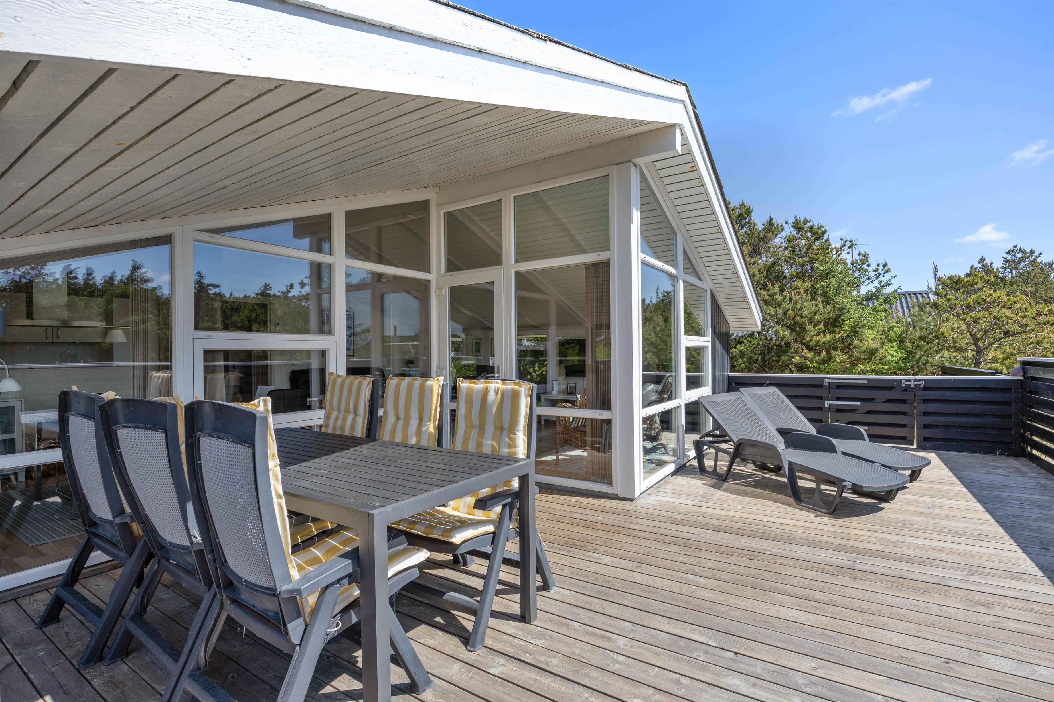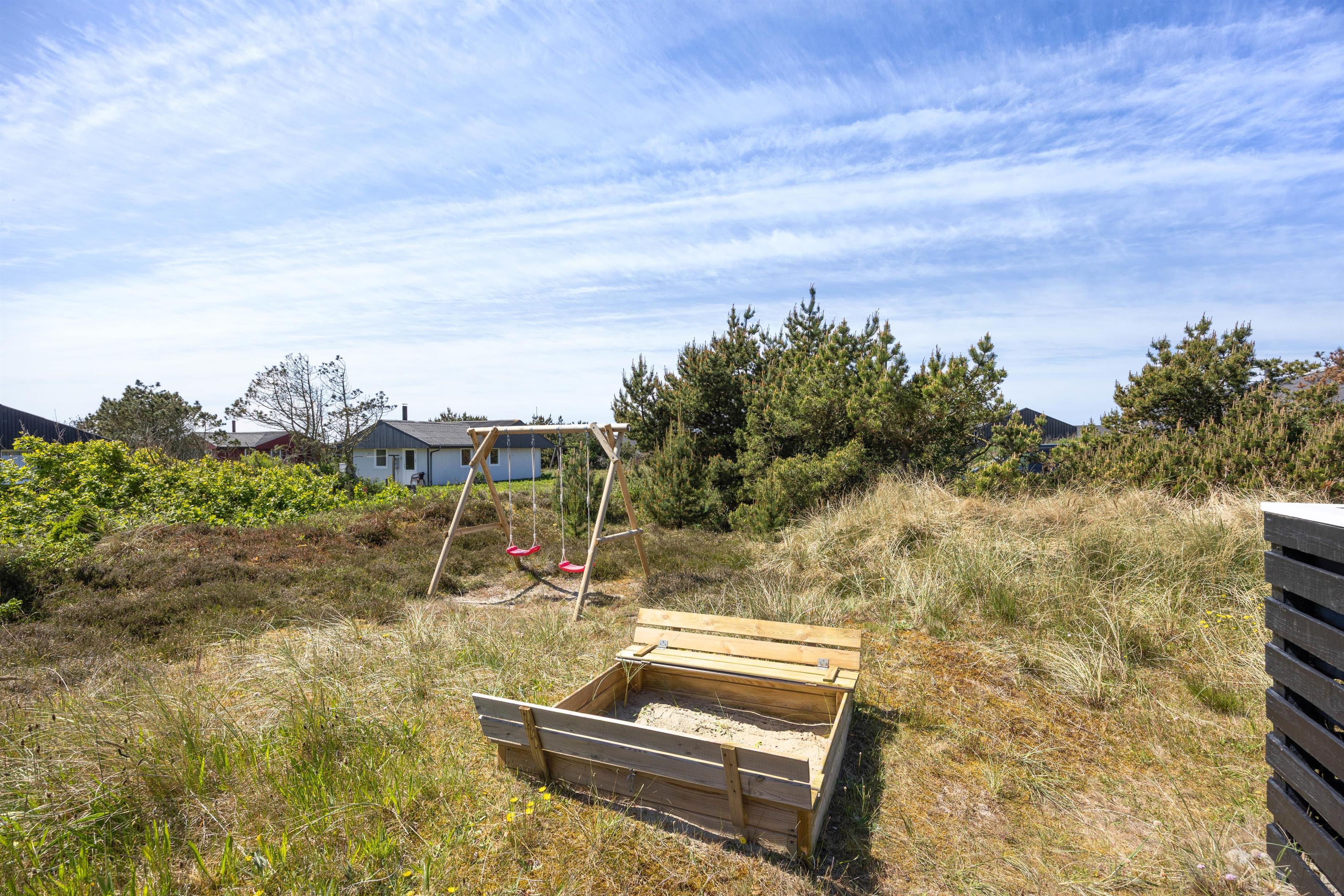 Træd direkte fra opholdsrummet ud på den lukkede terrasse, som er delvist overdækket. Terrassen ved sommerhuset i Bjerregård er både overdækket og lukket, hvilket gør, at den kan benyttes uanset vejret. Også børn er der sørget godt for. I haven er der en gynge og en sandkasse, så de kan lege frit. Den lukkede terrasse giver desuden tryghed og sikkerhed for dem.