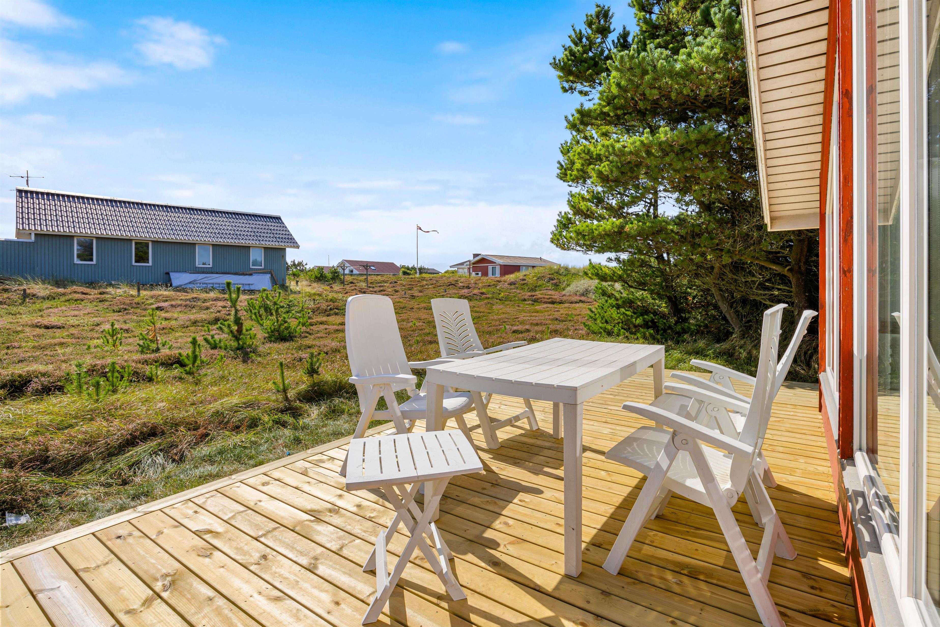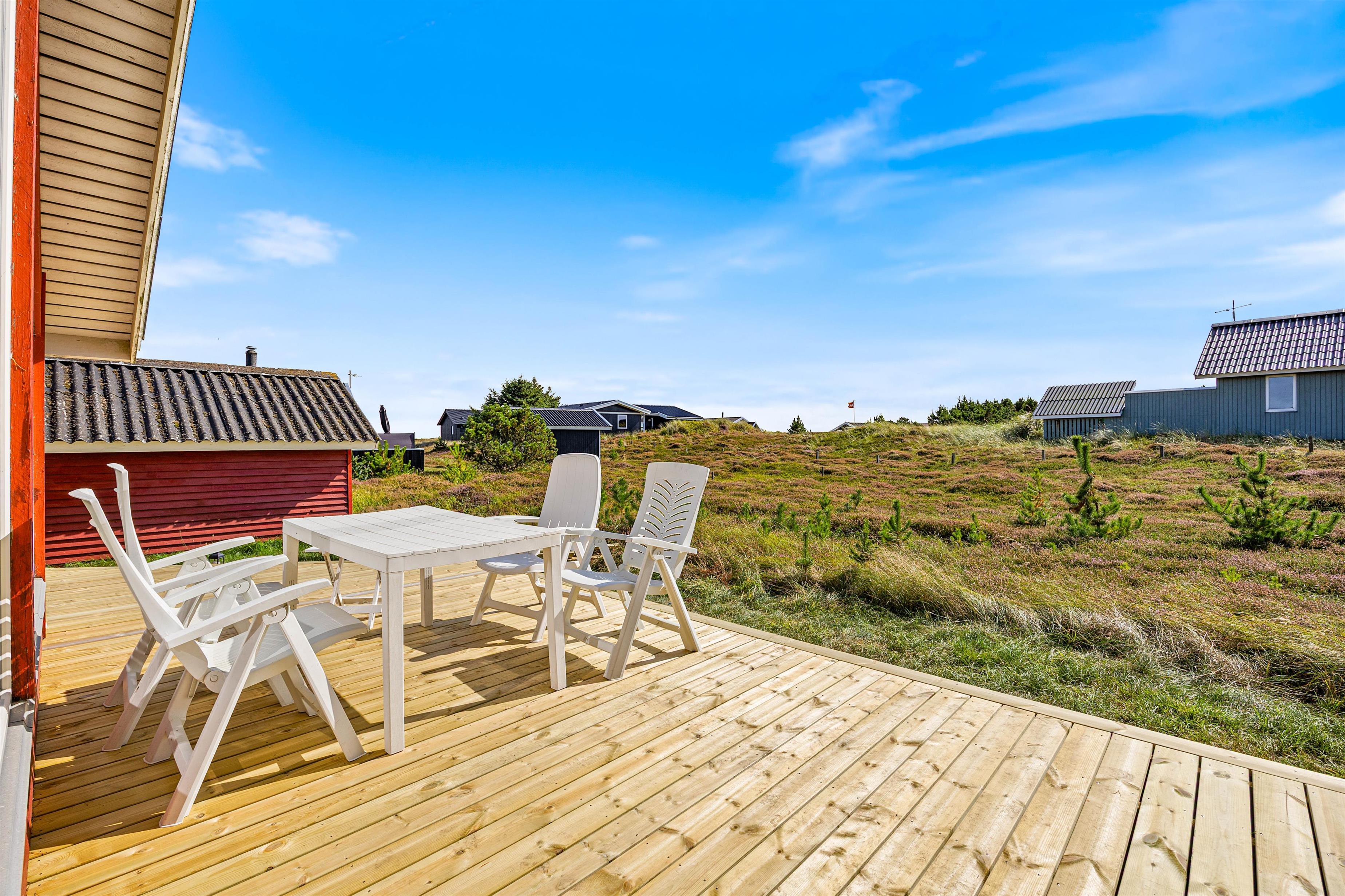 Til feriehuset hører en åben terrasse, hvor I kan nyde den friske havluft. Her kan I spise morgenmad i solen eller slappe af efter en lang gåtur. På naturgrunden er der god plads til, at jeres hund kan færdes frit, og med stranden kun 700 meter væk når I hurtigt ud til Vesterhavet og kan mærke den særlige stemning, som kun Nordsøen kan byde på.