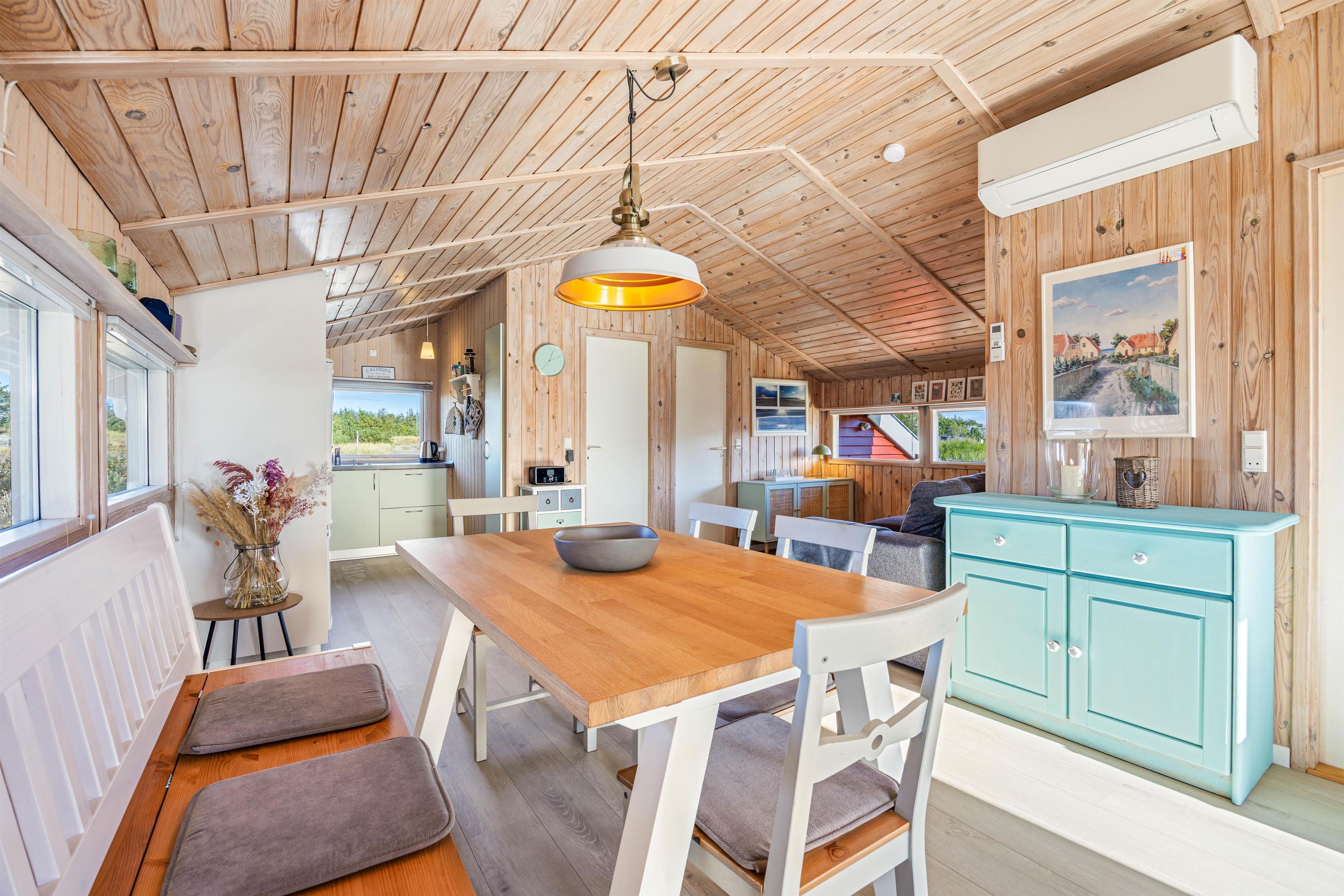 Feriehuset er af ældre dato og emmer af klassisk sommerhusstemning. I stuen kan I samles omkring brændeovnen, som skaber varme og hygge på kølige aftener, mens en varmepumpe sørger for et behageligt indeklima. Badeværelset er med gulvvarme, så I får en behagelig start på dagen.