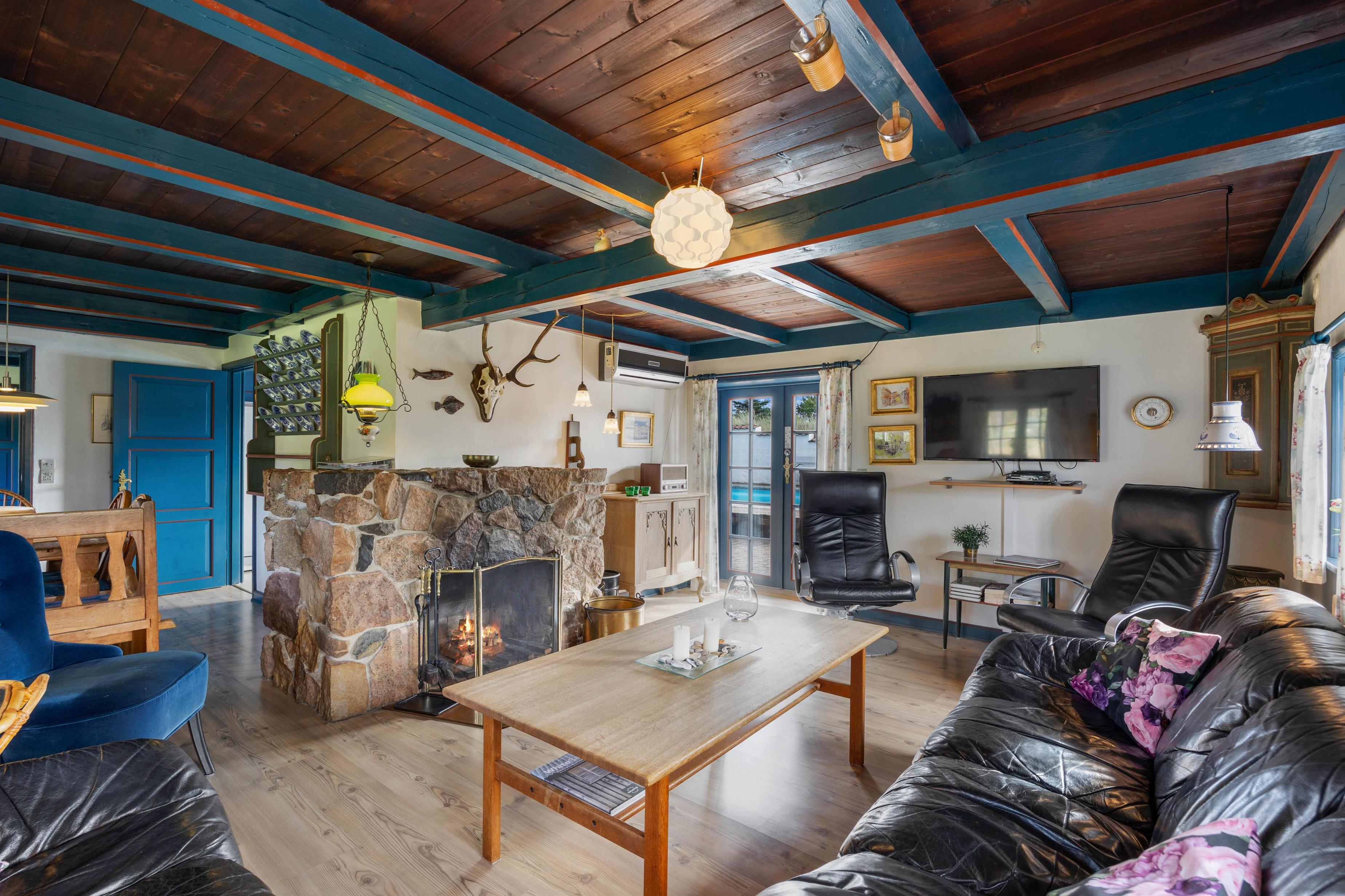 På Bjerregårdsvej 53 er de 140 kvadratmeter i 2 etager holdt i den oprindelige bondegårdsstil. I stueetagen finder I den hyggelige stue med gulvvarme og spiseplads. Her er behagelige siddepladser til en hyggelig og god filmaften. Eller I kan bare nyde varmen og den knitrende ild fra den åbne pejs.