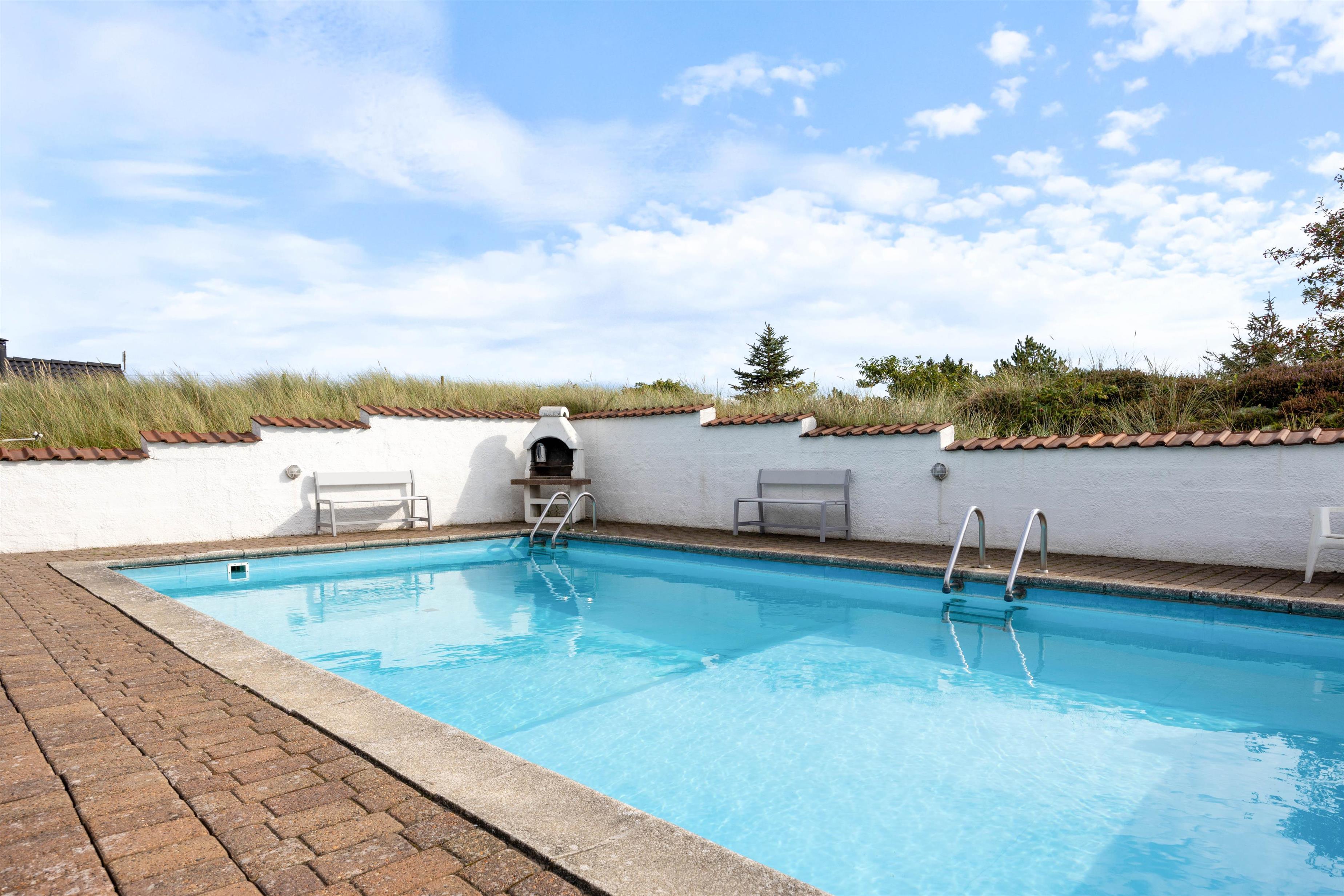 Det idylliske sommerhus ligger på en 1300 kvadratmeter stor naturgrund med en klit, der omgiver den bageste terrasse. Her kan I uforstyrret svømme i poolen, slappe af i havemøblerne eller solbade på liggestolene, mens børnene plasker rundt i vandet. Swimmingpoolen er 5 x 10 meter og har en dybde på 1,5 til 2 meter. Den kan bruges fra kalenderuge 20 til 38.