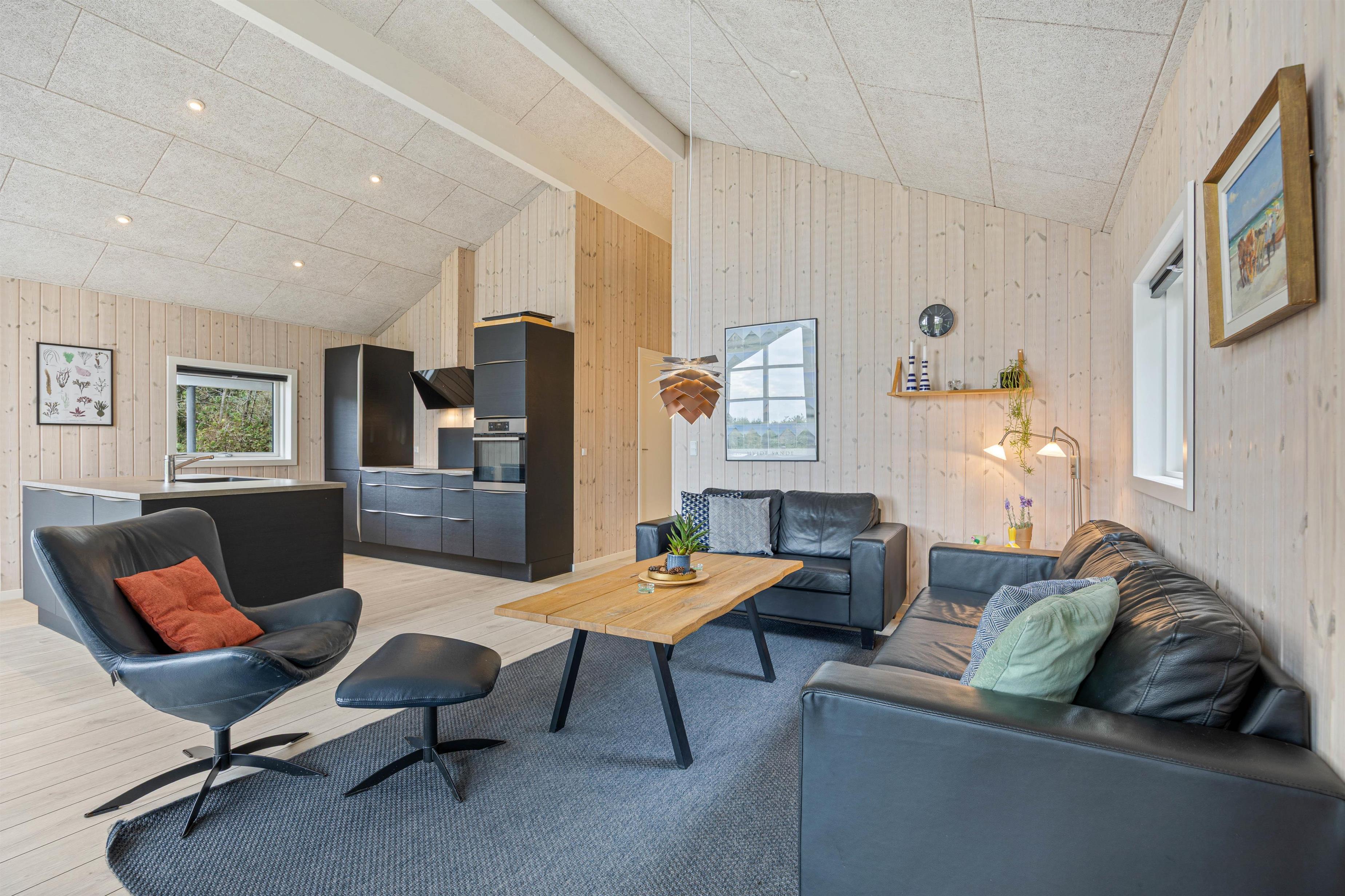 Feriehusets hjerte og samlingspunkt er det store lyse opholdsrum, hvor der er plads til alle – og hvor de store vinduespartier mod vest og syd tager både solen og naturen med helt ind i stuen.