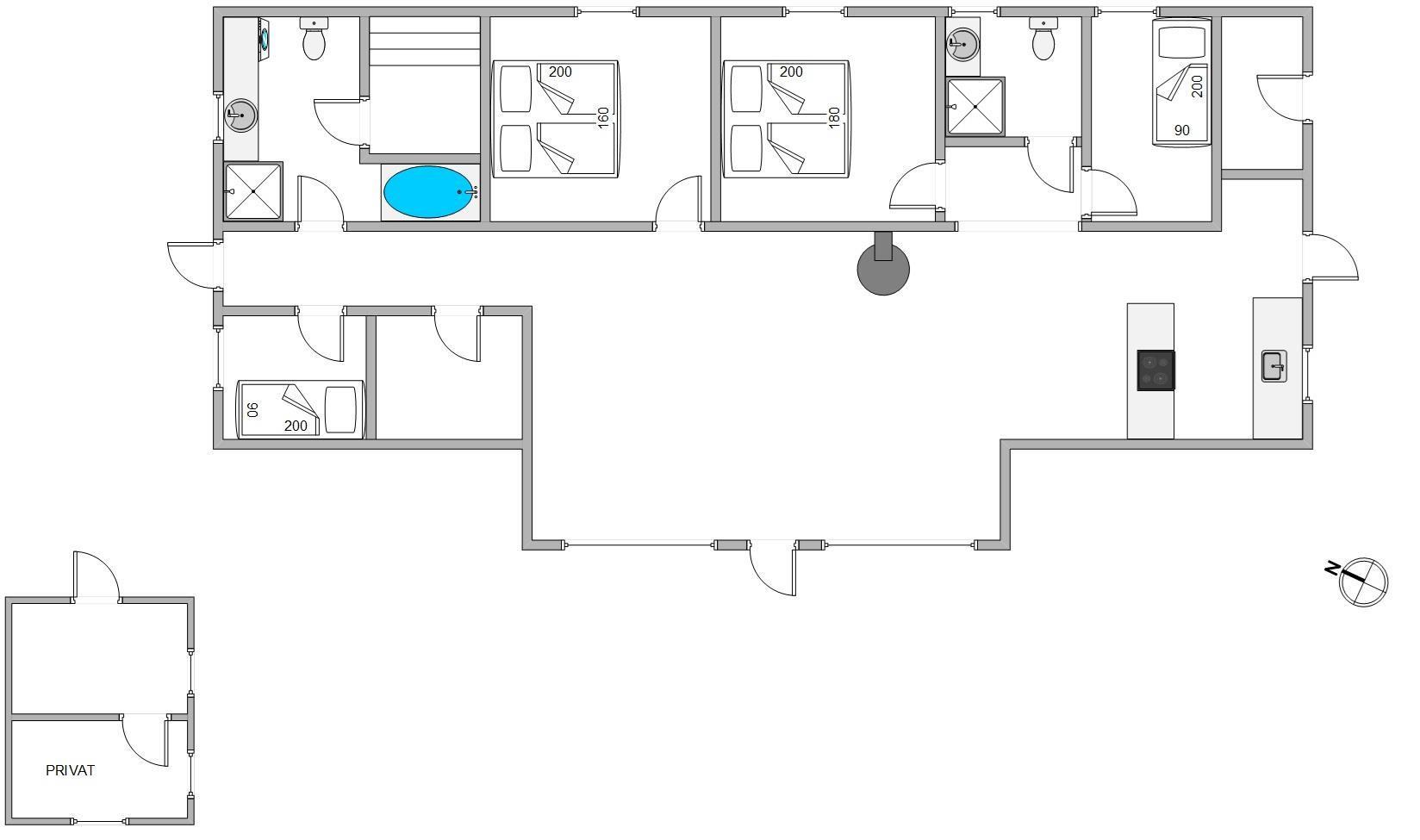 Der er to badeværelser, begge med gulvvarme og bruseniche. Det store badeværelse har endvidere en spa, en sauna og en combi vaskemaskine/tørretumbler. I køkkenet er der en fryser på 40 liter, en opvaskemaskine og en mikroovn.