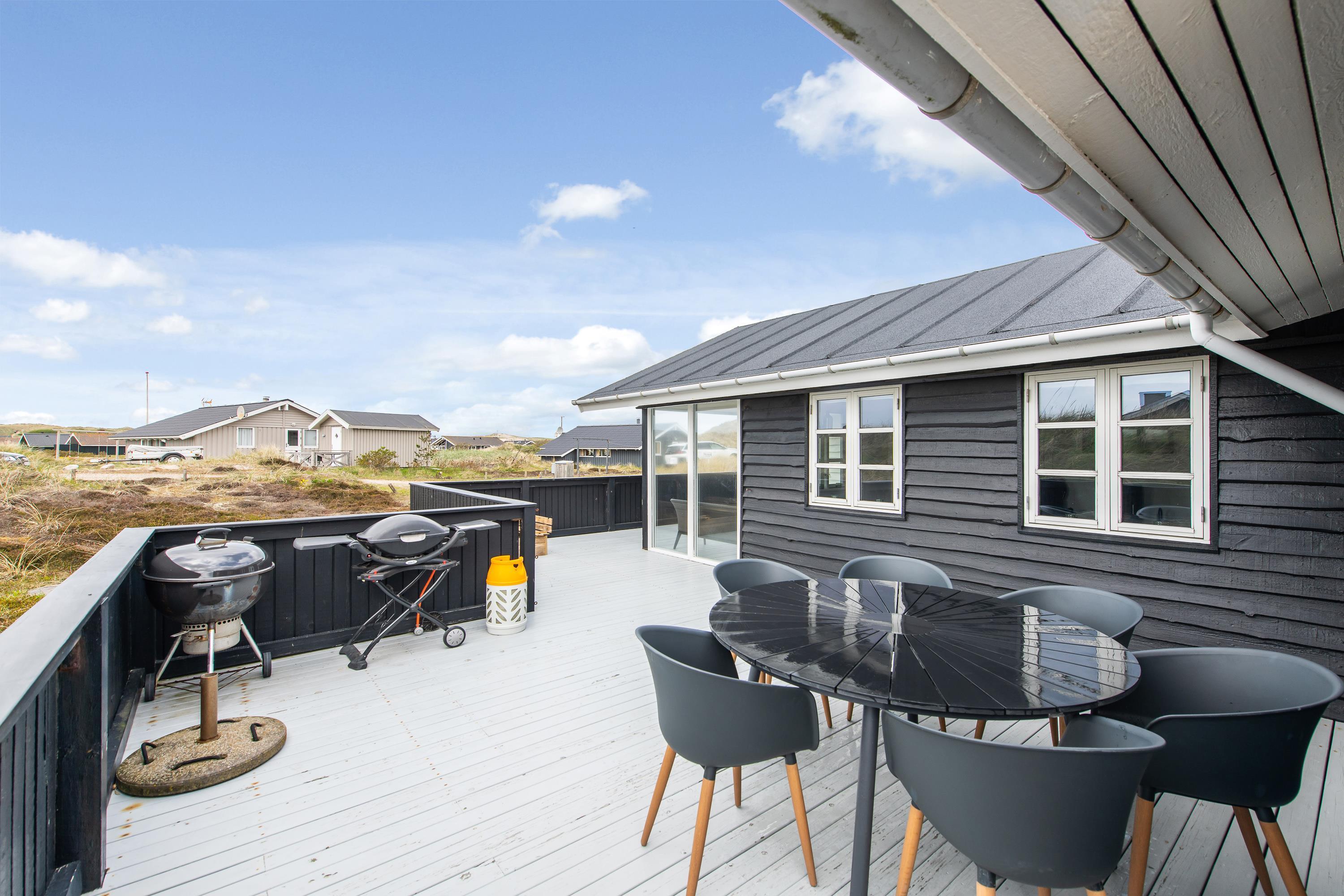 Halvvejs rundt om sommerhuset løber en lukket, delvist overdækket træterrasse. Her er der masser af hyggelige kroge, hvor I kan sidde og nyde solen i ro og fred. Lav en god grillmiddag på en lun sommeraften, da der både er gasgrill og kulgrill ved huset, og nyd middagen i den lune aftensol, mens morgendagens planer bliver lagt.