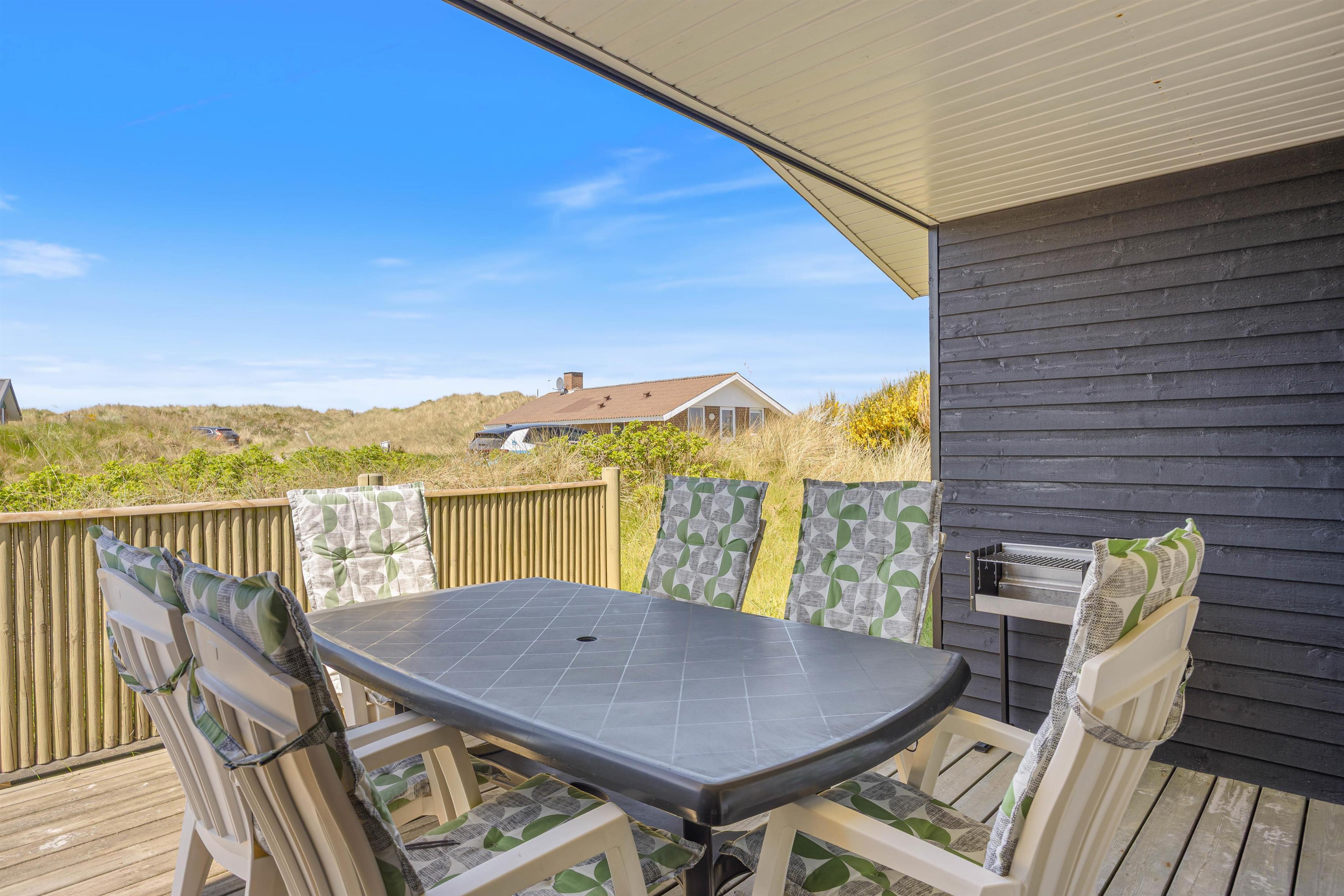Terrassen omkring sommerhuset er delvist afskærmet af stakit, buske og små klitter med marehalm. De komfortable havemøbler byder på afslapning. De mange kroge gør, at du altid kan finde en rolig plet, hvor du kan nyde en kop te eller en god bog.
