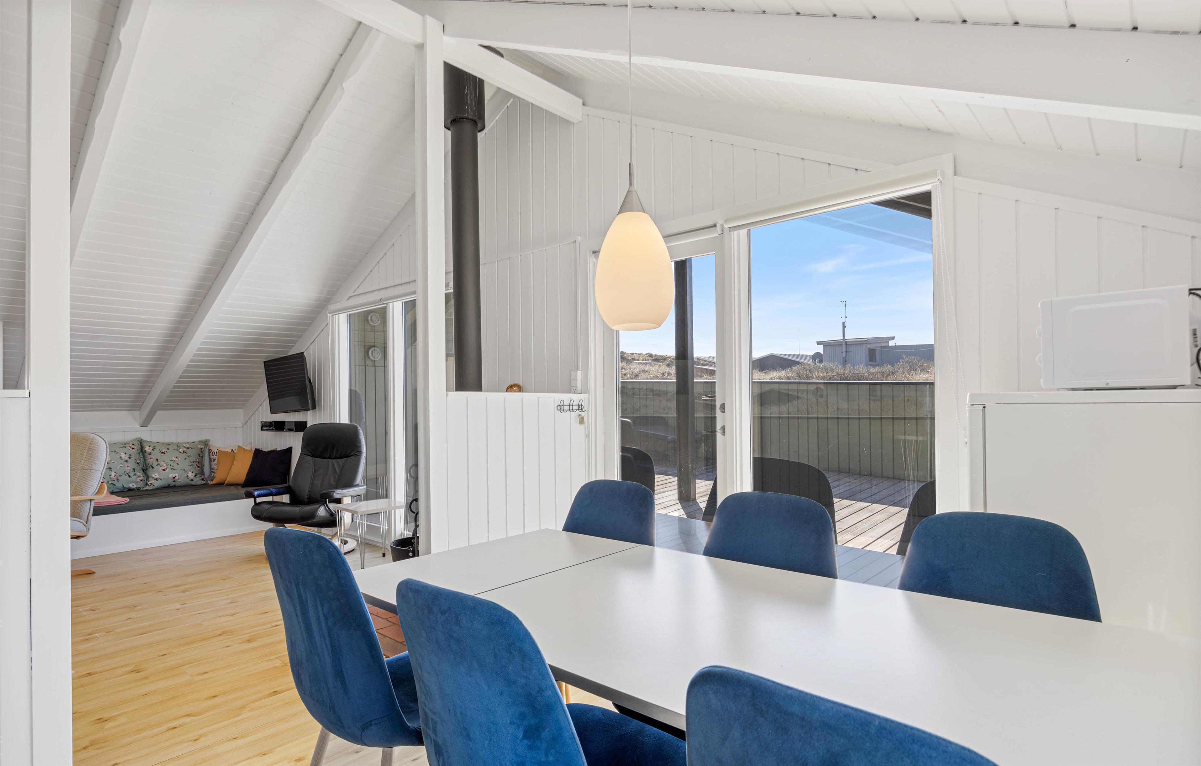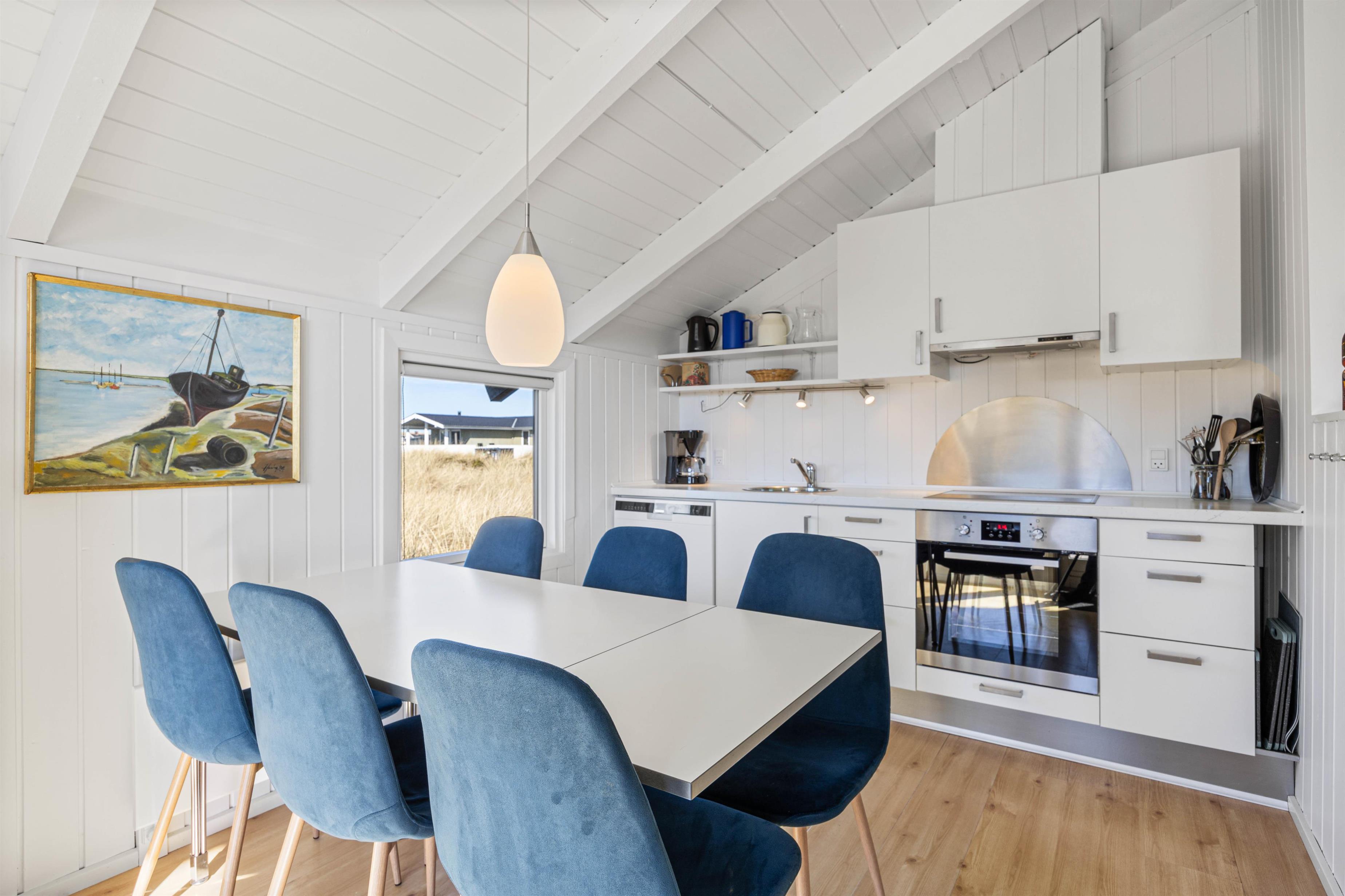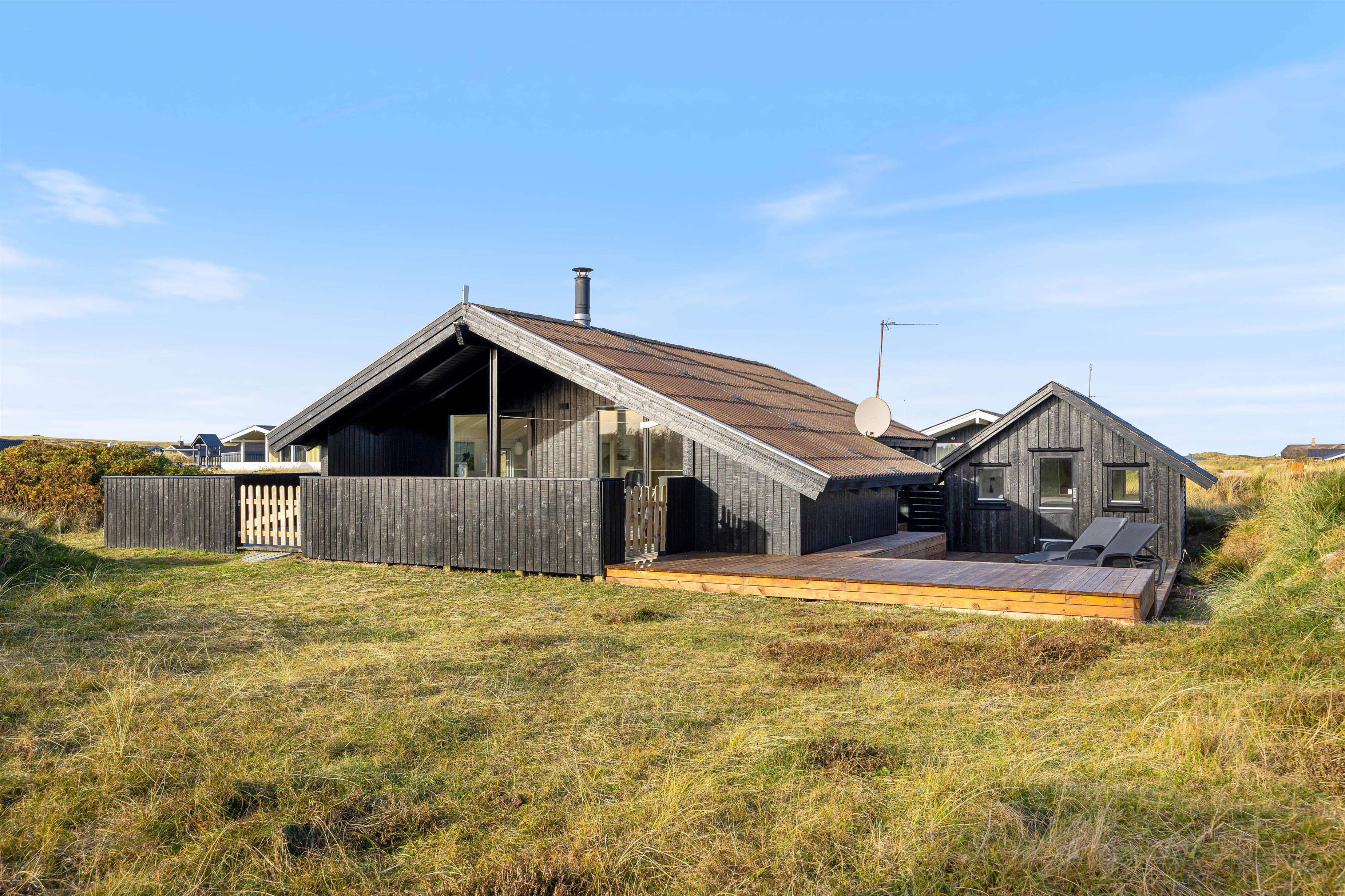 Udenfor venter en delvist overdækket terrasse mod syd og vest, som er perfekt til både afslapning og hyggelige stunder sammen. I foråret 2025 er der desuden anlagt en stor terrasse mellem sommerhuset og annekset – et skønt område med masser af plads til at nyde ferien i det fri. På terrassens vestside kan I sidde i aftensolen og nyde stilheden, måske med et glas vin og udsigt til den smukke himmel over klitterne. Her finder I både havemøbler, liggestole og grill – ideelt til en lang sommeraften med grillmad og måske en friskfanget fisk fra Ringkøbing Fjord. Hvis I ikke selv har fiskelykken med jer, kan I tage en tur til den stemningsfulde havneby Hvide Sande, kun 15 minutters kørsel væk, hvor der er mulighed for at købe frisk fisk og opleve det lokale havnemiljø.