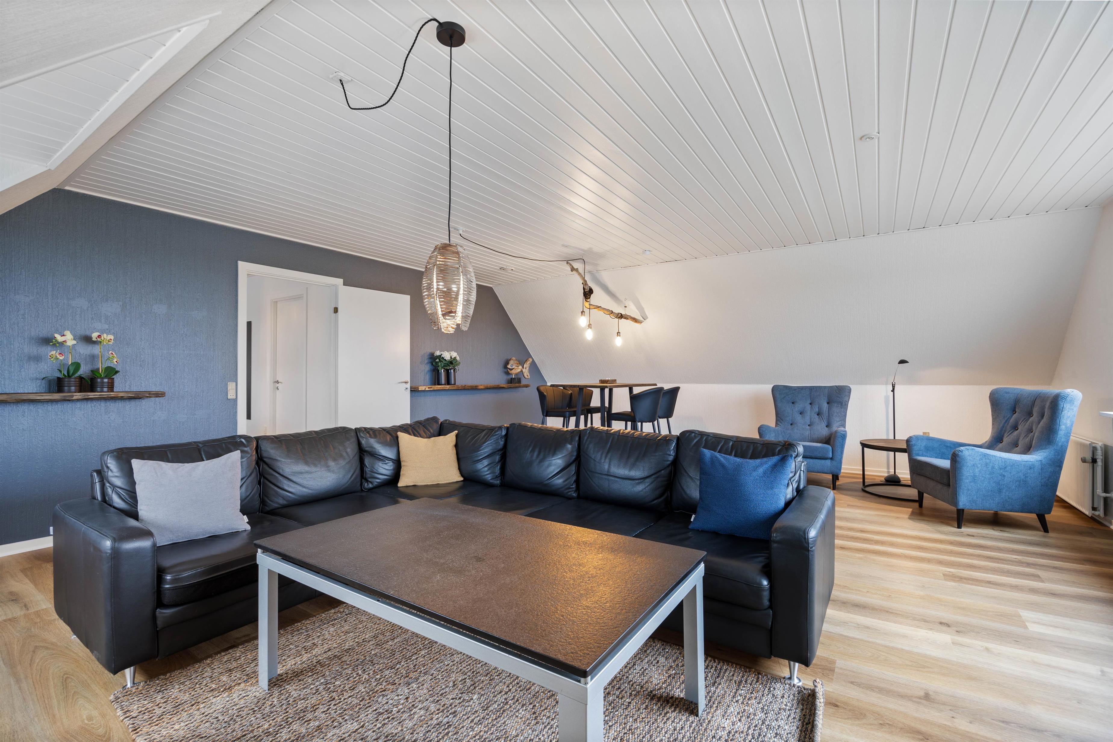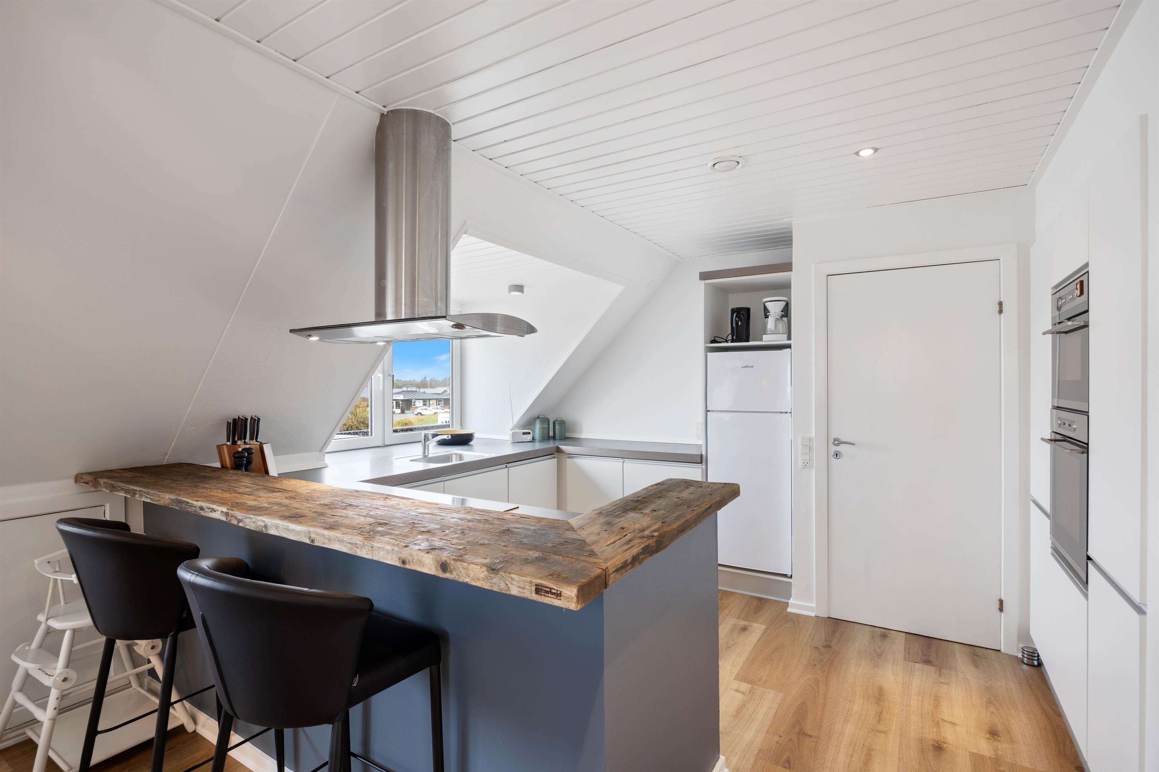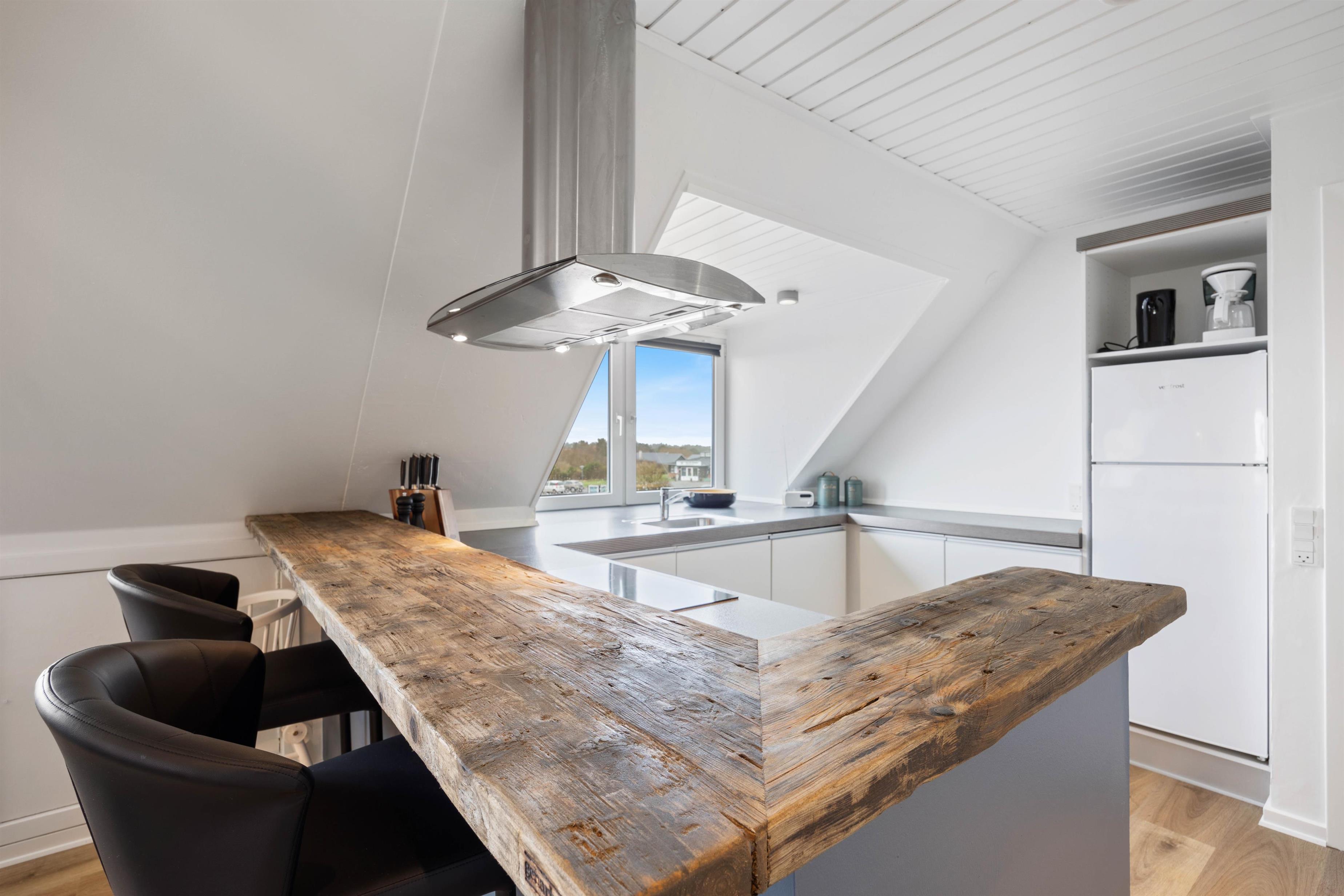 Lejligheden er lyst og venligt indrettet med et dejligt lysindfald og vidtstrakt udsigt gennem de mange vinduer. I den hyggelige stue kan I slappe af i hjørnesofaen eller trække jer tilbage med en god bog i lænestolene. Her er også et ”barbord”, hvor I kan nyde en drink eller spille et brætspil. Det praktisk og hyggeligt indrettede spisekøkken med opvaskemaskine indeholder alt, hvad I behøver for at tilberede lækre måltider.