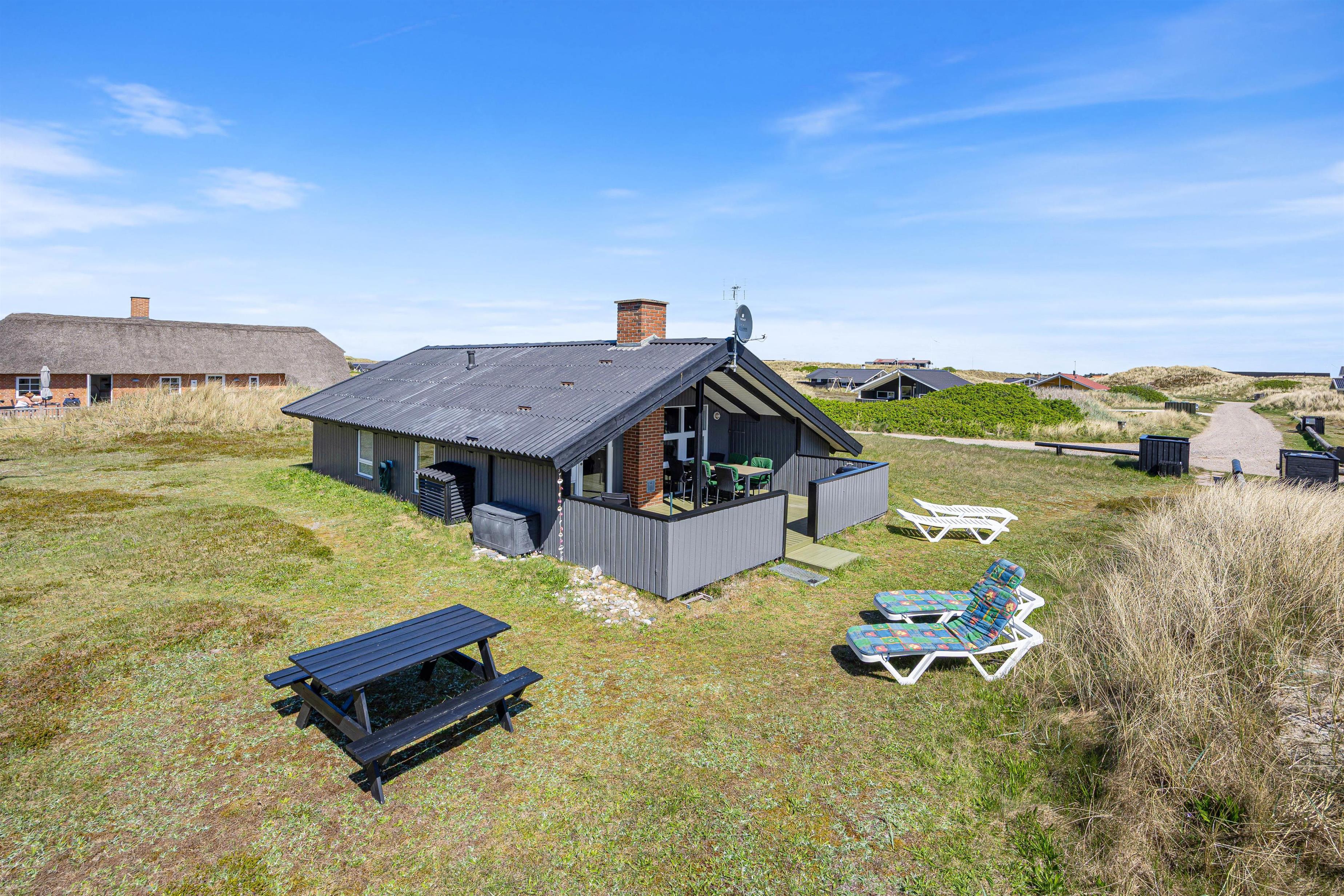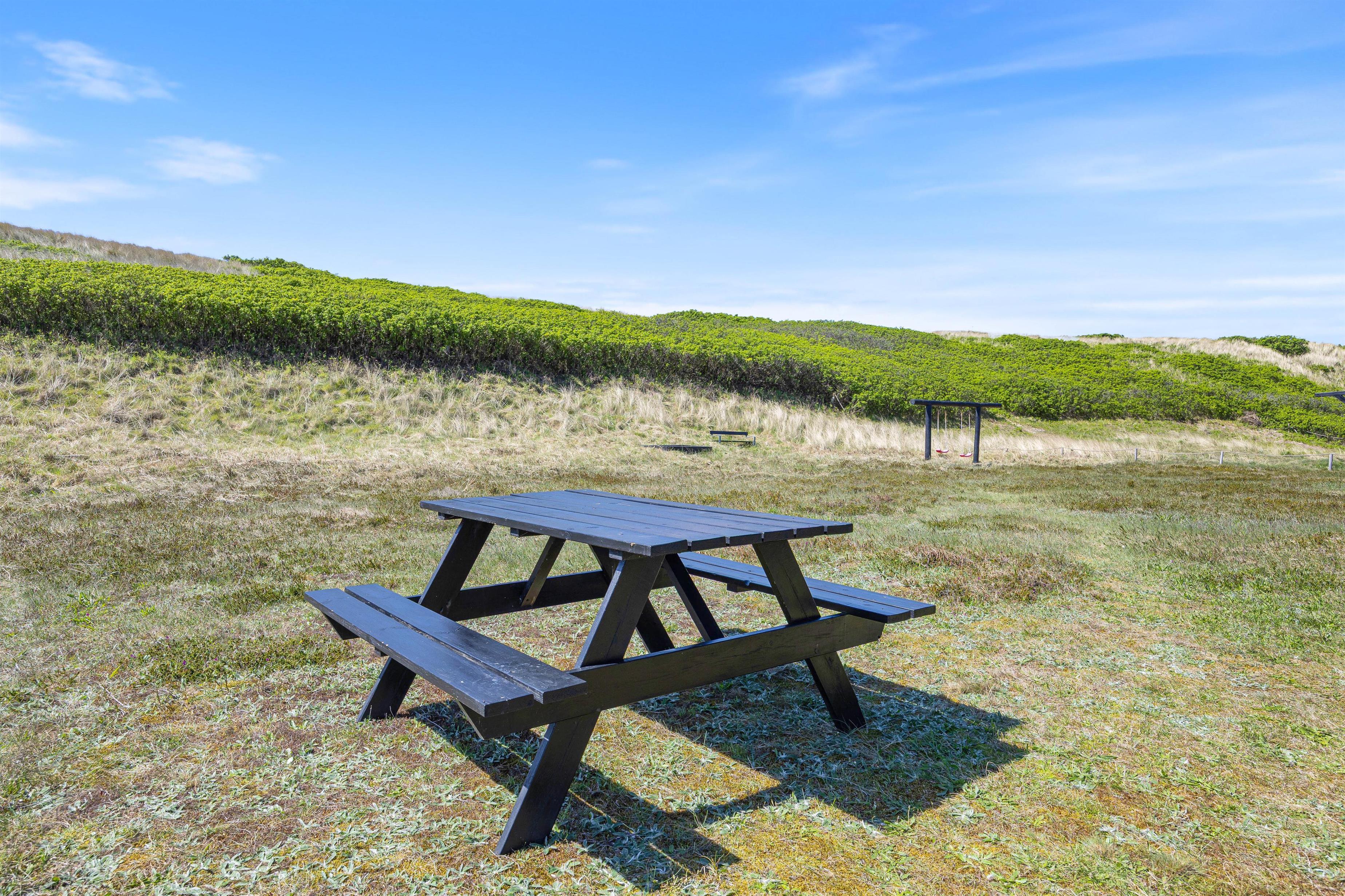 På den afskærmede træterrasse kan I starte dagen i læ for vinden eller nyde solnedgangen over klitterne om aftenen. Den store naturgrund er omgivet af hede, marehalm og sandstier – perfekt til gåture med hunden eller leg i sandet med børnene. Stranden ligger kun få skridt væk – følg blot stien over klitten. Indkøbsmuligheder finder I kun 900 meter fra sommerhuset.