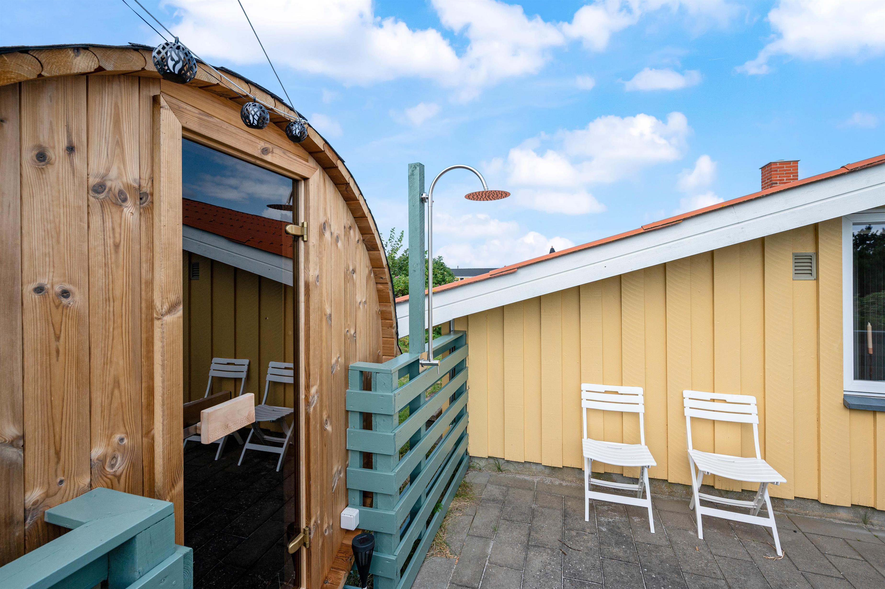 Fra stuen er der direkte adgang til feriehusets fine terrasse med vildmarksbad, sauna og udebruser (udebruseren kan benyttes fra april til november). Her kan hele flokken nyde de solrige sommerdage – uanset om det er i solen eller i skyggen på terrassen overdækkede del. Praktisk er terrassen lukket, så småbørn og hundene kan bevæge sig frit omkring. Til familiens mindste gemmer sig både sandkasse og gynge.