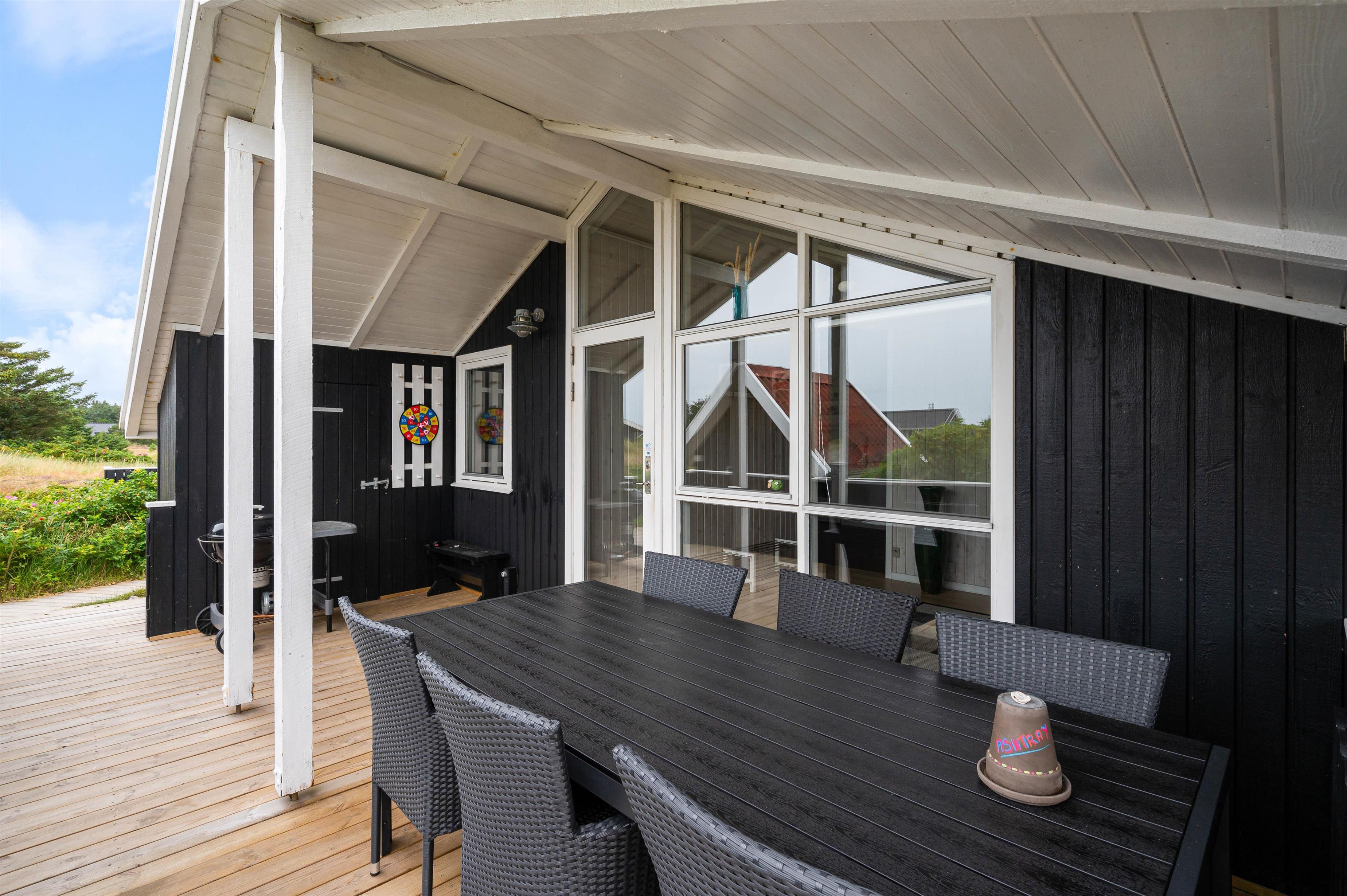 På den brede træterrasse, som løber omkring feriehuset, kan I rykke rundt efter sol og vind. Tag solbad på liggestolene eller slap af i havemøblerne - Der er mange kroge, så I altid kan finde en god plet at opholde jer på. Tænd op i grillen til aften og nyd et lækkert grillmåltid sammen. Bagefter kan I nå en tur til Vesterhavet, hvor I kan betragte solnedgangen. En solnedgang i Vesterhavet er altid en oplevelse – uanset vejret.