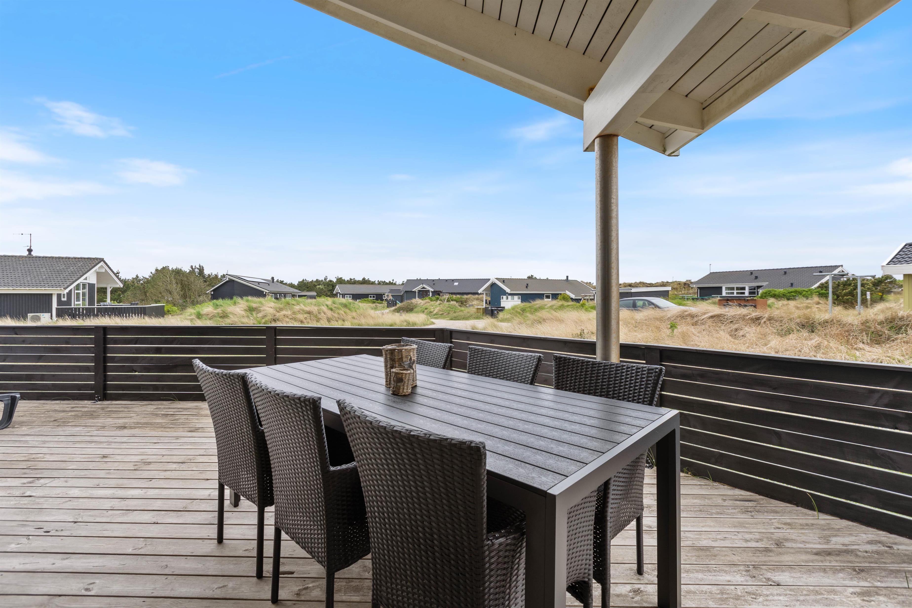 Sommerhuset er omgivet af en delvist overdækket træterrasse. Afhængigt af solens position og vindretningen kan du altid finde en krog, hvor du kan trække dig tilbage med en god bog og en kop te. Eller du kan solbade i liggestolene og trække dig ind i skyggen, når solen bliver for stærk. Imens kan børnene gå på opdagelse på naturgrunden. Hvad med et spil vikingeskak? Når dagen går på hæld, kan I tænde op i grillen og nyde et lækkert grillmåltid, imens solen går ned bag klitterne. Med under 1 kilometer til stranden kan I nå at nyde solnedgangen i Vesterhavet. Det er altid en storslået oplevelse.