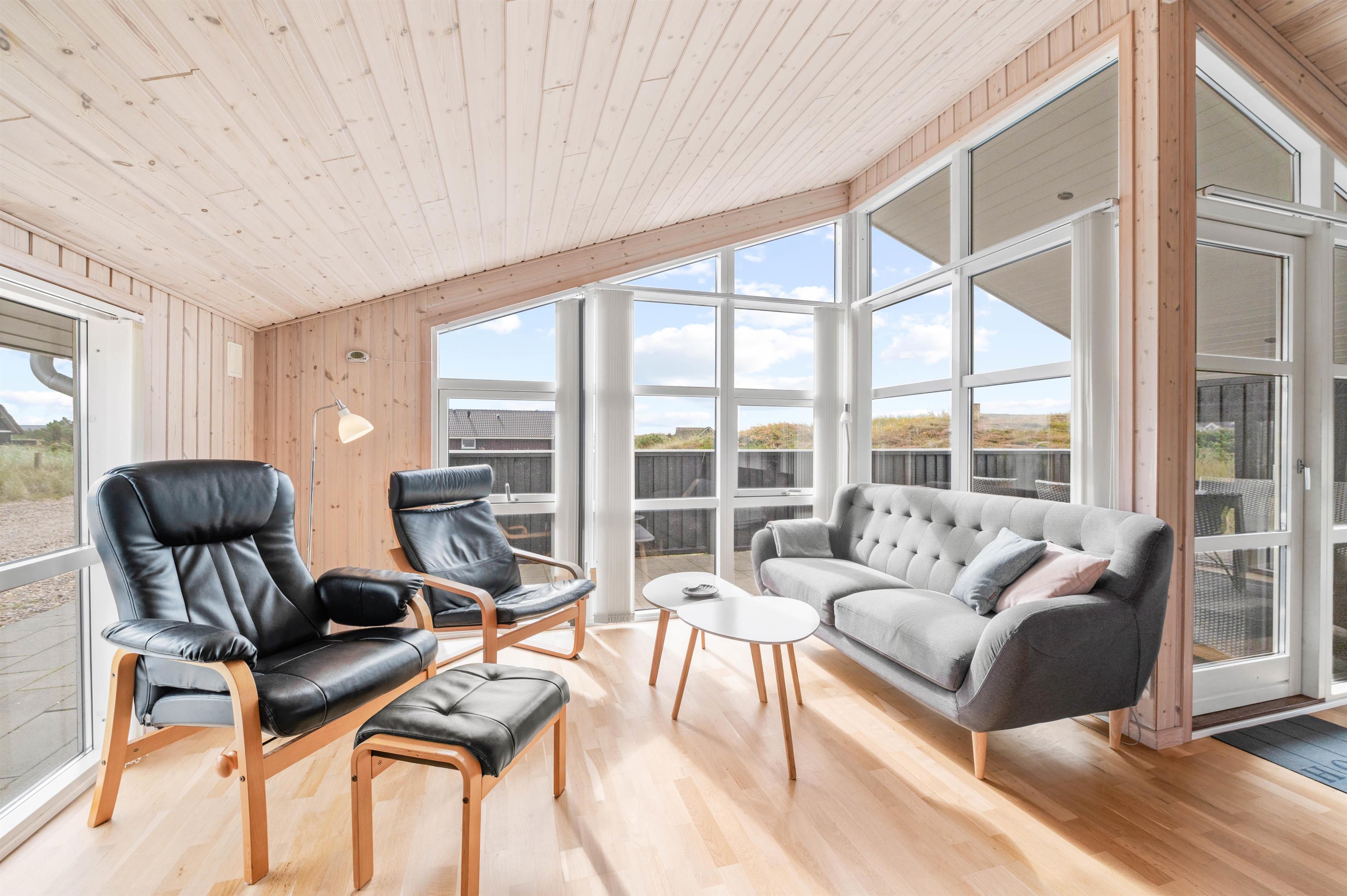 Indenfor byder sommerhuset på en lys og venlig atmosfære med god plads til både familie og venner. Sommerhuset har 3 soveværelser, alle med gode boksmadrasser og praktisk skabsplads. Badeværelset er flot og funktionelt med gulvvarme, bruseniche og adgang til husets sauna, hvor I kan slappe af efter en frisk gåtur ved havet.