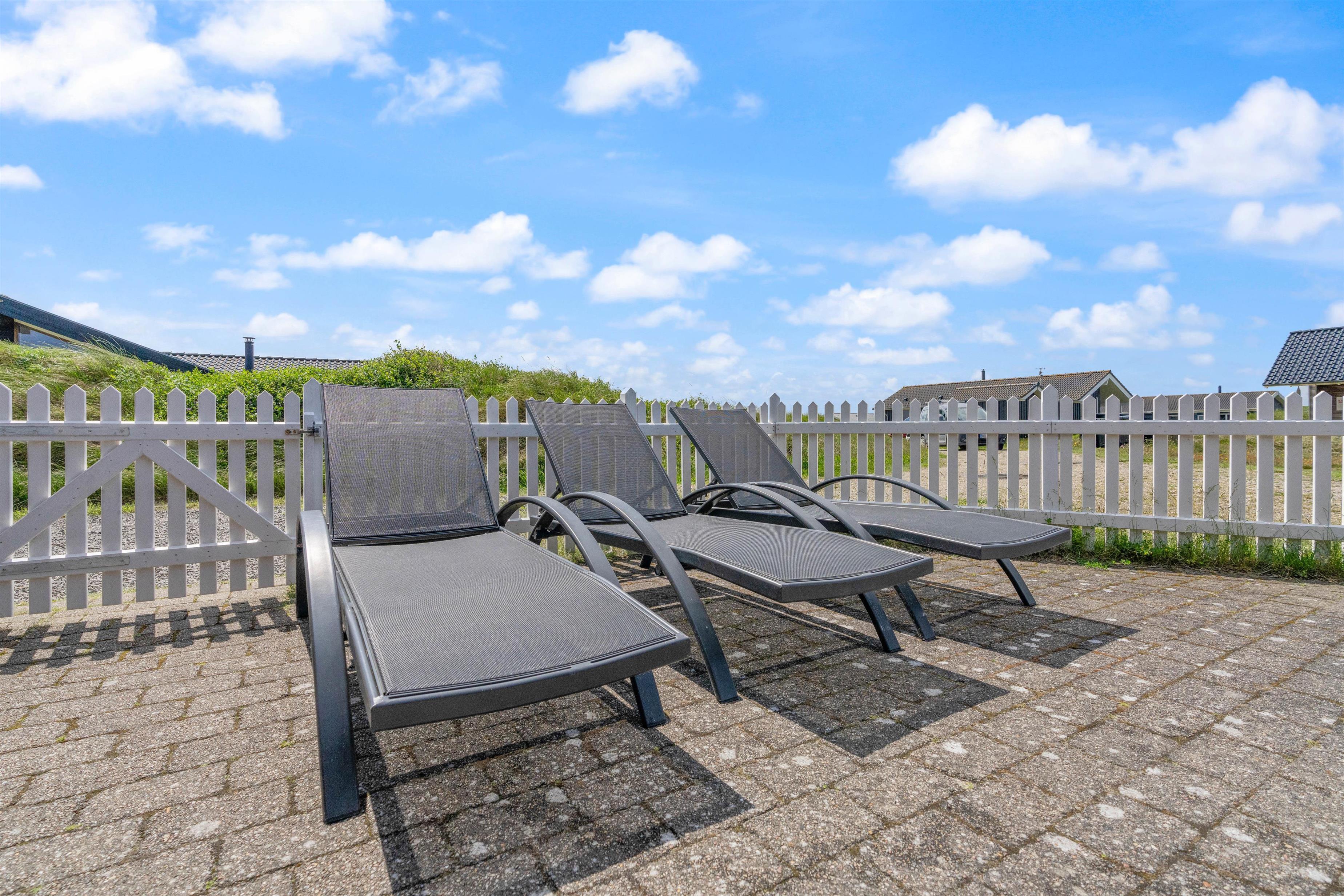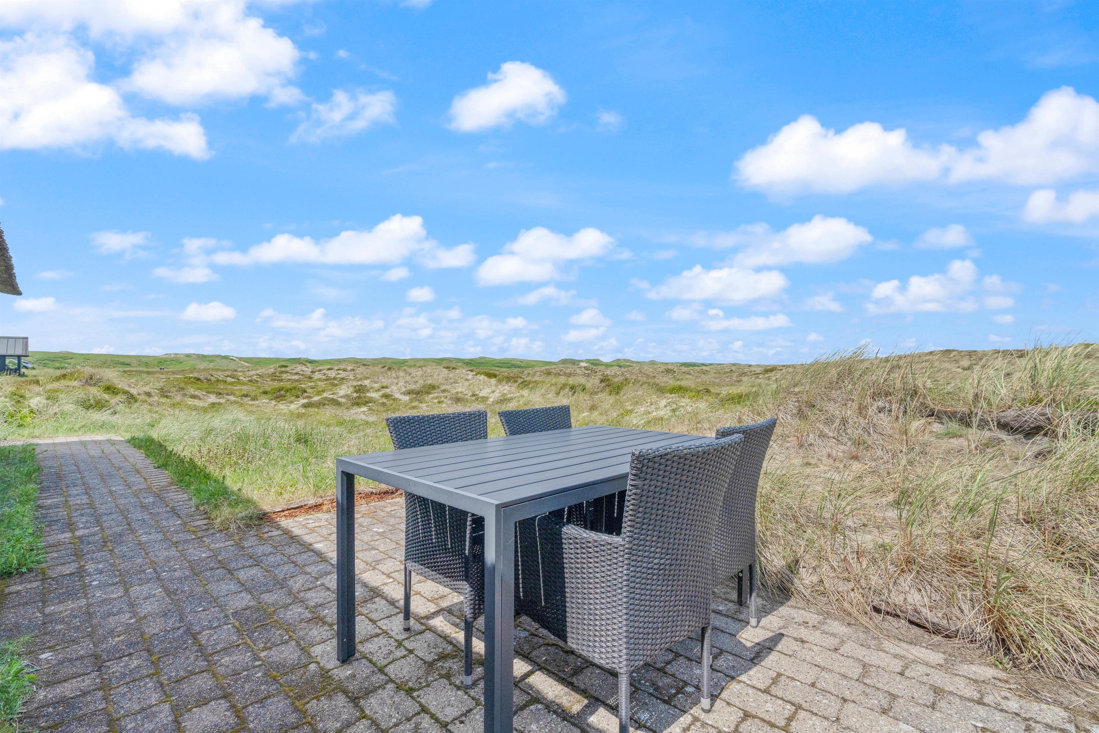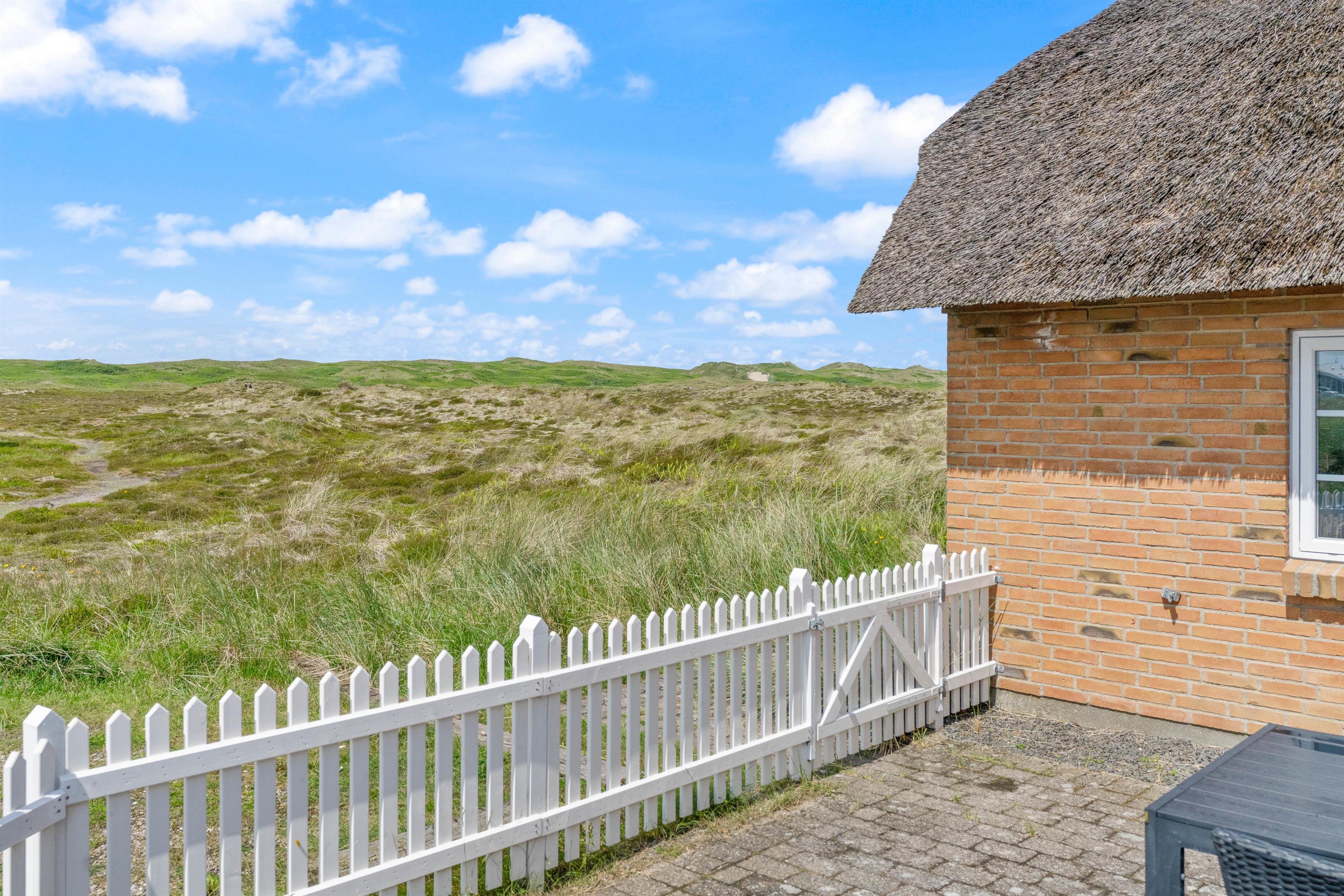 Omgivet af den 1200m² store naturgrund har I forskellige siddemulighed omkring sommerhuset og kan nyde udsigten ud over naturen med hede- og klitlandskabet omring jer. På den lukkede terrasse er der komfortable havemøbler og liggestole, som indbyder til afslapning. Her kan du også lade dine små børn og dine hunde løbe frit omkring, uden at de udforsker omgivelserne uden dig.