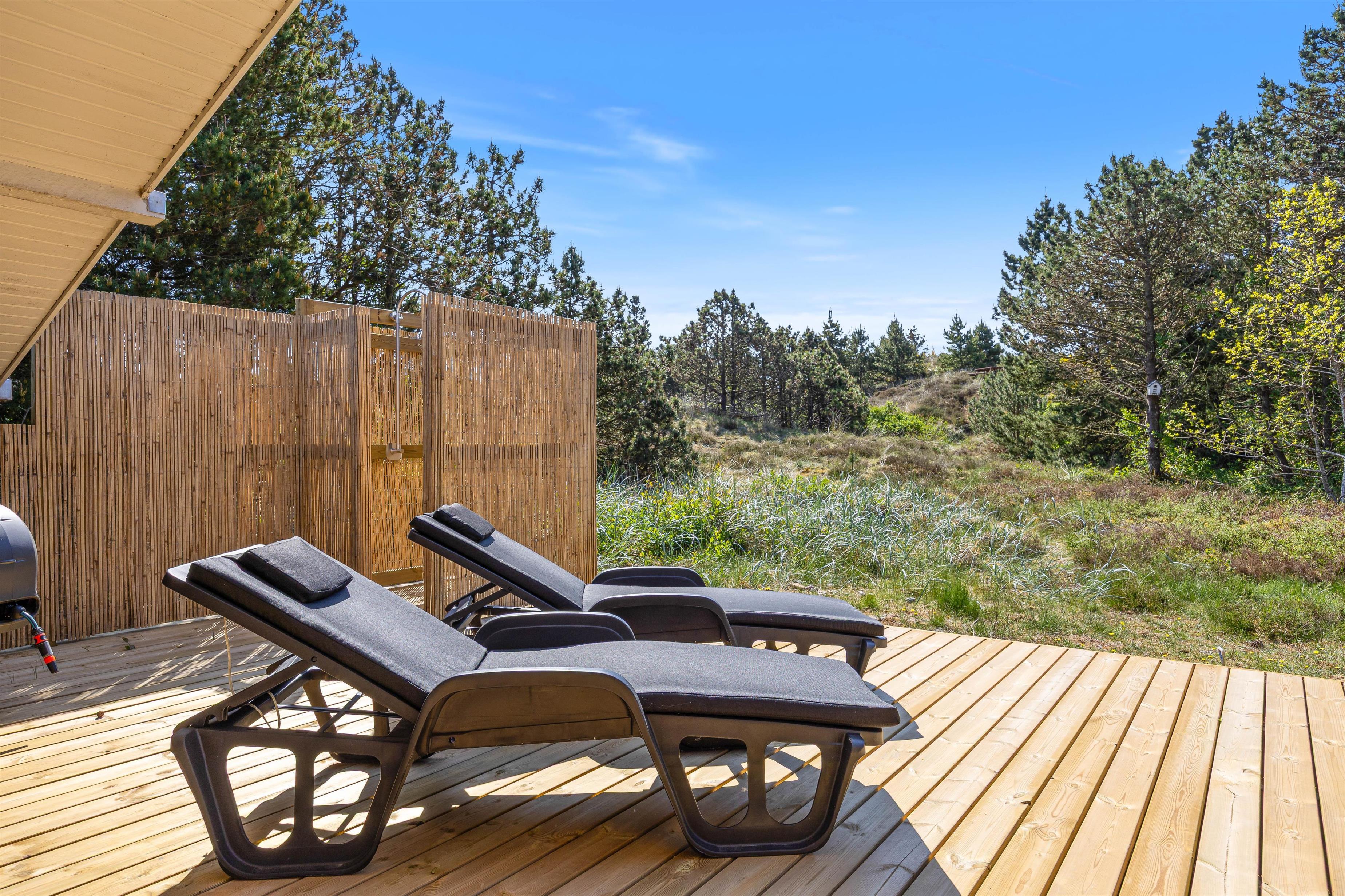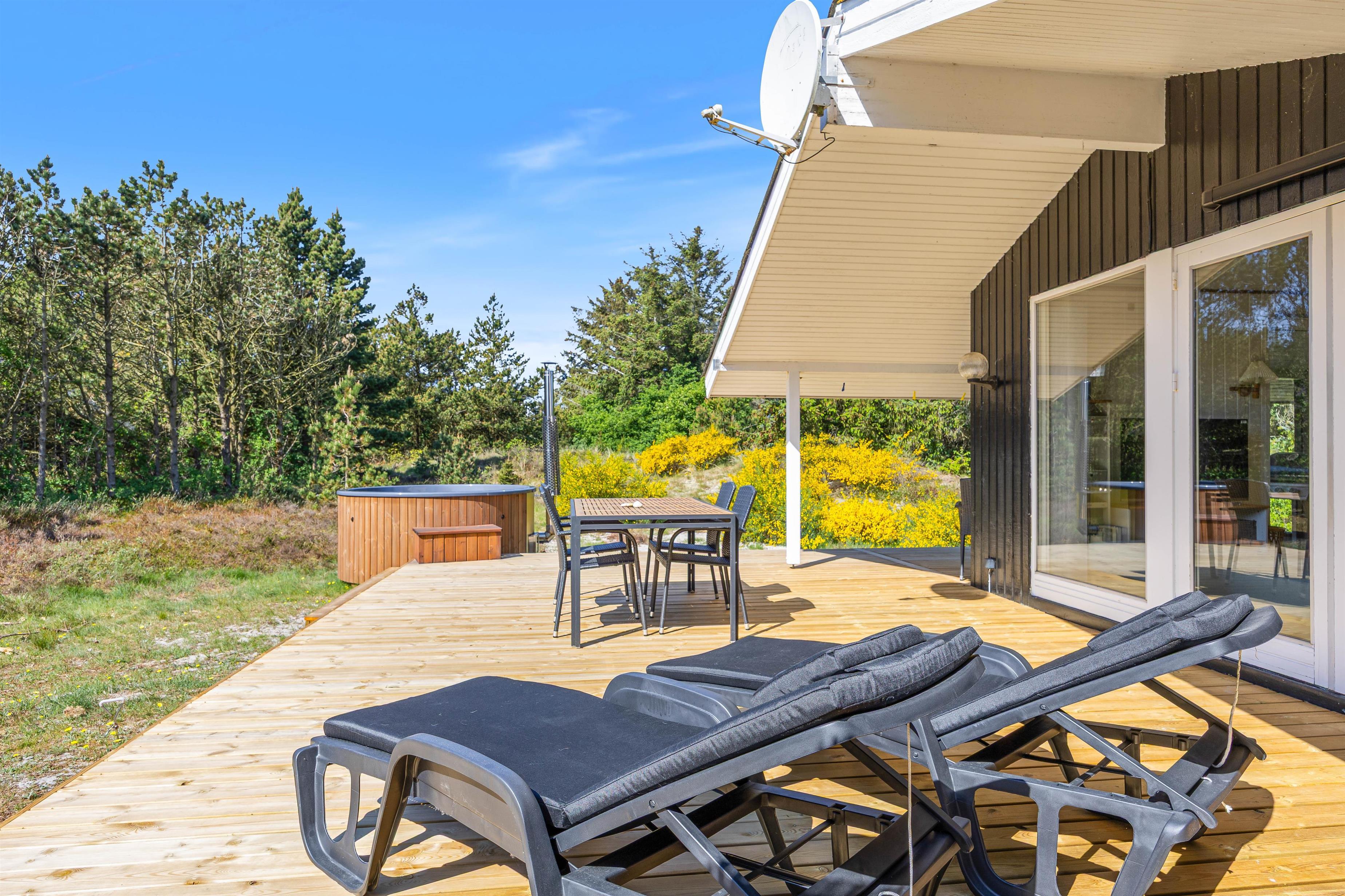 På den 1456 kvadratmeter store naturgrund kan alle feriegæster boltre sig og slappe af. Udeområdet er udstyret med havemøbler, liggestole og en grill, ideel til hyggelige aftener. Den rummelige terrasse, der delvist er overdækket, indbyder til ophold i al slags vejr. Tænd op i grillen, mens skyggerne bliver lange, og nyd et lækkert grillmåltid sammen. Bagefter kan I hoppe en tur i vildmarksbadet eller gå en tur til stranden og opleve solnedgangen ud over Vesterhavet. Sommerhuset har desuden en udebruser med koldt vand, der kan benyttes fra april til november.