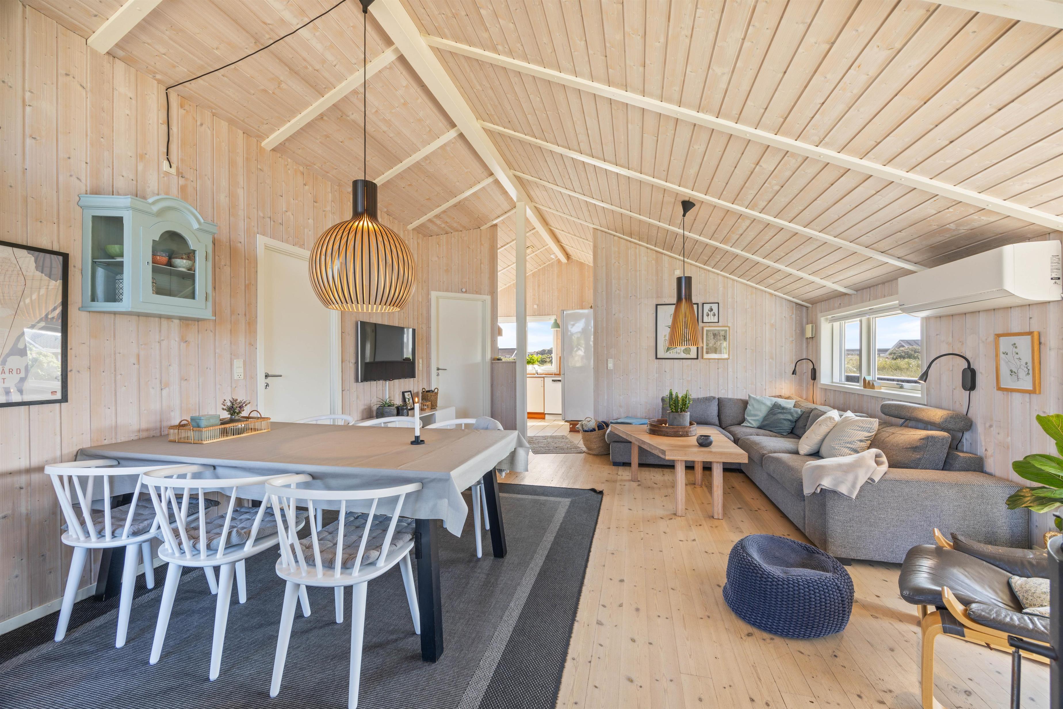 Den rummelige opholdsstue er det naturlige samlingspunkt i sommerhuset på Bjerregårdsvej 372. Her kan du hygge dig foran brændeovnen med en god bog, eller I kan se en film sammen. Ved spisebordet kan I arrangere en spilaften.