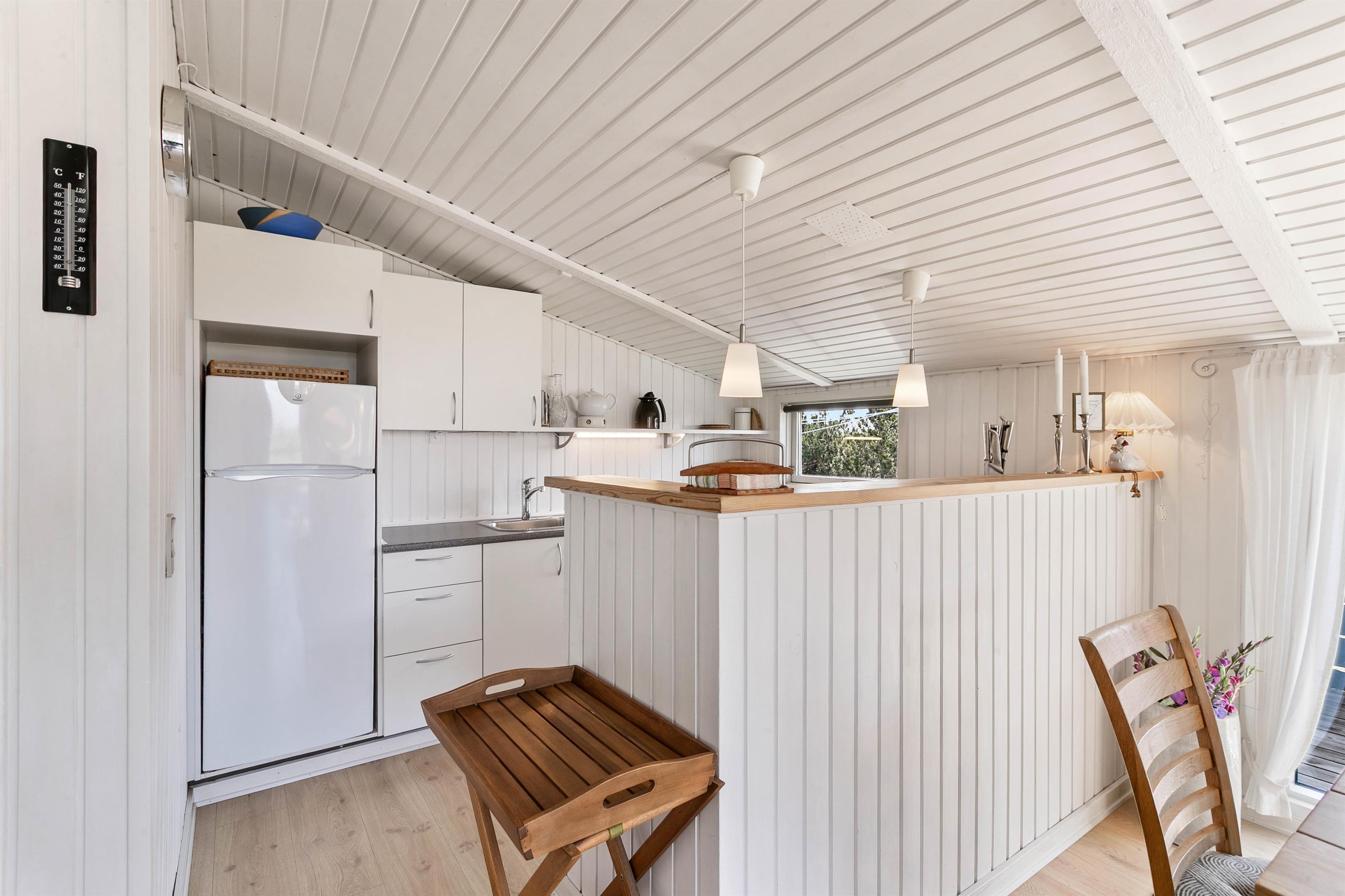 Sommerhuset er godt opdelt med de 4 soveværelser i den ene ende, og køkkenalrummet og stuen i den anden. Køkkenalrum og stue danner sammen sommerhusets hjerte. De store vinduer giver udsyn til det vestjyske klitlandskab, og brændeovnen varmer jer på selv de koldeste vinterdage.