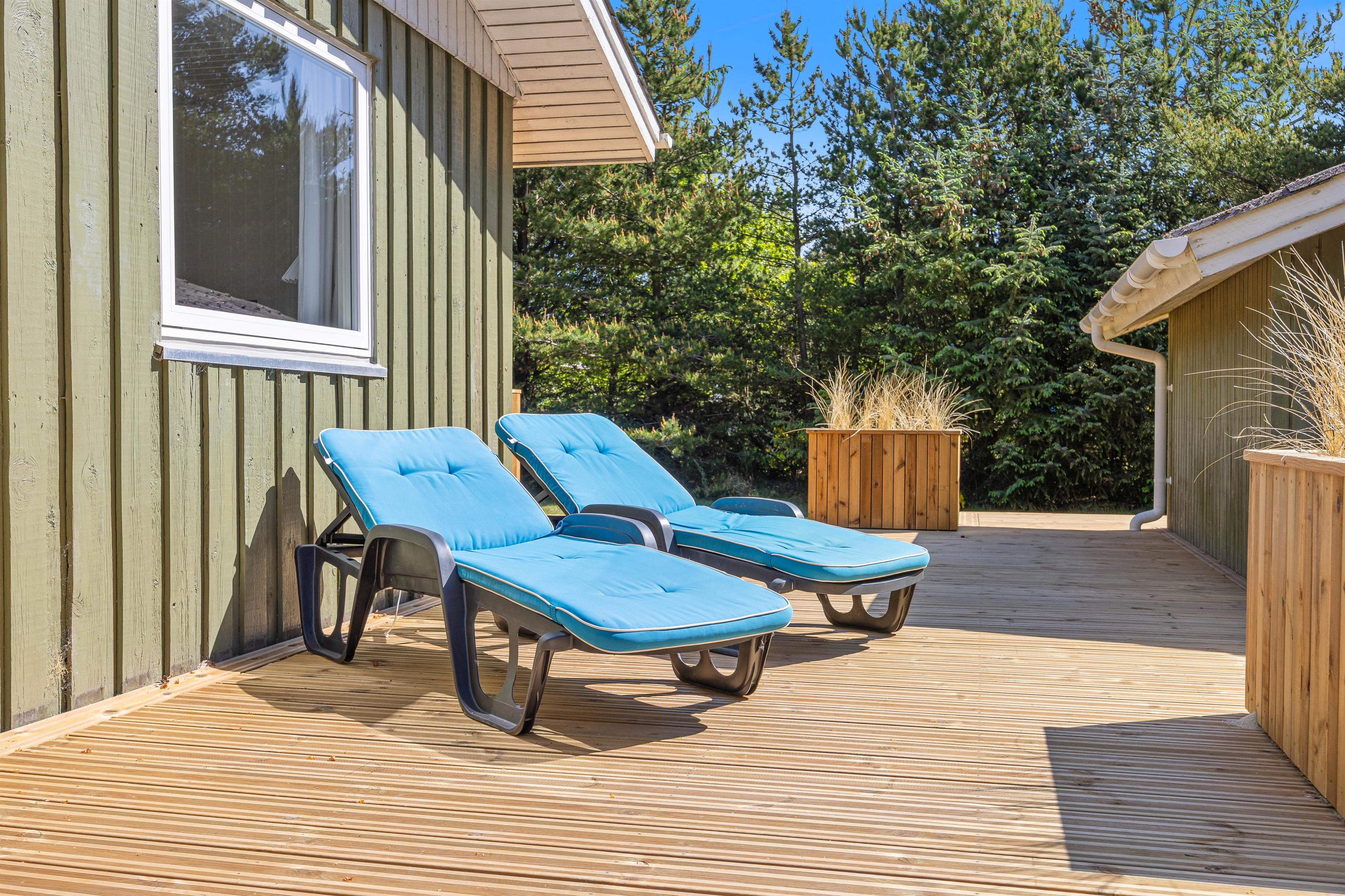 På de store træbeklædte og delvist overdækkede terrasser finder du naturligvis havemøbler, liggestole og en grill til de kulinariske udfoldelser.