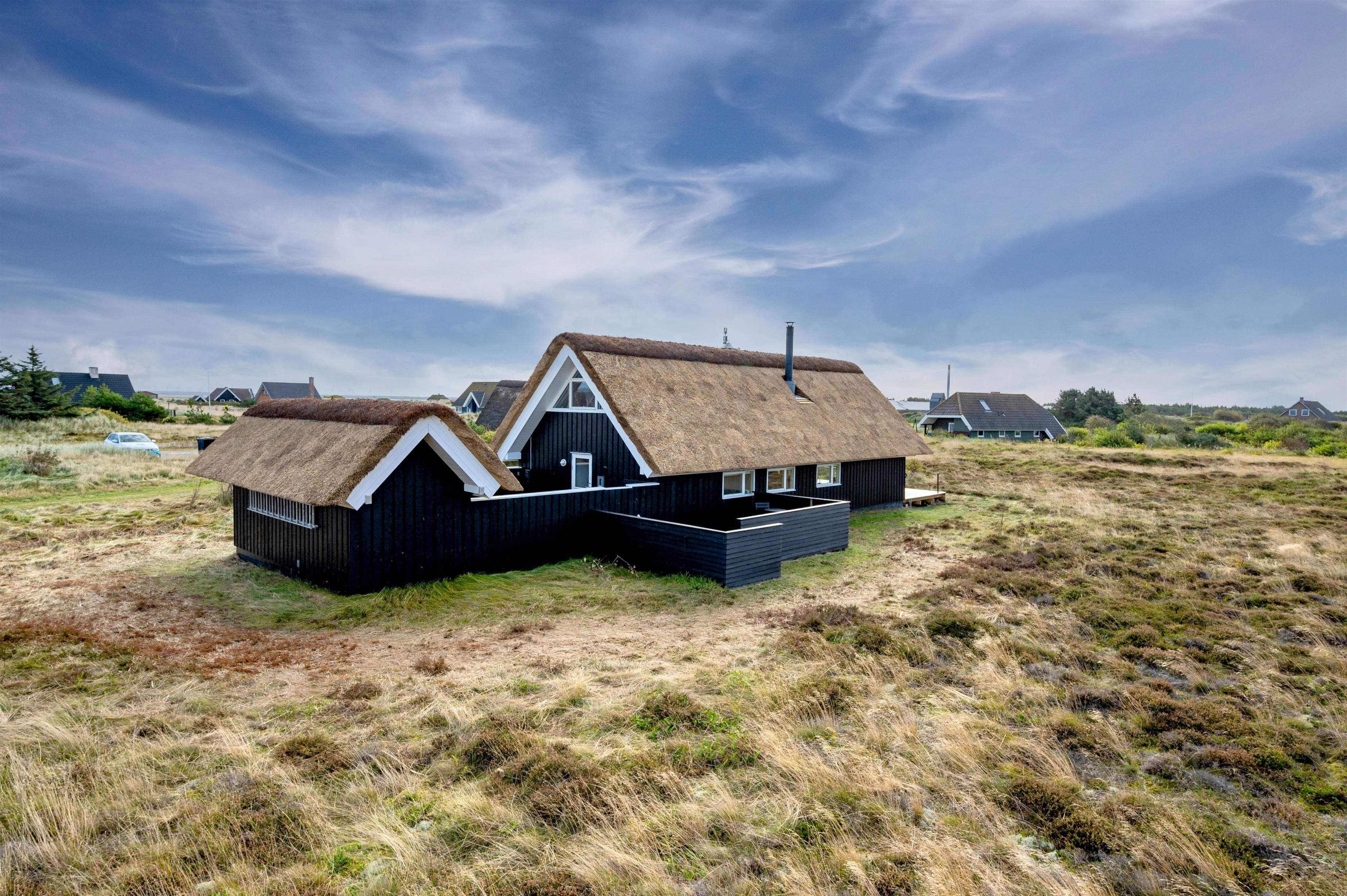 Dette charmerende og velindrettede sommerhus med stråtag ligger i Bjerregård, ca. 15 kilometer syd for Hvide Sande. Her er skønt at være, såvel inde som ude. Feriehuset ligger på en stor naturgrund, og fra stuen er der en dejlig udsigt til den smukke natur. På en blæsende dag, finder du læ enten i den hyggelige, lille gårdhave eller på en af de fine terrasser.