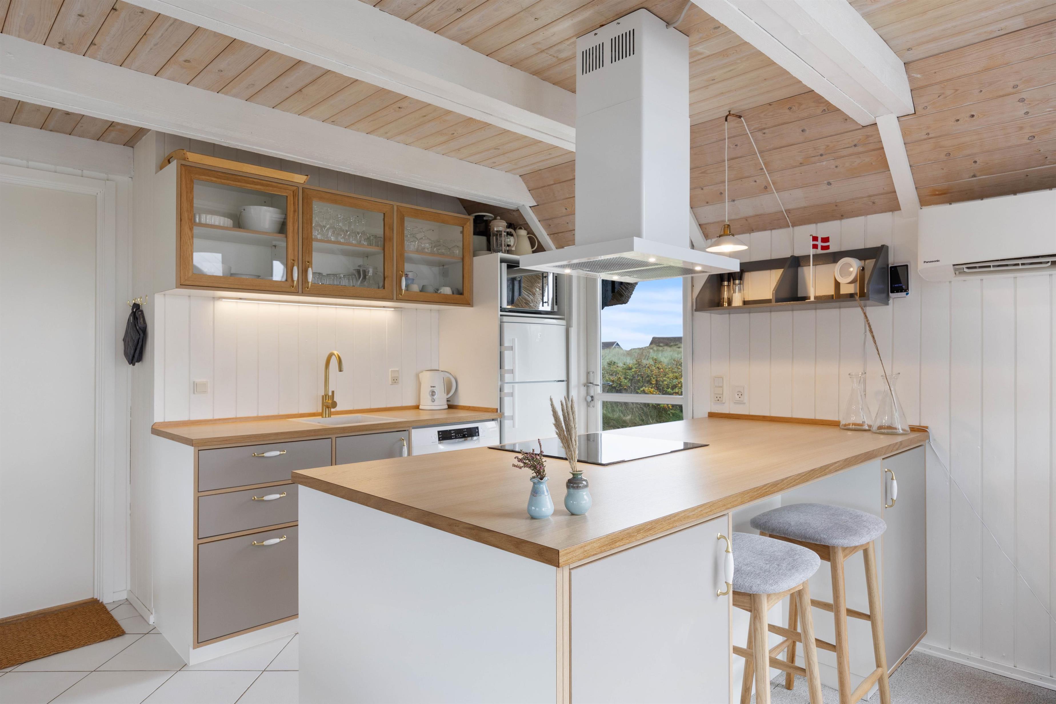 Køkkenet er lyst og velindrettet med opvaskemaskine i åben forbindelse med det skønne opholdsrum. Centrum i stuen er den flotte brændeovn, som kan varme hele rummet op på en kølig dag. Ligemeget hvor du befinder dig i stuen, har du udsigt til det smukke landskab, gennem de mange glaspartier. Her er åbent til kip og ovenlysvinduer, hvilket yderligere forstærker fornemmelsen af at være midt i naturen. Her er også en varmepumpe, som sørger for en behagelig temperatur.