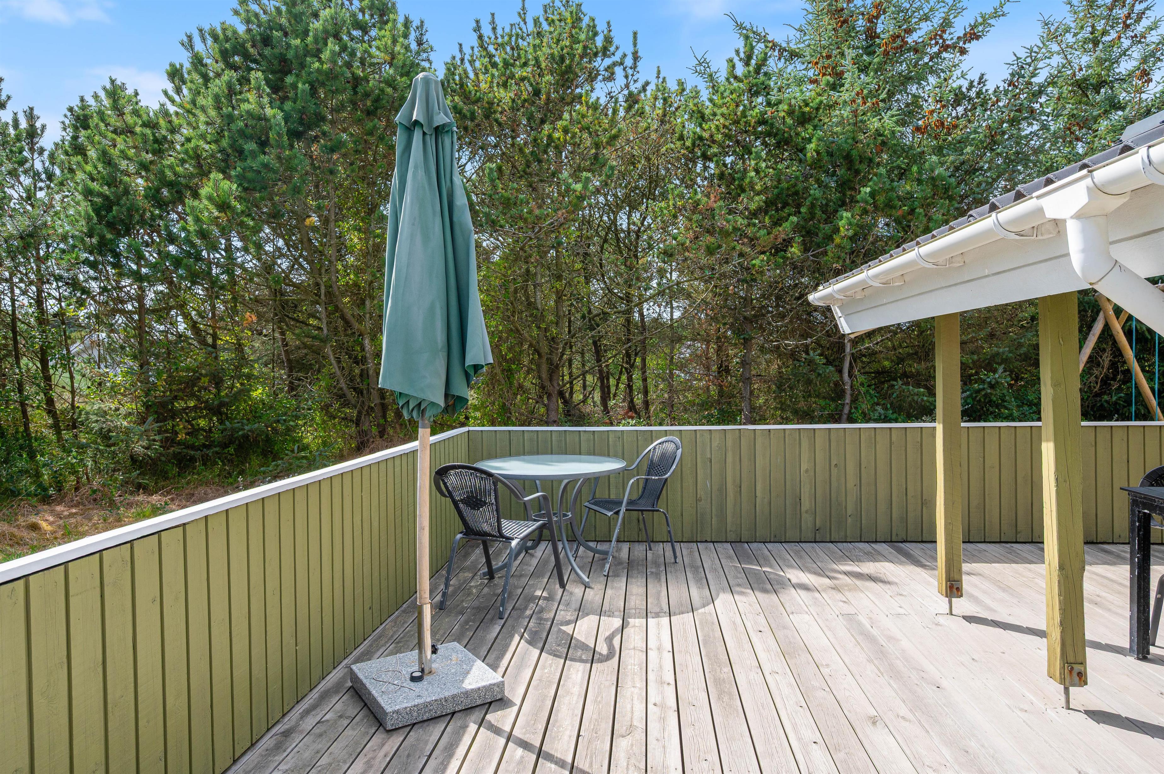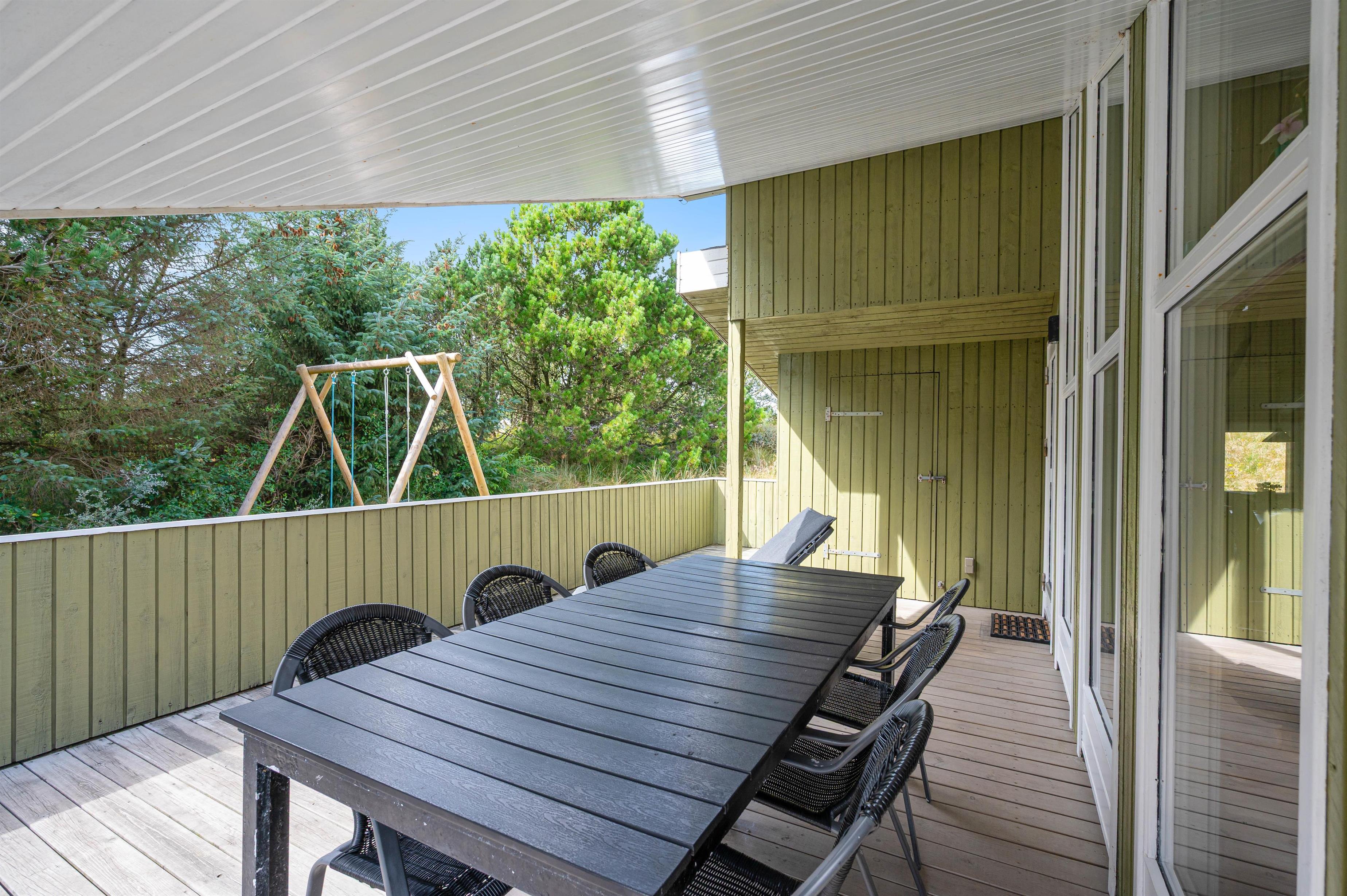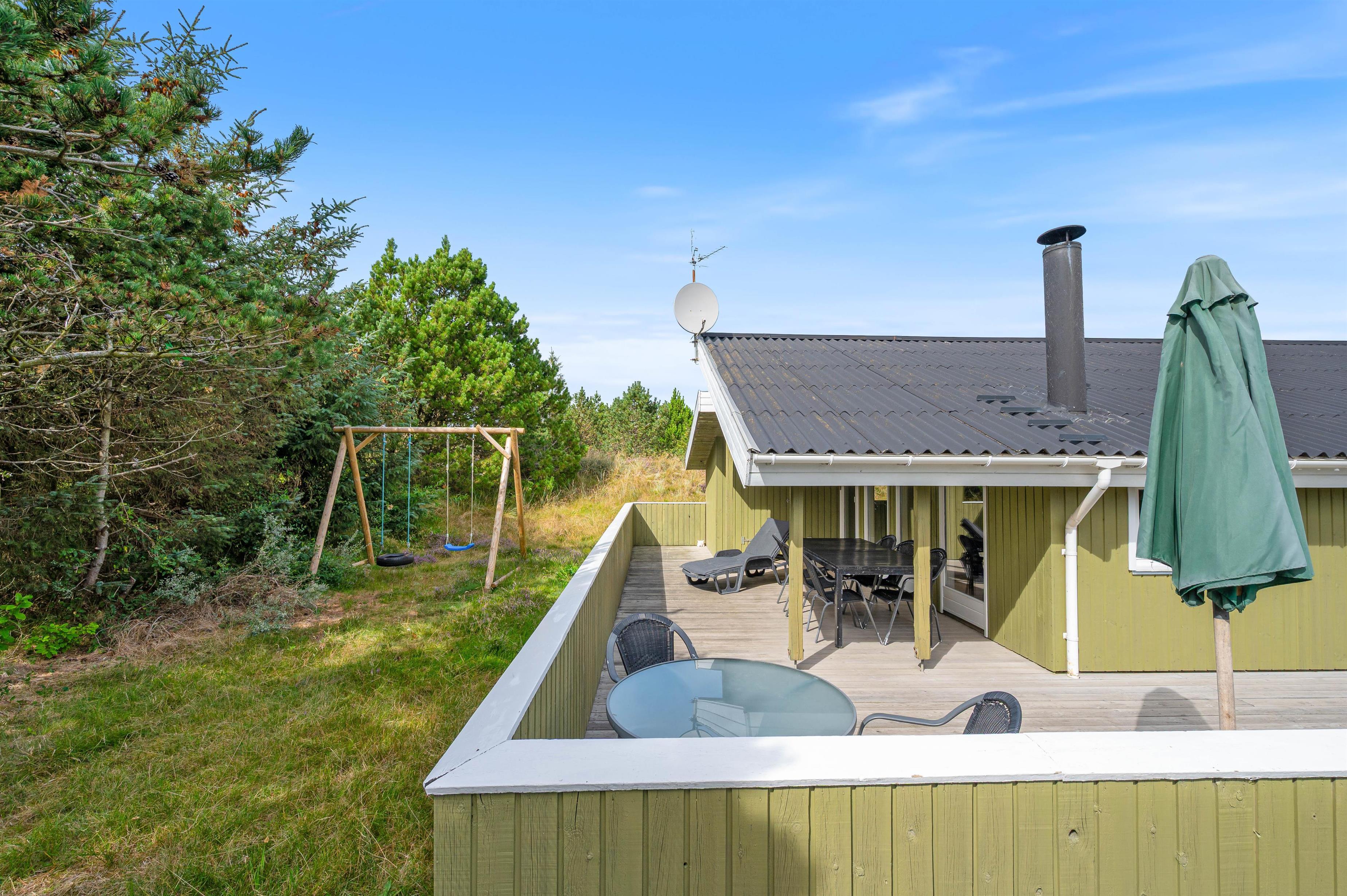 Til feriehuset på Bjerregårdsvej 25 hører en usædvanlig dejlig terrasse. Den er helt aflukket, så I sagtens kan lade småbørn stavre rundt på egen hånd. Terrassen strækker sig omkring tre af feriehusets fire sider og det er storset altid muligt for at finde et dejligt sted med læ. Og skulle den danske sommer vise sig fra sin drilske side, har terrassen også en god hyggekrog med halvtag og afskærmning, så I kan sidde i læ og tørvejr og stadig nyde en hyggelig grillaften.