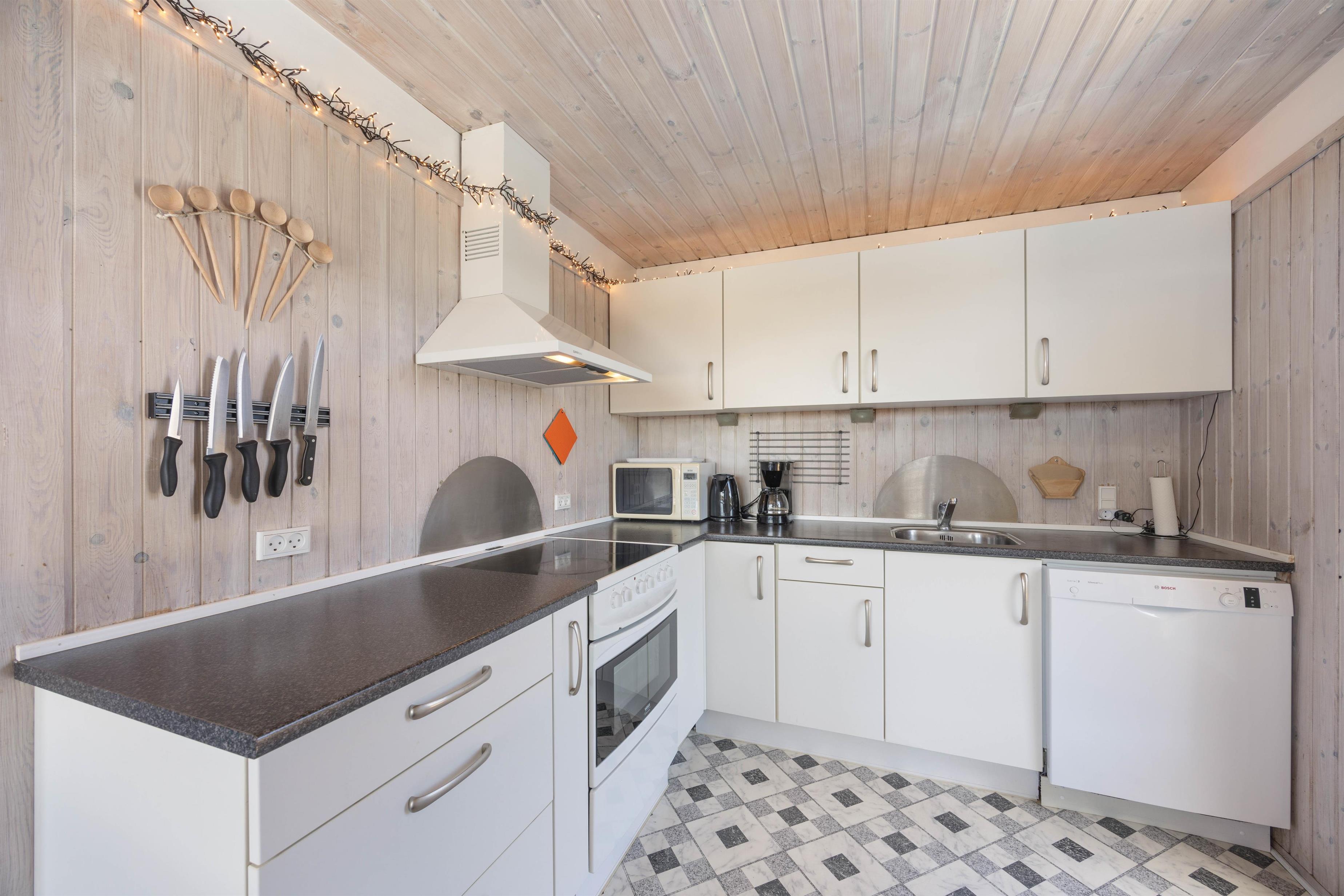 Dette feriehus udstråler hygge. Husets hjerterum er den lyse stue med gulvtæppe, som desuden ligger i forbindelse med det funktionelle køkken. Her er god plads hele familien, hvad end I vil hygge jer med en god middag, et brætspil eller holde filmaften med popcorn. Eller sid foran pejsen med en kop varm kakao og en god bog, imens brændeovnen knitrer og skaber varme og glæde.