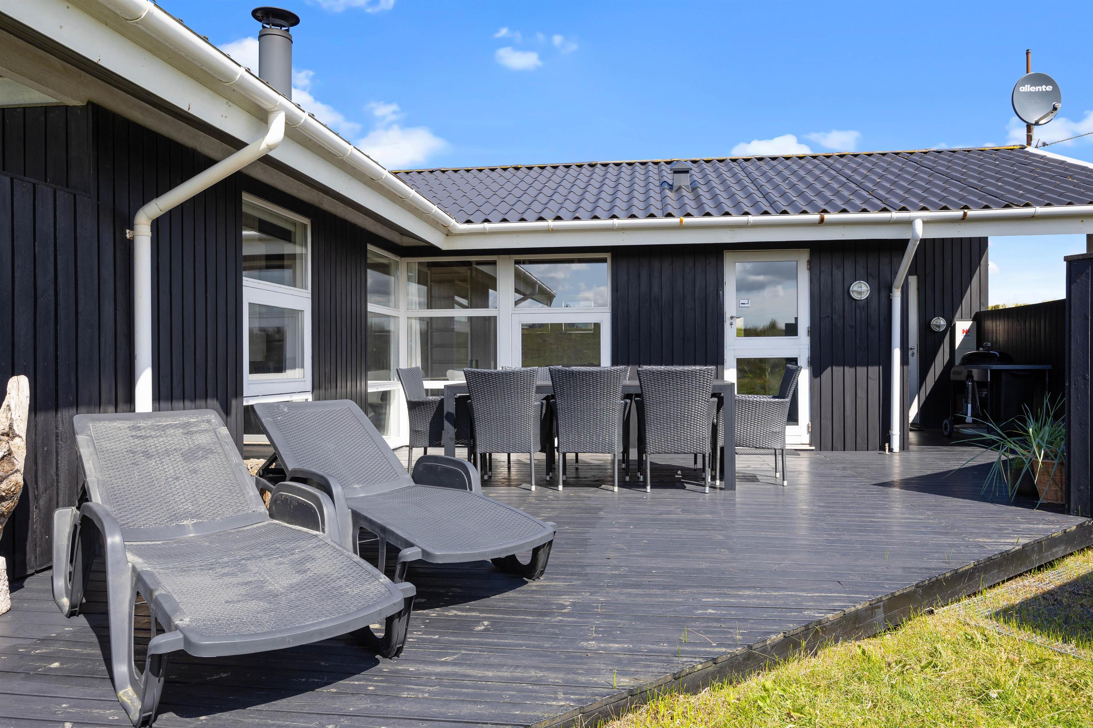 Fra stuen er der udgang til den skønne, store træterrasse. Terrassen er sydvendt og delvist overdækket, så I kan sidde i læ og nyde en lækker brunch med friske rundstykker fra den lokale købmand. Feriehuset har en kul-grill samt havemøbler og liggestole, så I har mulighed for at nyde solstrålerne. Mens der slappes af på terrassen, kan børnene lege på gyngerne. Fuldend aftenen sammen med familien og en lækker sommermenu tilberedt på grillen.