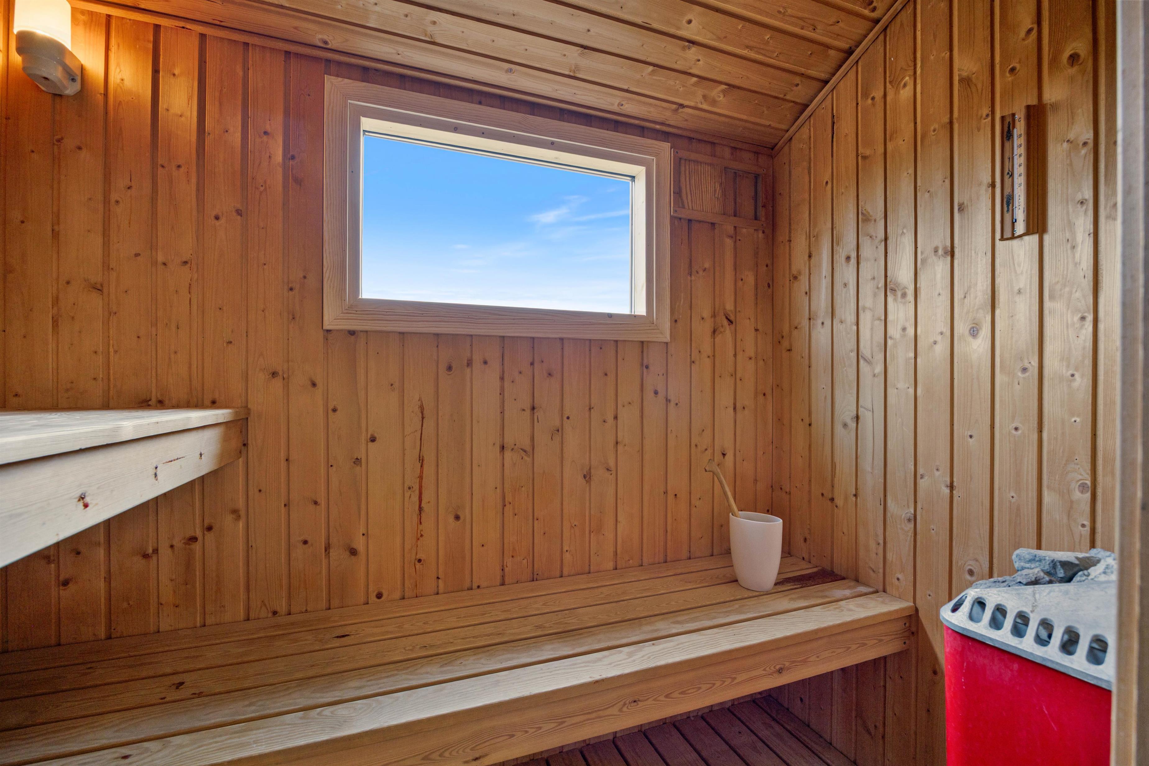På badeværelset indbyder sauna og boblebadet til en afslappende aften efter en lang dag ved stranden. Her kan I glemme hverdagen for en stund, og på badeværelset er der installeret gulvvarme, så I ikke fryser fødderne om morgenen.