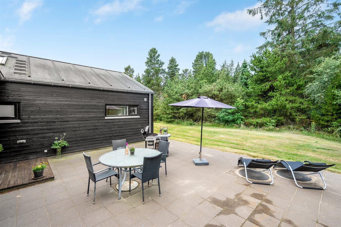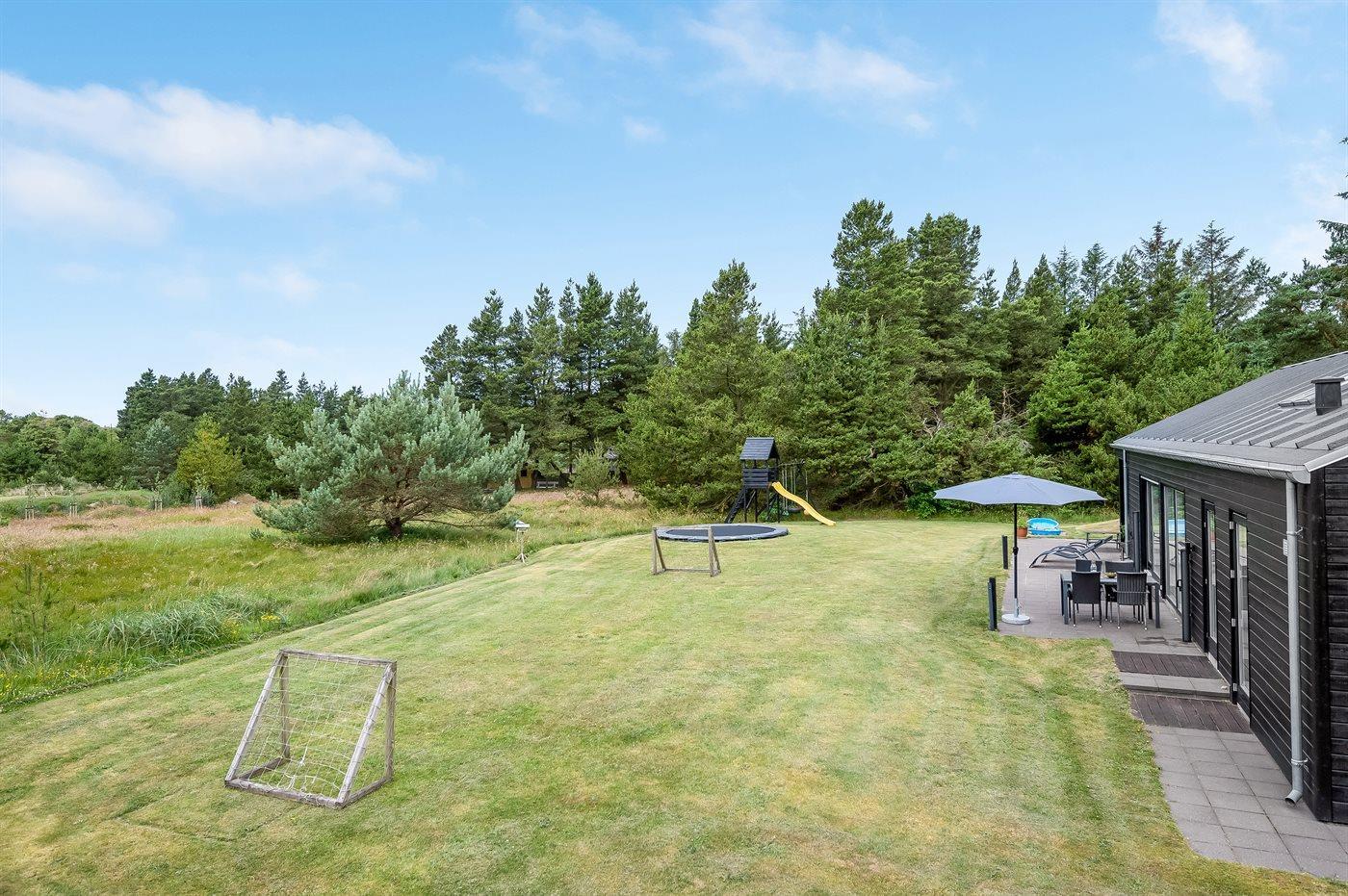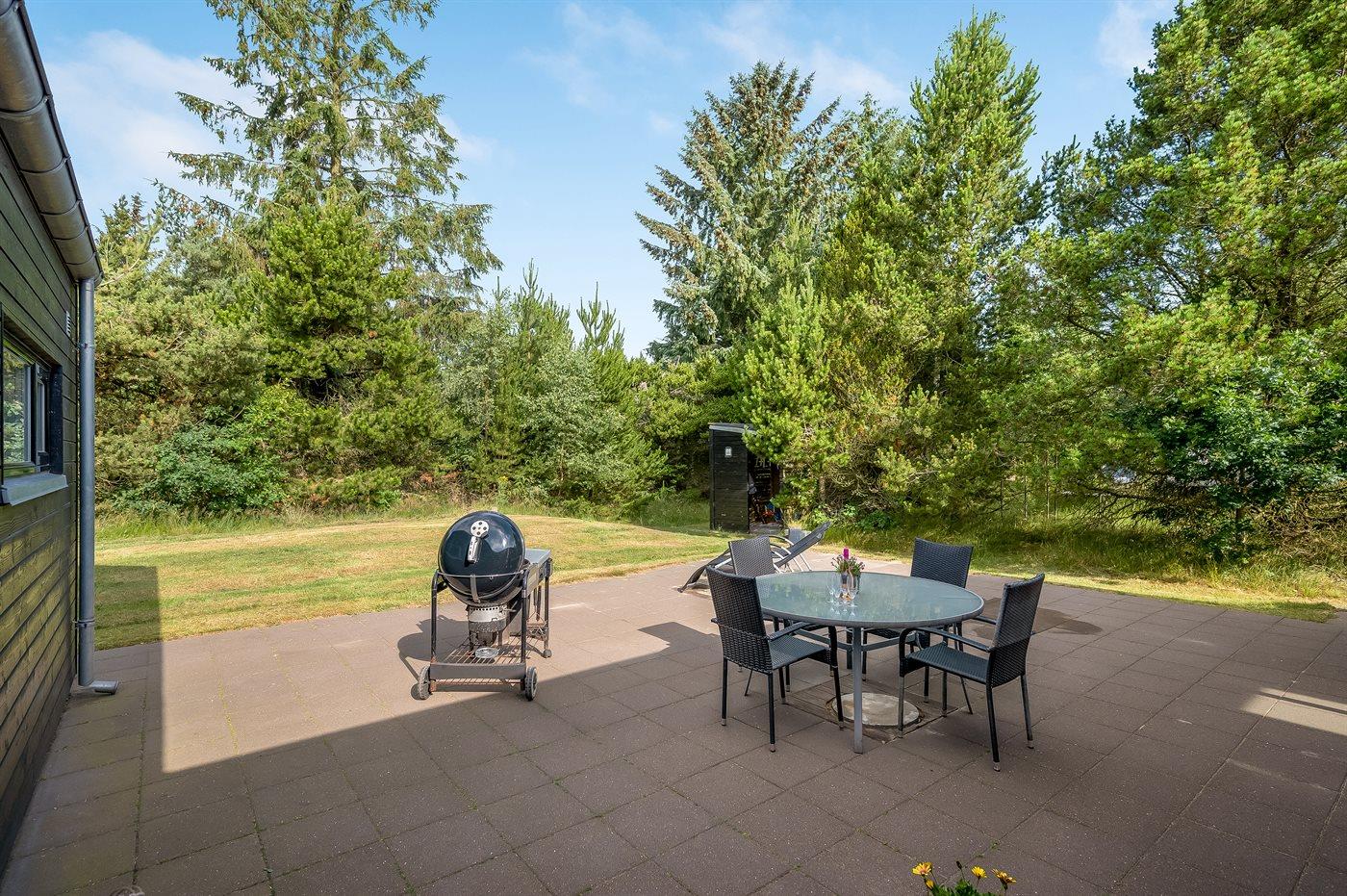 Sommerhuset er beliggende på en 1500 m² stor naturgrund. Der er 2000 m til havet. Nærmeste forretning er beliggende i en afstand af 1500 m. Til ferieboligen hører 90 m² terrasseareal, hvoraf 15 m² er overdækket, og der er grill til rådighed. Til de mindste er der flere aktivitetsmuligheder bl.a. trampolin, gynge, sandkasse og klatretårn med ruchebane, og der er fodboldmål. Parkering ved sommerhuset. Der findes ladestander type 2 til opladning af elbiler.