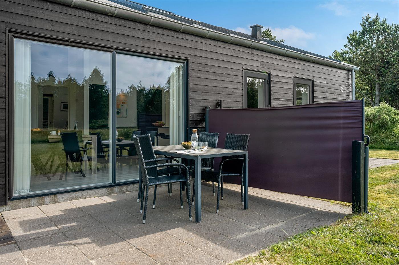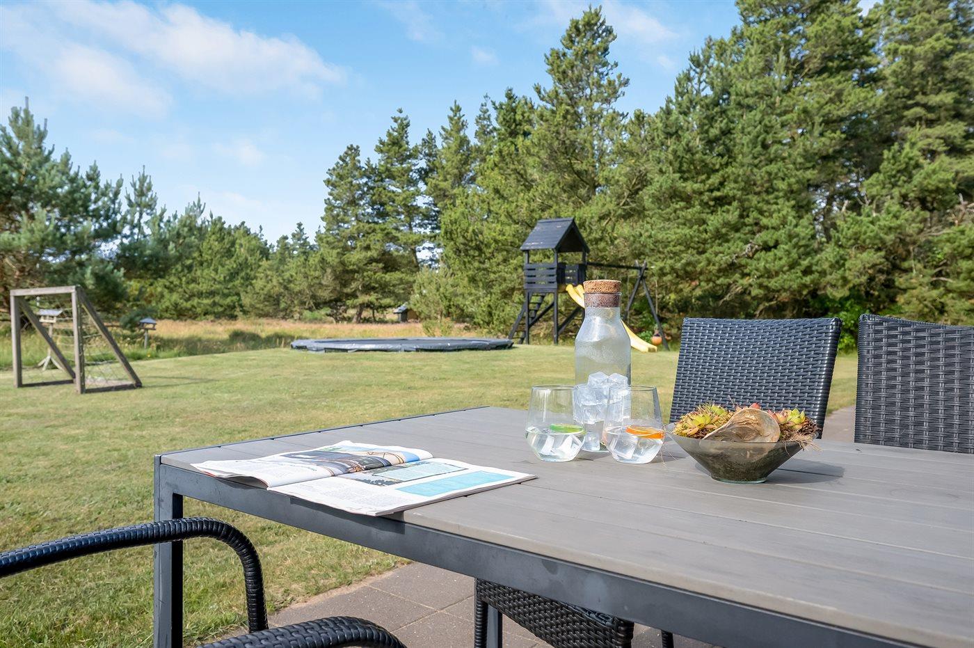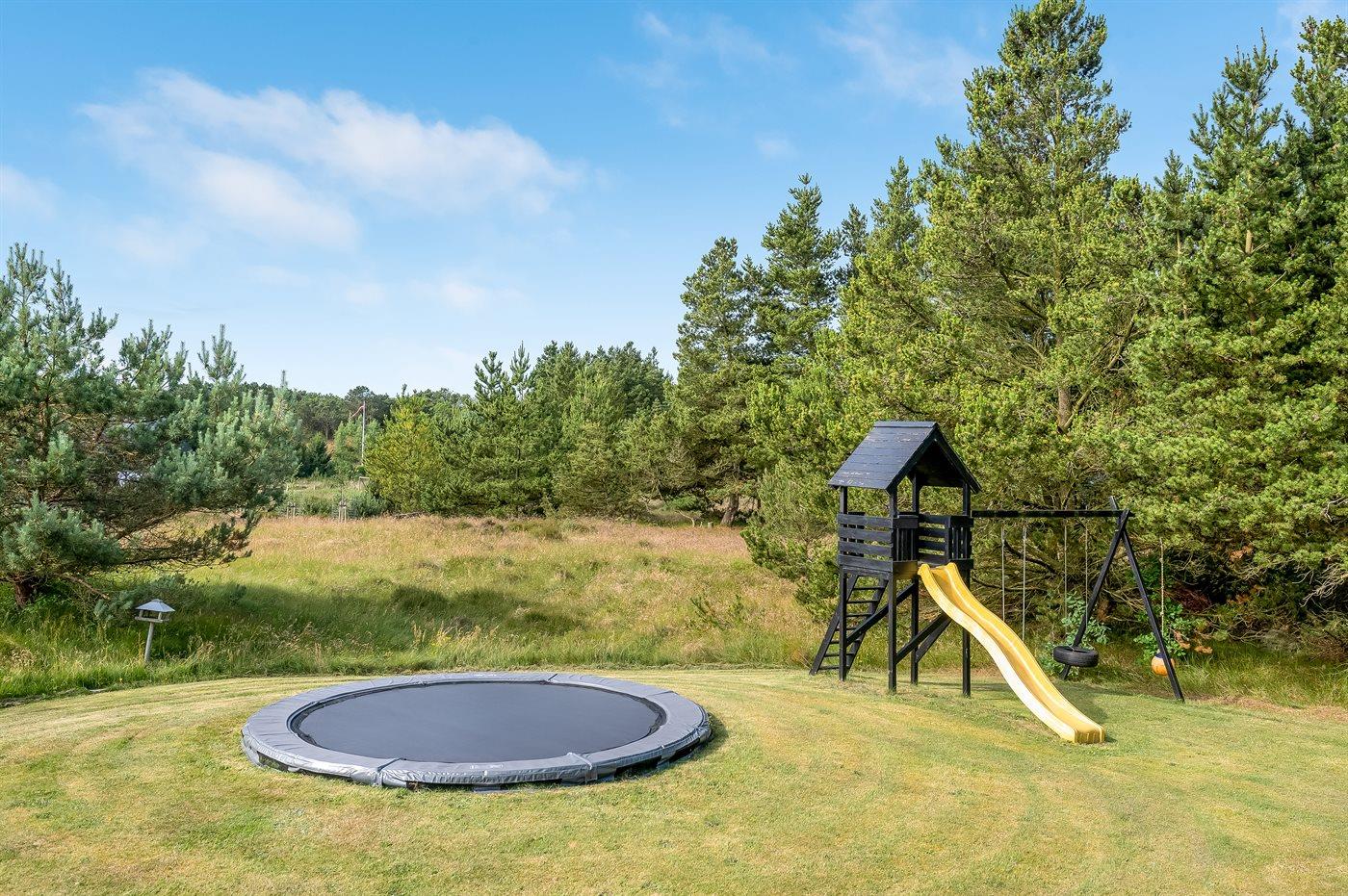 Sommerhuset er beliggende på en 1500 m² stor naturgrund. Der er 2000 m til havet. Nærmeste forretning er beliggende i en afstand af 1500 m. Til ferieboligen hører 90 m² terrasseareal, hvoraf 15 m² er overdækket, og der er grill til rådighed. Til de mindste er der flere aktivitetsmuligheder bl.a. trampolin, gynge, sandkasse og klatretårn med ruchebane, og der er fodboldmål. Parkering ved sommerhuset. Der findes ladestander type 2 til opladning af elbiler.
