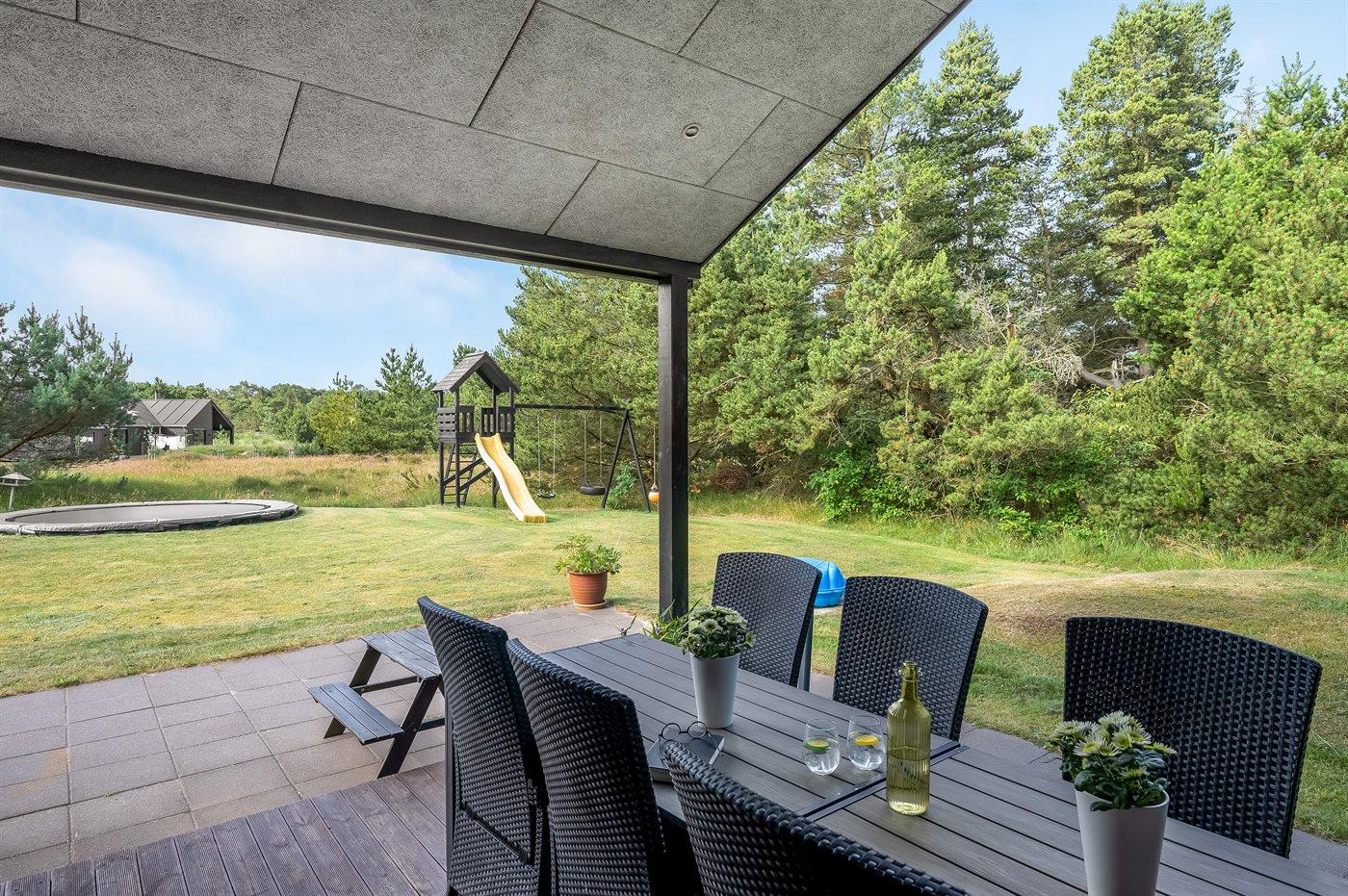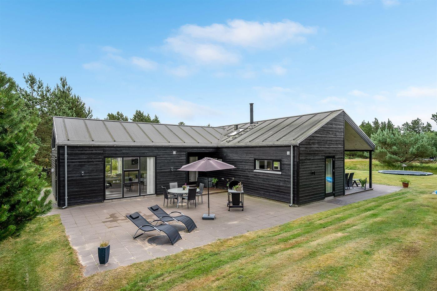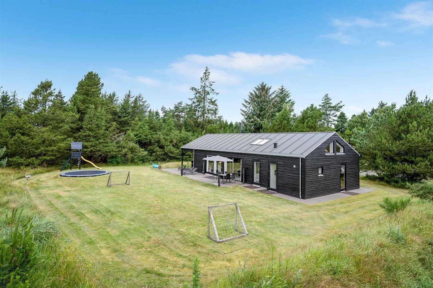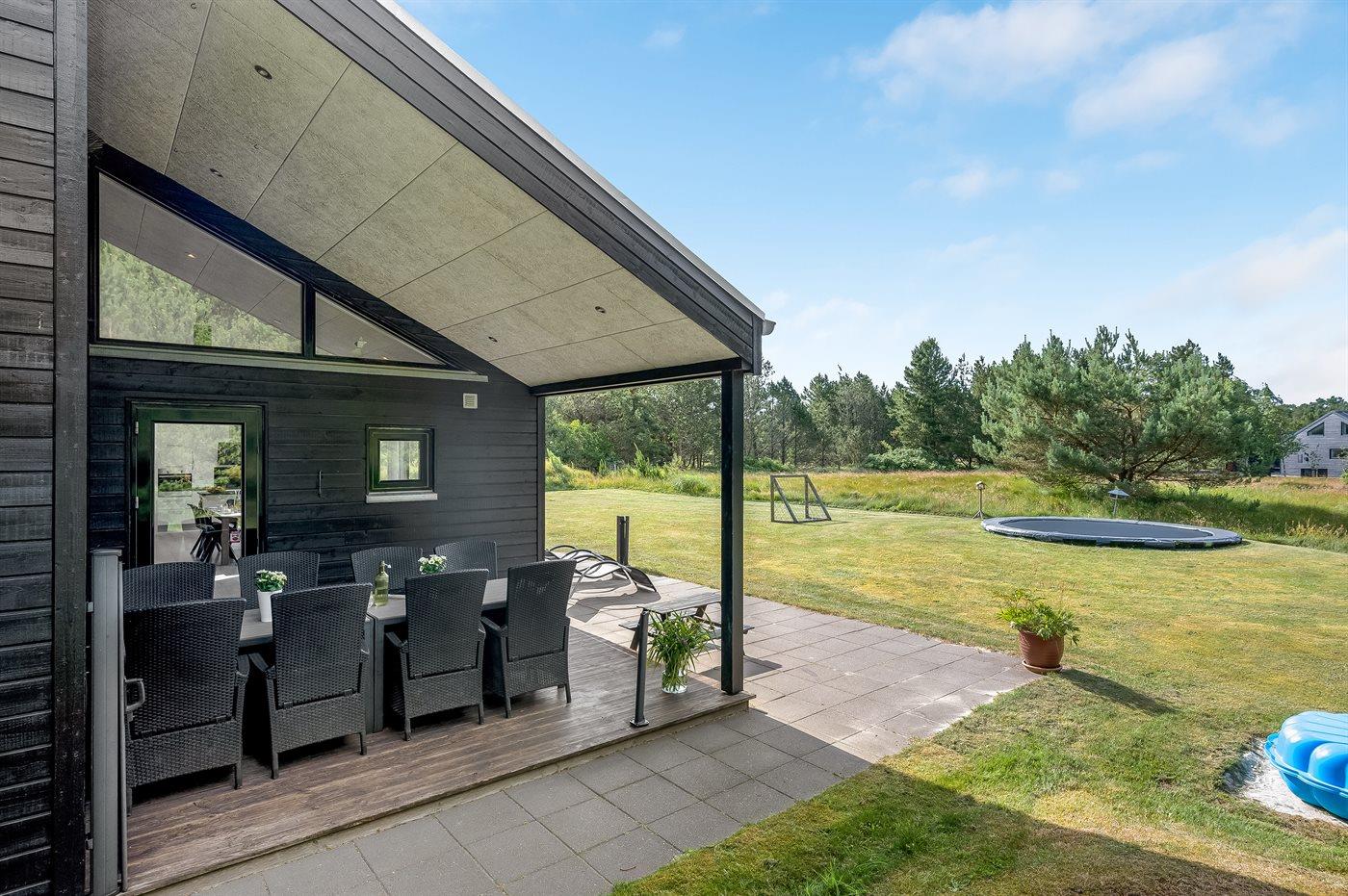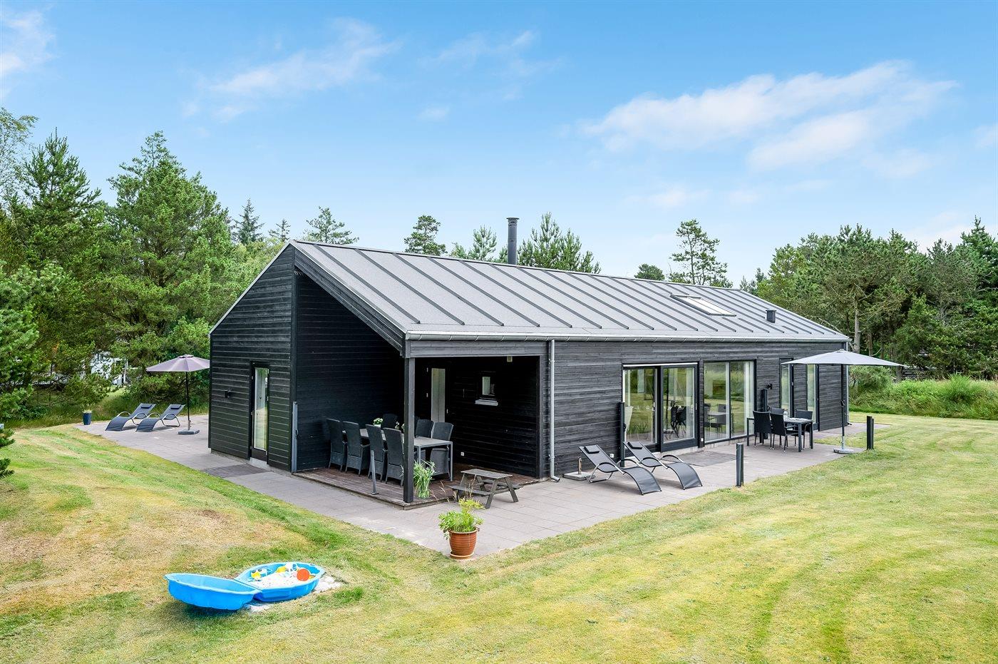 Sommerhuset er smagfuldt indrettet i moderne design. Beliggende på en stor naturgrund i et roligt og populært ferieområde, en frisk gåtur fra nok Danmarks bedste badestrand og det aktive butiksmiljø. Til huset hører dejlige terrasser, hvoraf en er overdækket, hvor I kan slappe af med en god bog eller nyde et måltid i det fri. Børnene er der også tænkt på, da der findes gode legeredskaber på grunden. Alt i alt et skønt sommerhus til en vellykket ferie!