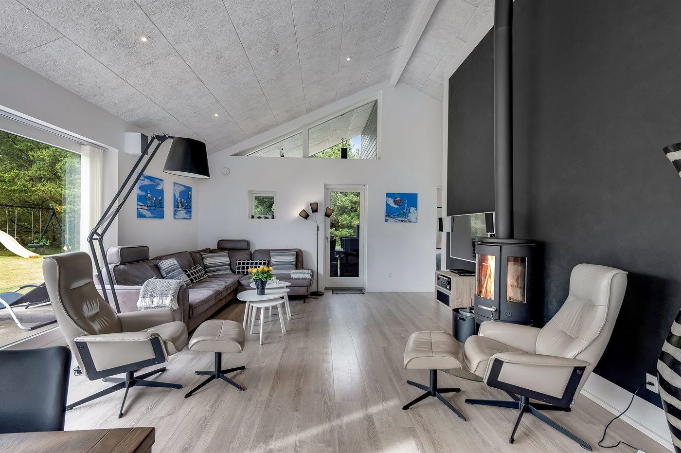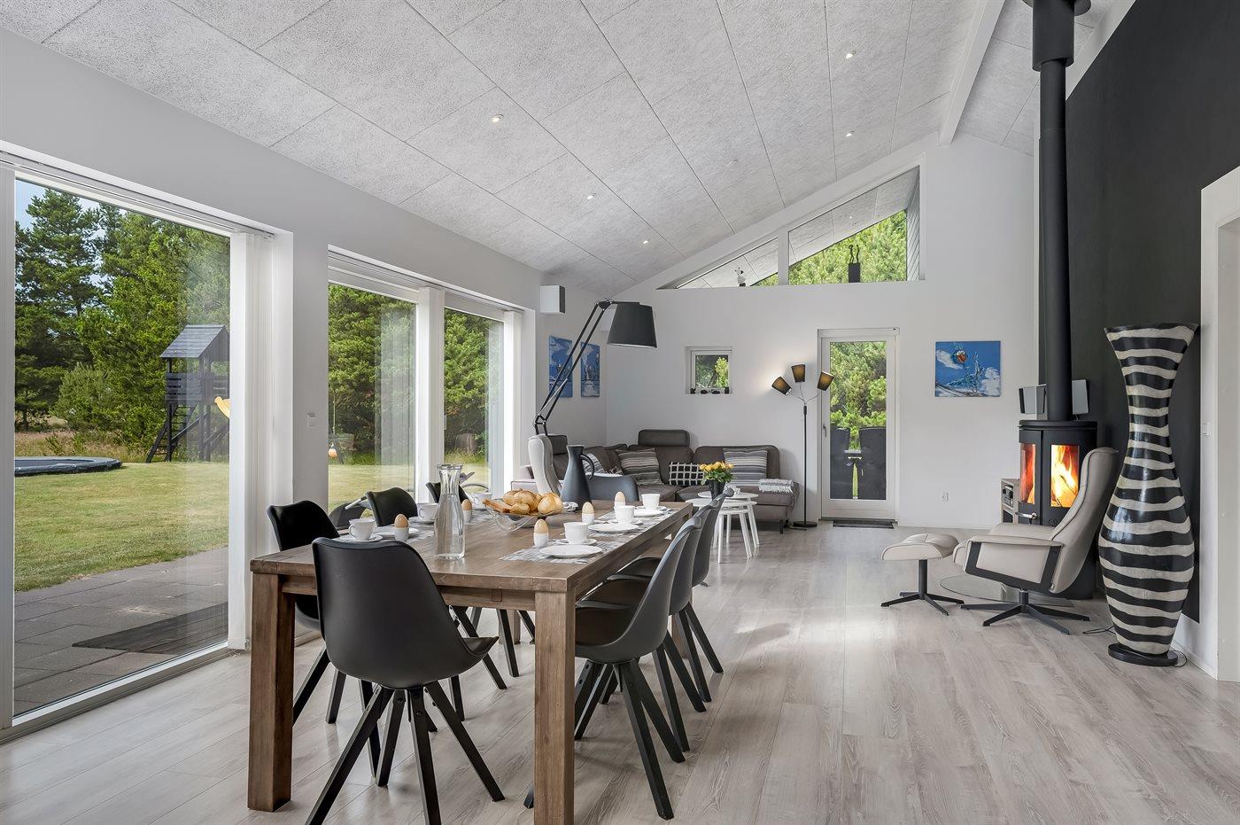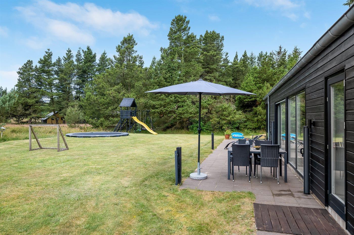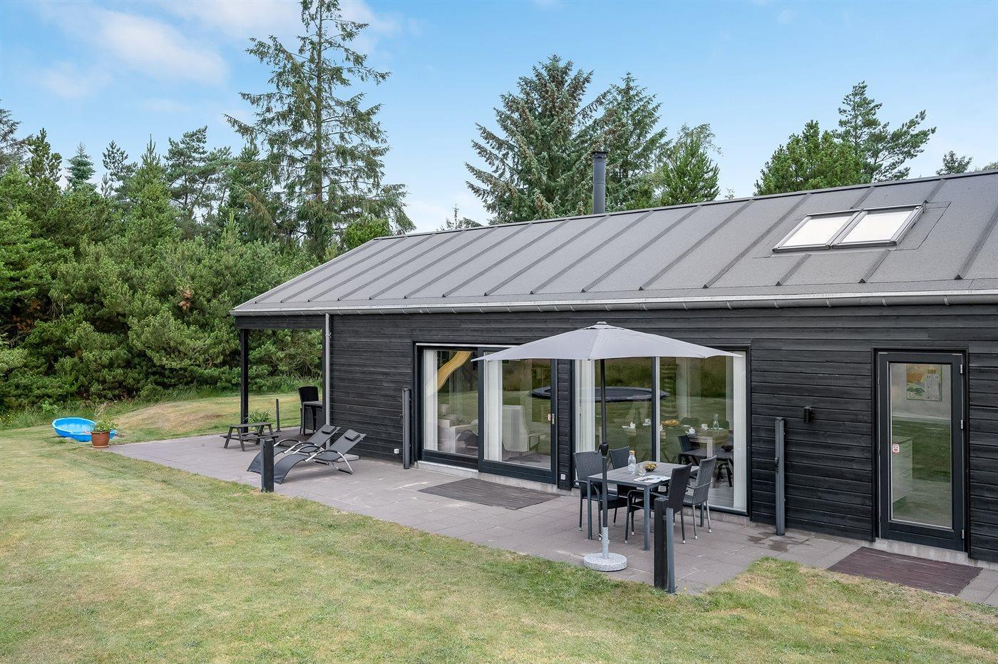 Sommerhuset er smagfuldt indrettet i moderne design. Beliggende på en stor naturgrund i et roligt og populært ferieområde, en frisk gåtur fra nok Danmarks bedste badestrand og det aktive butiksmiljø. Til huset hører dejlige terrasser, hvoraf en er overdækket, hvor I kan slappe af med en god bog eller nyde et måltid i det fri. Børnene er der også tænkt på, da der findes gode legeredskaber på grunden. Alt i alt et skønt sommerhus til en vellykket ferie!