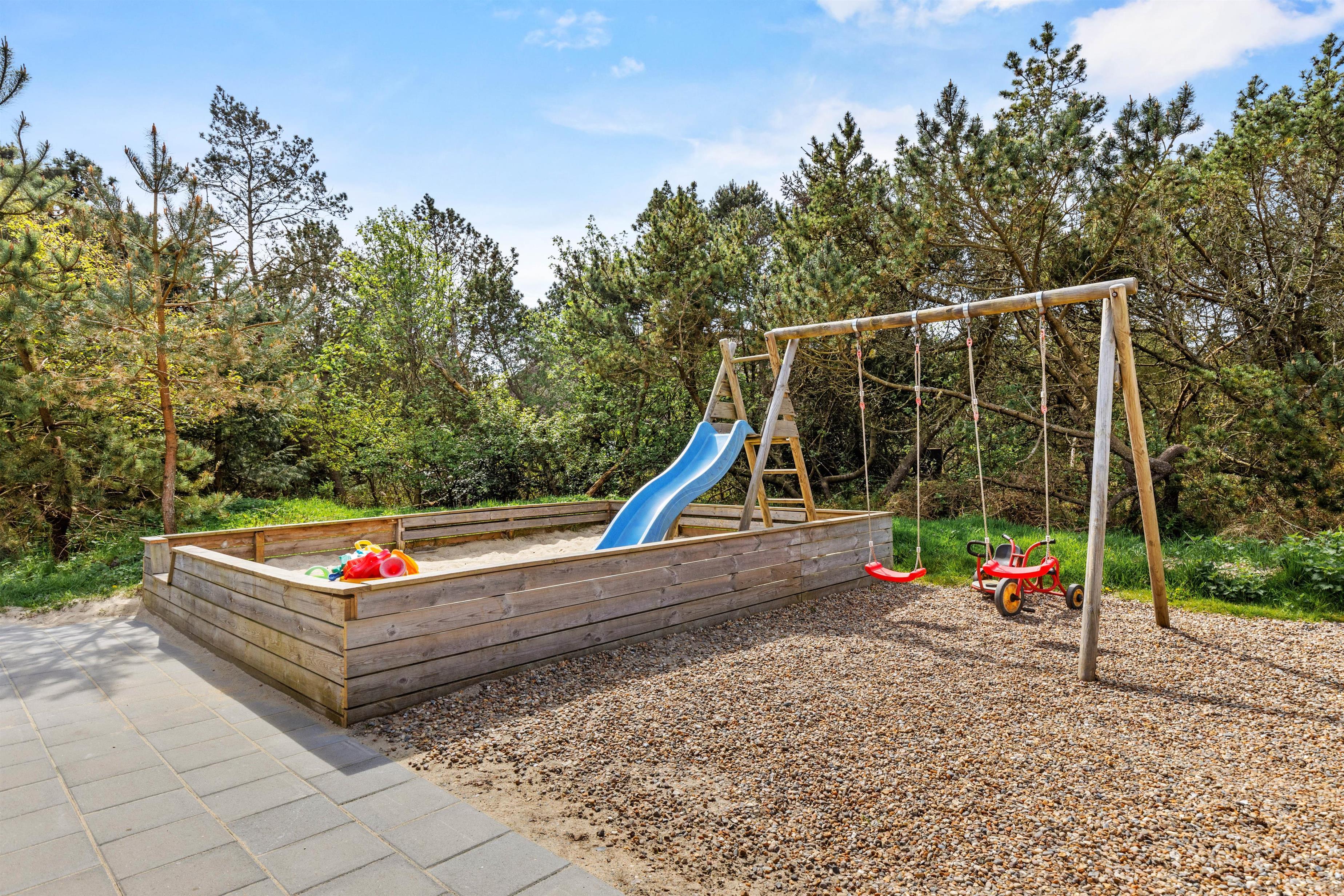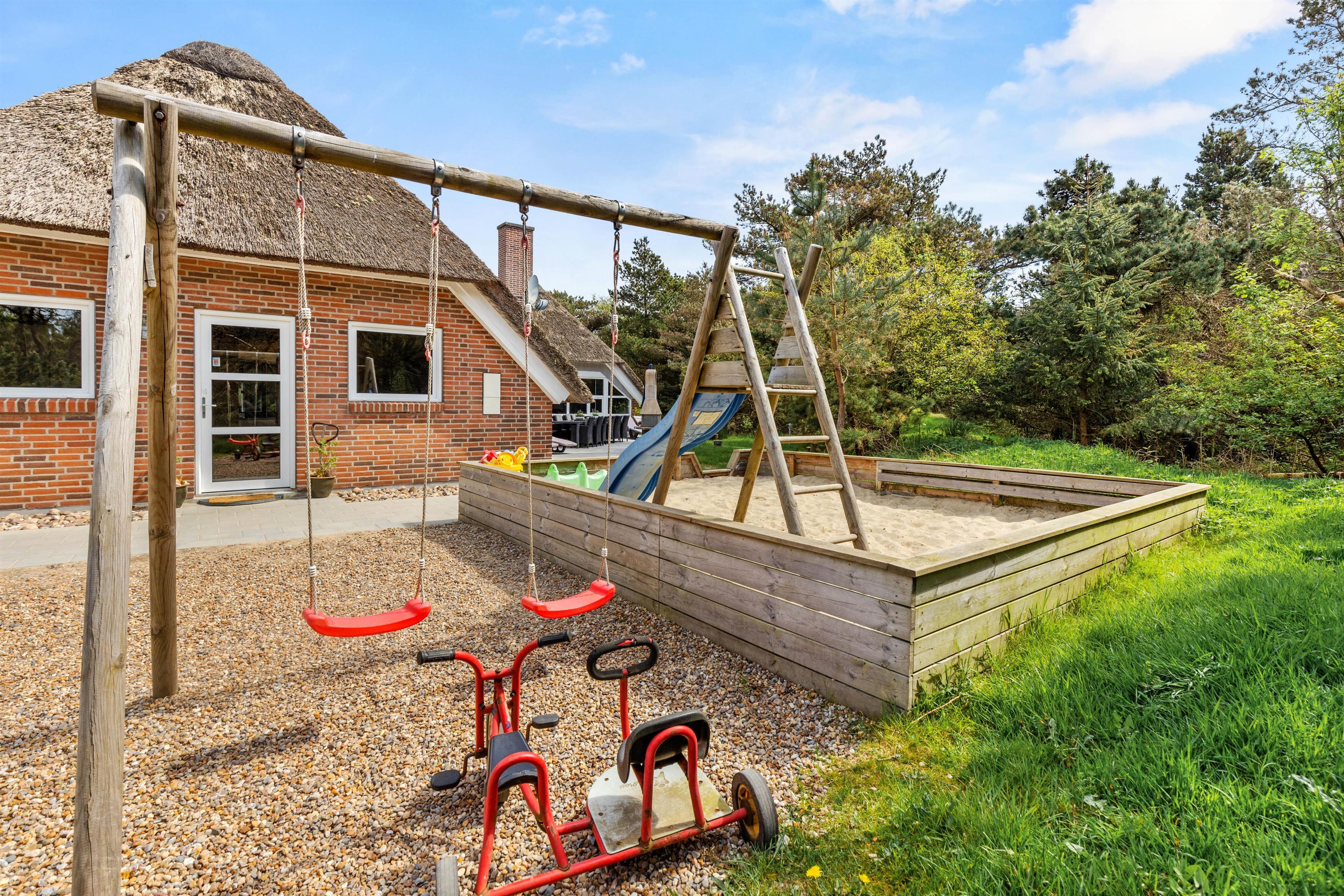 Det stråtækte feriehus i Vestermarken 5B ligger på en stor naturgrund, ugenert og omgivet af løv- og nåletræer, og I kan slappe af i de komfortable havemøbler og liggestole på den åbne terrasse, mens børnene leger på gyngen, rutsjebanen og i sandkassen.